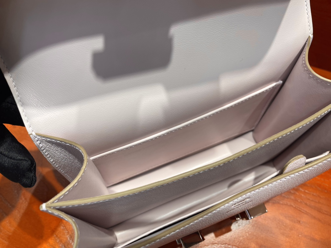 HERMÈSの「Chevre Mysore」シリーズより、インド産高級山羊皮を使用したエレガントなカードケース。Mauve pale(淡藤色)の優雅な色調が特徴で、10.5x7cmのコンパクトサイズ。表面に施された微細な粒状テクスチャーが上質な光沢を放ち、軽量ながら高い耐久性を実現。内側には複数のカードスロットを配置し、鍍パラジウムのスナップボタンで確実に閉じます。ビジネスからカジュアルまで幅広いシーンに対応する、洗練されたデザインです。