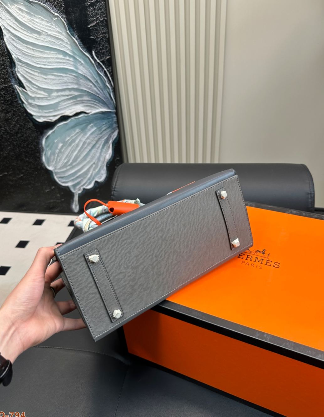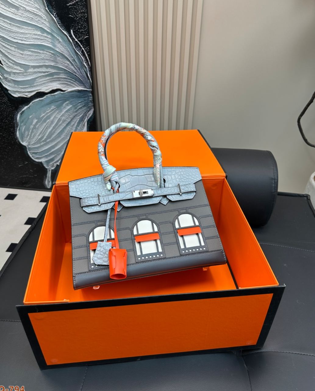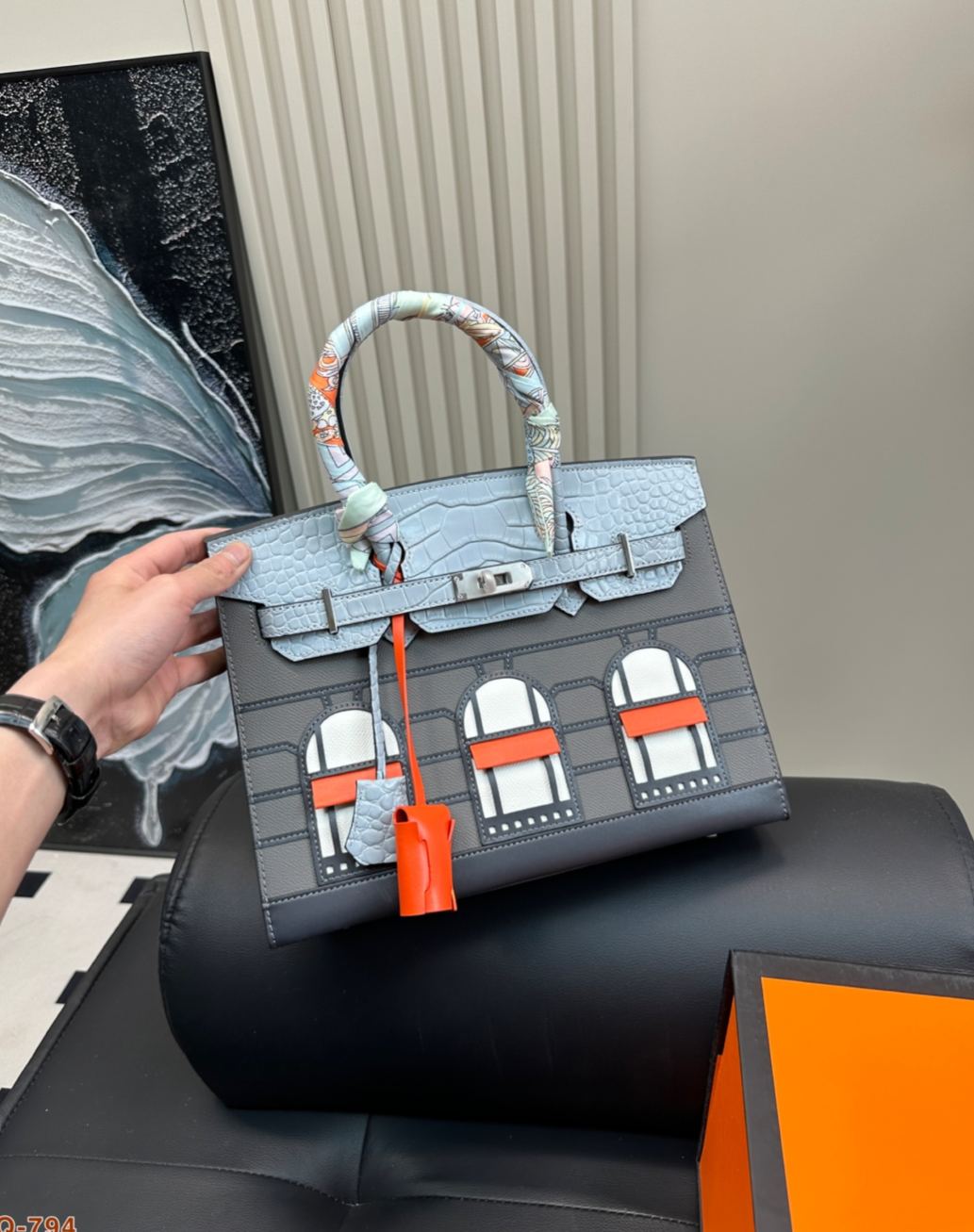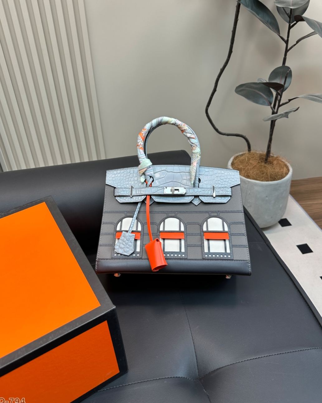 2019年に発表された限定モデルで、パリ・フォーブール通り24号店の外観をモチーフにした「家型」デザインが特徴。トップに短吻ワニ革、ボディにマダム牛革を使用し、窓部分にはエプソム革を採用した多素材組み合わせ。20cmのミニサイズながら外縫い製法で立体感を強調し、シルバー金具とオレンジのアクセントがブランドのアイコン性を表現。4色展開されるカラーテーマ(昼/夜/深夜/初雪)ごとに異なる素材コンビネーションを採用
