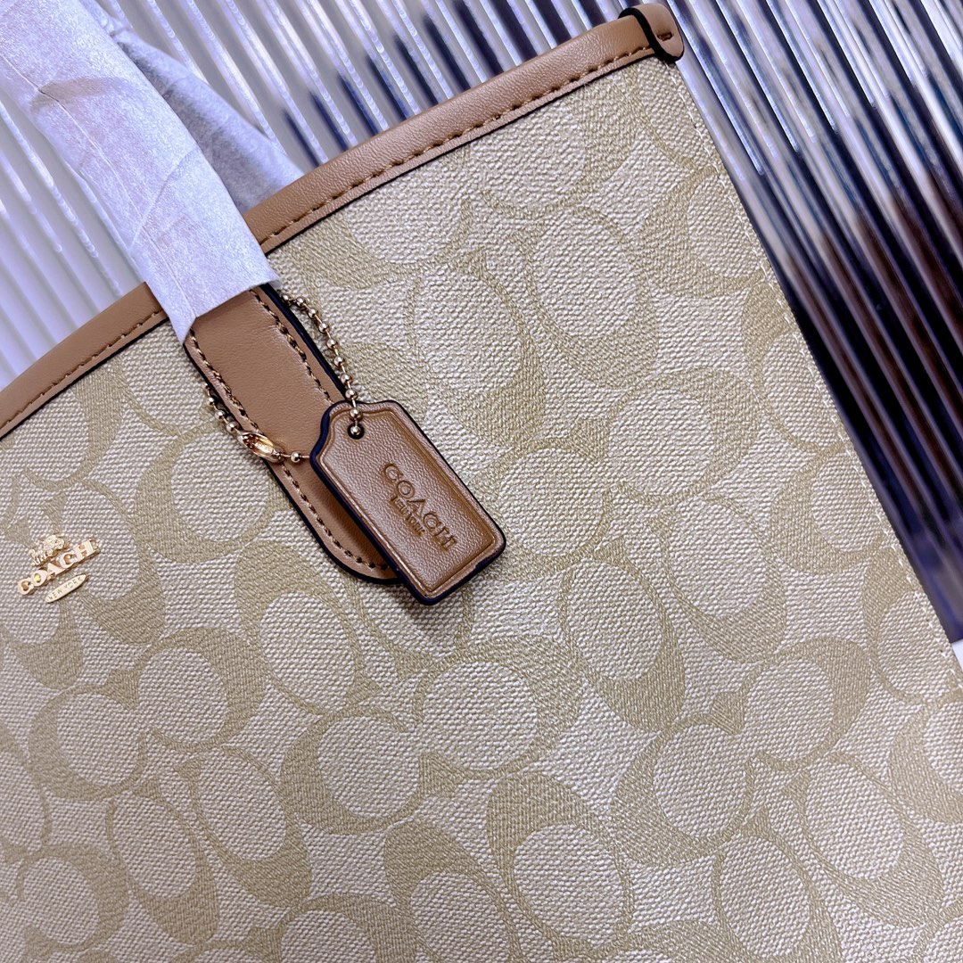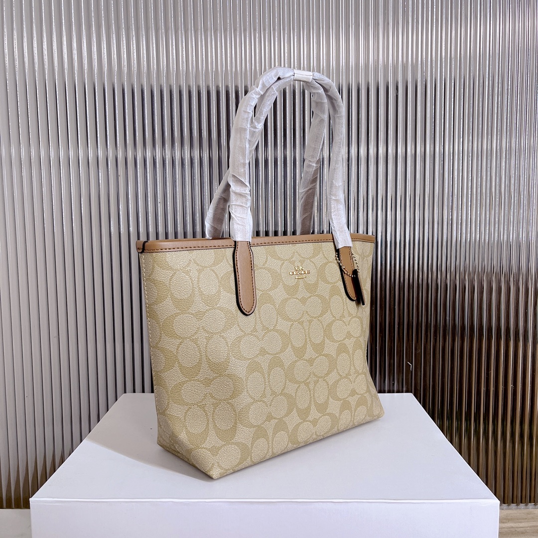 COACHの定番シリーズ「City」の小サイズトートバッグ57。約29x26x14cmのコンパクトボディながら、A4サイズの書類やタブレットを収納可能な大容量設計。クラシックなモノグラムプリントにCOACHのシグネチャーキャラクターをあしらい、上品で使いやすいデザイン45。軽量なPVCコーティングキャンバス素材を使用し、日常使いに最適。内側には便利なポケットを配置し、小物整理も簡単です。