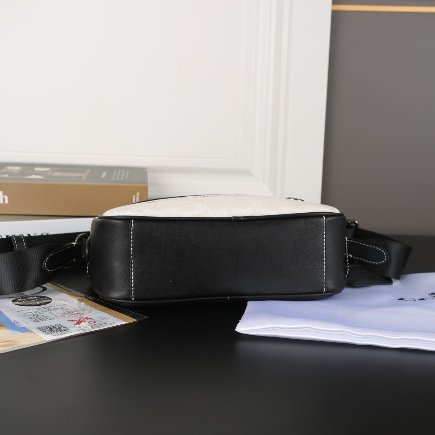 COACH「Graham 23」は、ブランドのアイコニックなシグネチャー老花柄と小牛皮のコンビネーションが特徴的なカメラバッグ。23x15x7cmのコンパクトサイズで、スマートフォンや財布などの日常必需品を収納可能。メインコンパートメントはジッパー式でセキュリティ性が高く、前面にスナップボタン付きポケットを装備。黒xグレーの老花柄と茶系レザーの組み合わせが、カジュアルからビジネススタイルまで幅広くマッチ。調節可能なショルダーストラップで、斜め掛け・ショルダーの2WAY使用が可能。