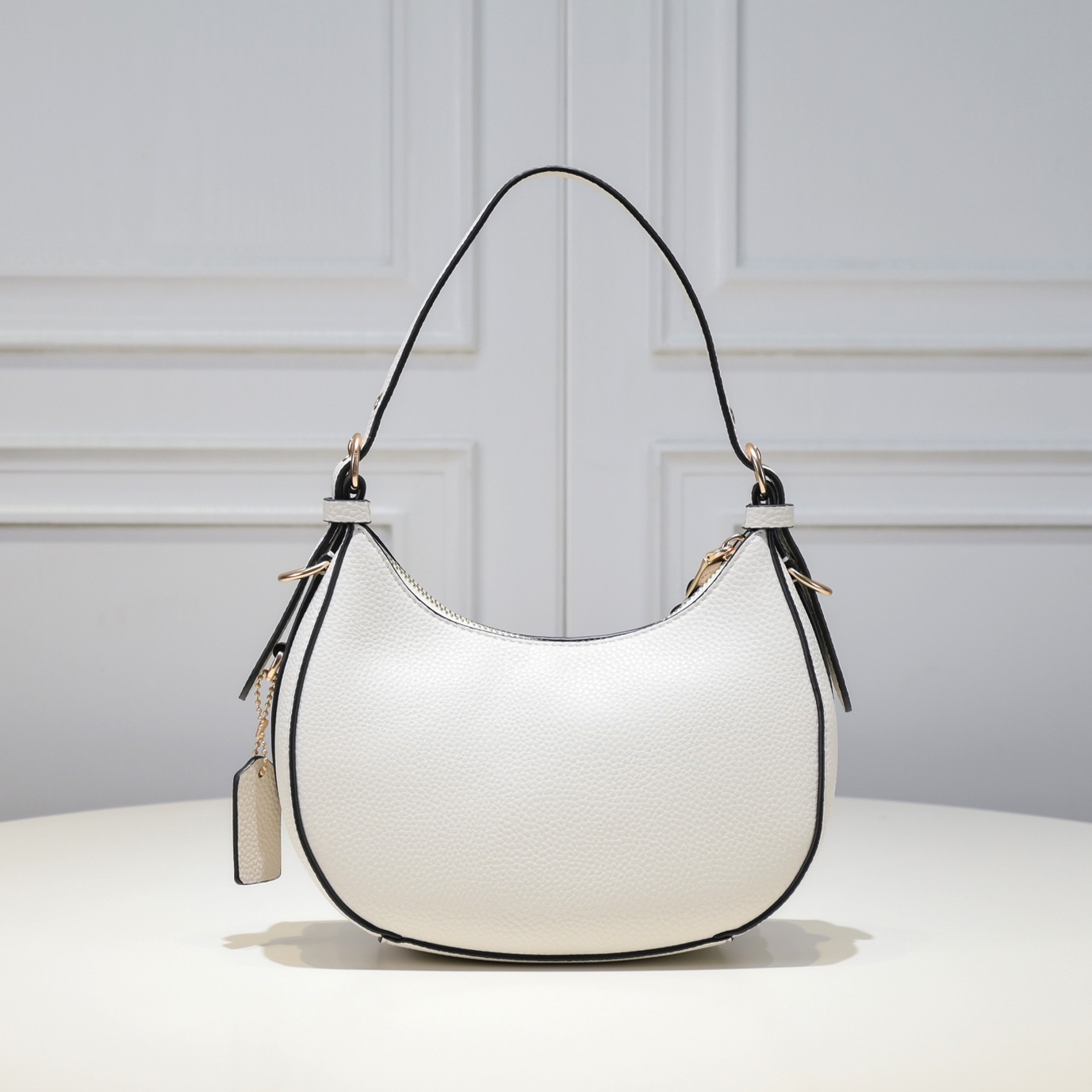 COACHのKleo Hoboは、ユニークな月牙形デザインが特徴的なアンダーアームバッグです。深みのあるカラーリングと高級感あふれる黄銅メタルチェーンが上品な雰囲気を演出。27cmx16cmx6.5cmのコンパクトサイズながら、スマートフォンや化粧品などの日常必需品を収納可能。取り外し可能なショルダーストラップ付きで、アンダーアームスタイルと斜め掛けの2WAYで使用できます。