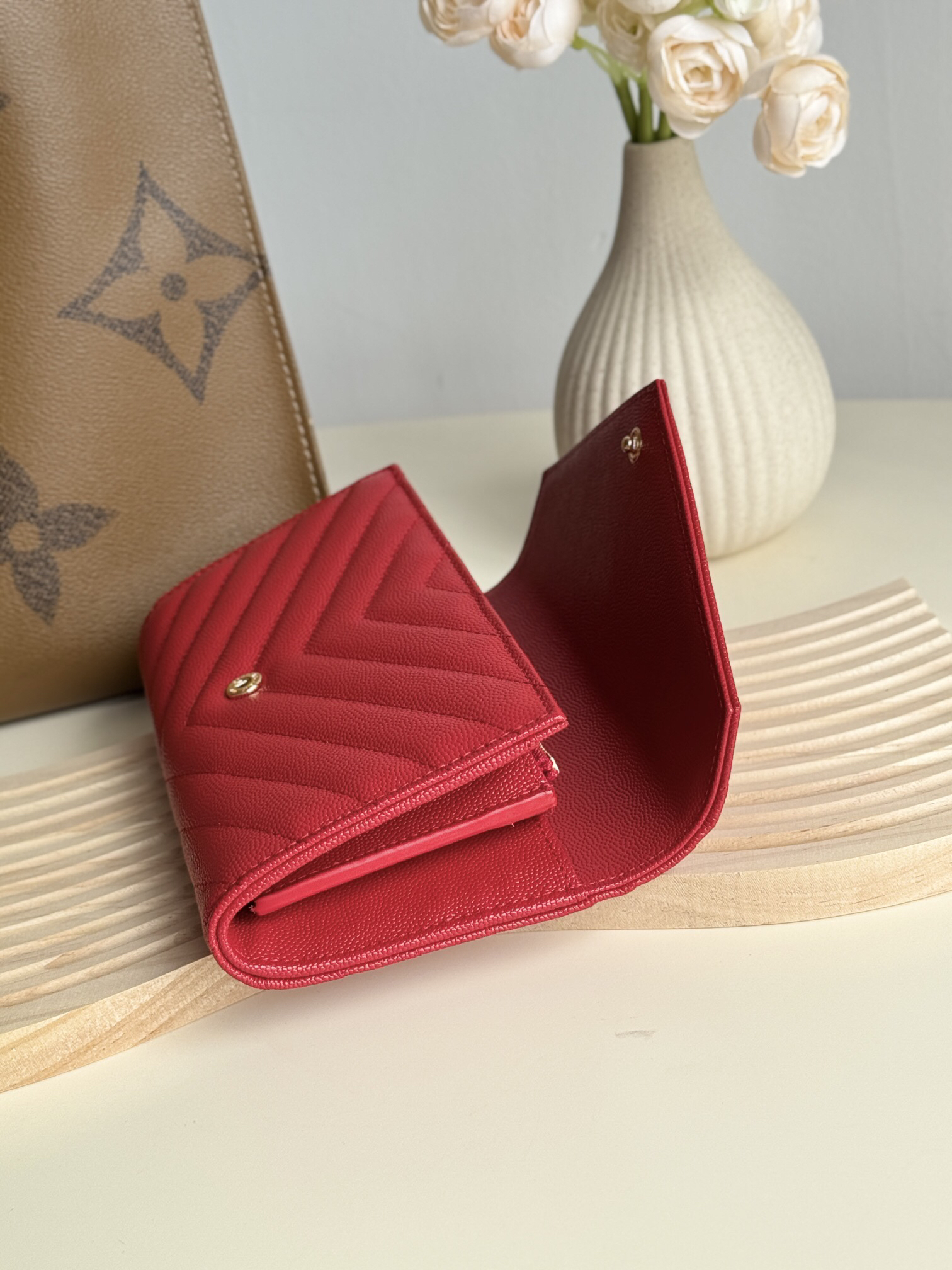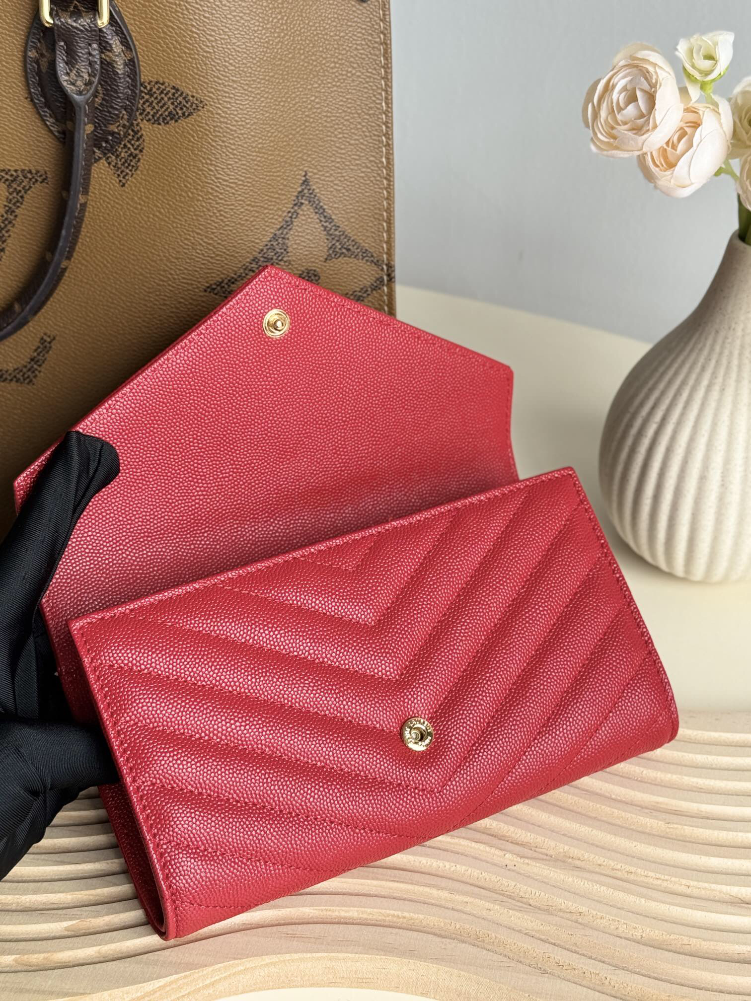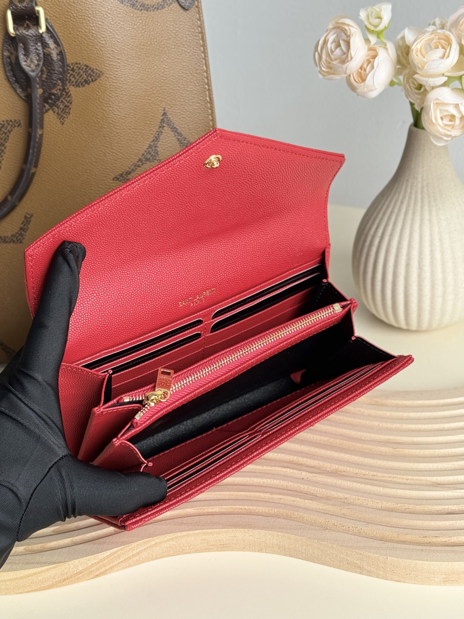 YSLの定番「フラップ エンヴェロープ」ウォレットが新たに登場。19x11x3cmのコンパクトサイズながら、12のカードスロット、4つの紙幣ポケット、ファスナー付き小銭入れを完備。輸入キャビアレザーの高級感ある質感と耐久性が特徴で、スマートフォンも収納可能な実用性。フラップ式のデザインがエレガントな印象を演出し、手に持ってもバッグに入れても使いやすいアイテムです。