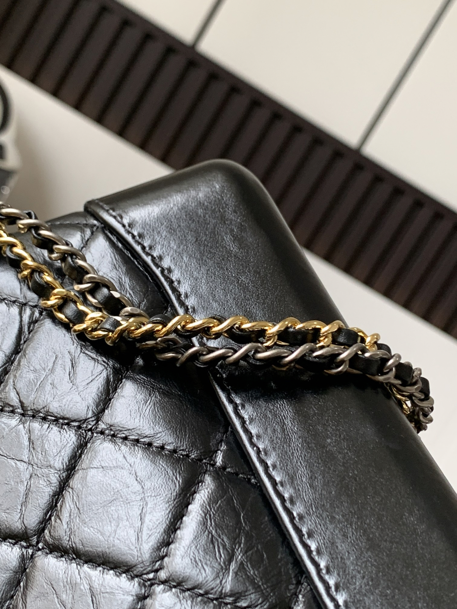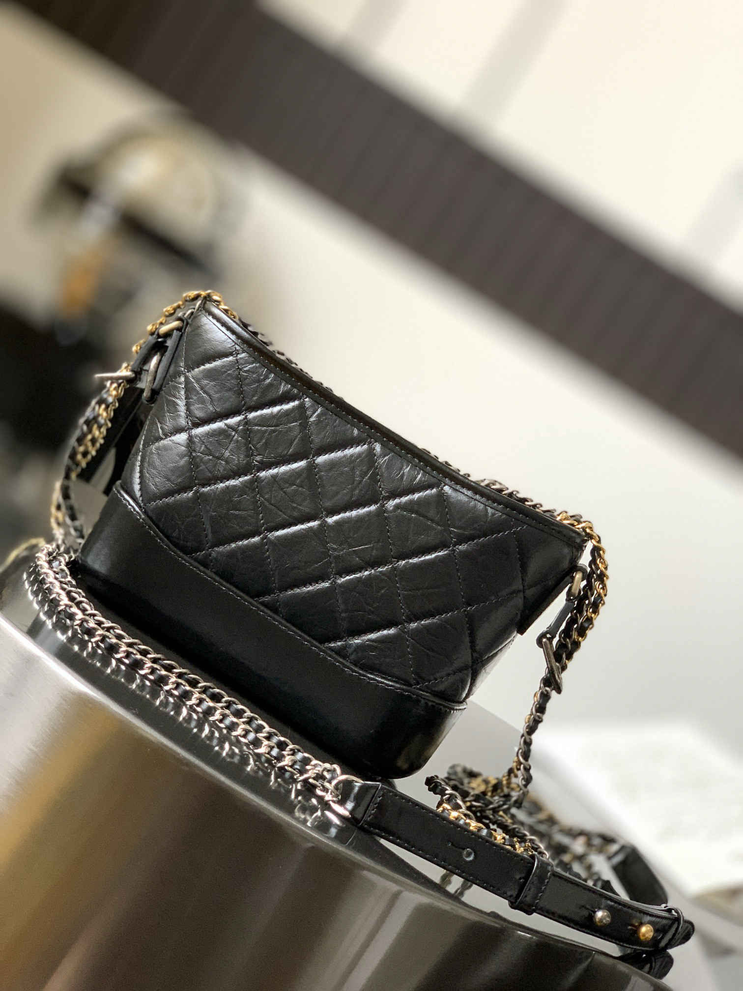 ゴールド&シルバーのダブルチェーンを組み合わせ、ショルダー、斜め掛け、クロスボディなど6通りのスタイリングが可能。 -