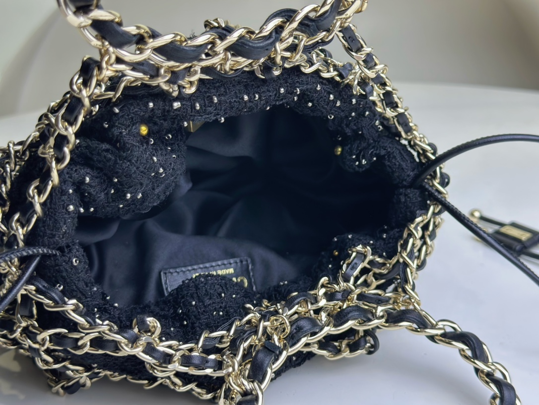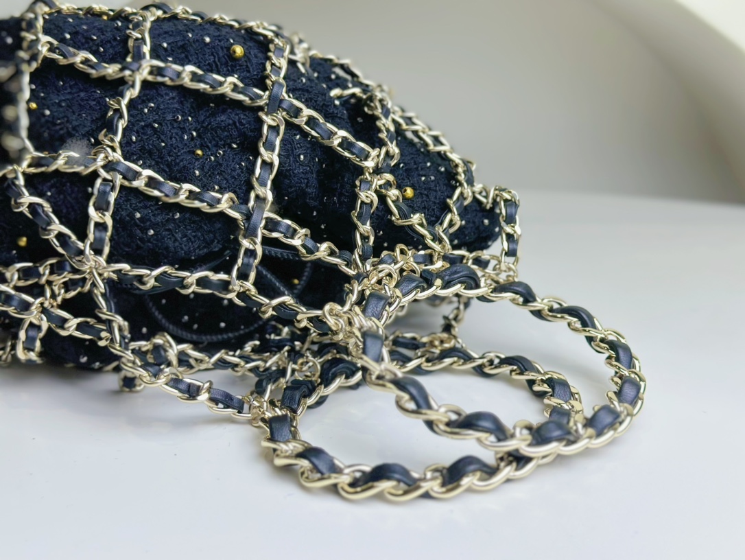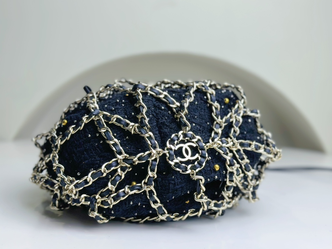 CHANELメティエダール(手工坊)シリーズの限定アイテムで、星をモチーフにした装飾が施されたユニークなネットバッグ。クラシックな皮穿ちチェーンを「網」に見立てたデザインで、ブラック&ゴールドの配色が高級感と個性を両立。軽量なネット構造ながら、スマートフォンやコンパクトなどの日常小物を収納可能。丸型ハンドルは真珠や金属で装飾され、手提げやショルダーとしても活用できる。