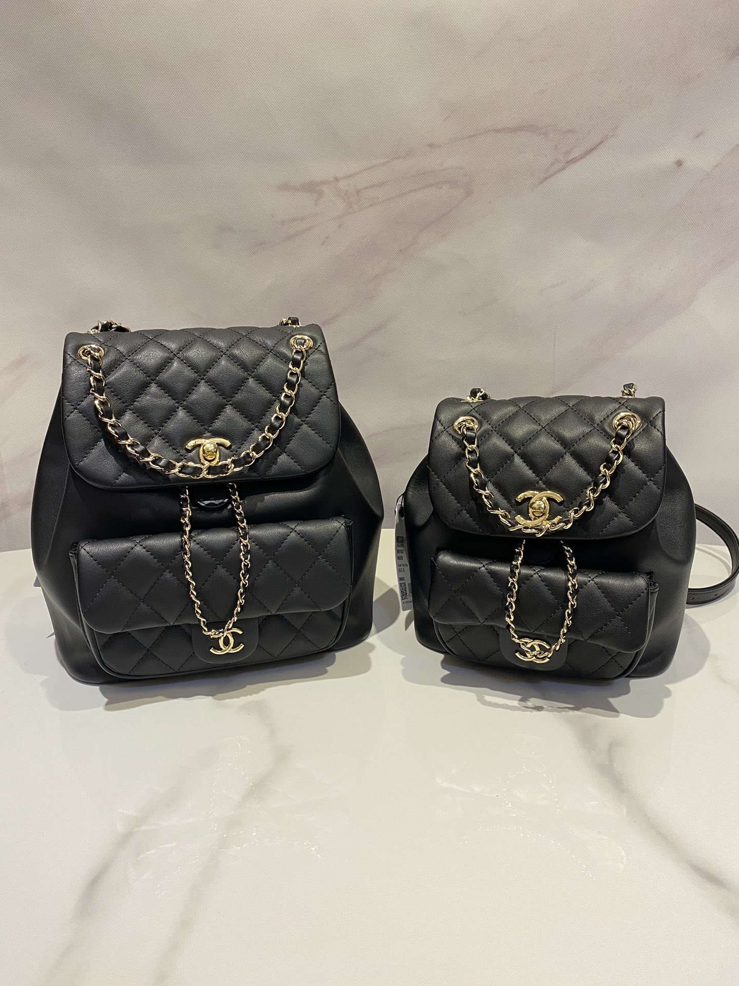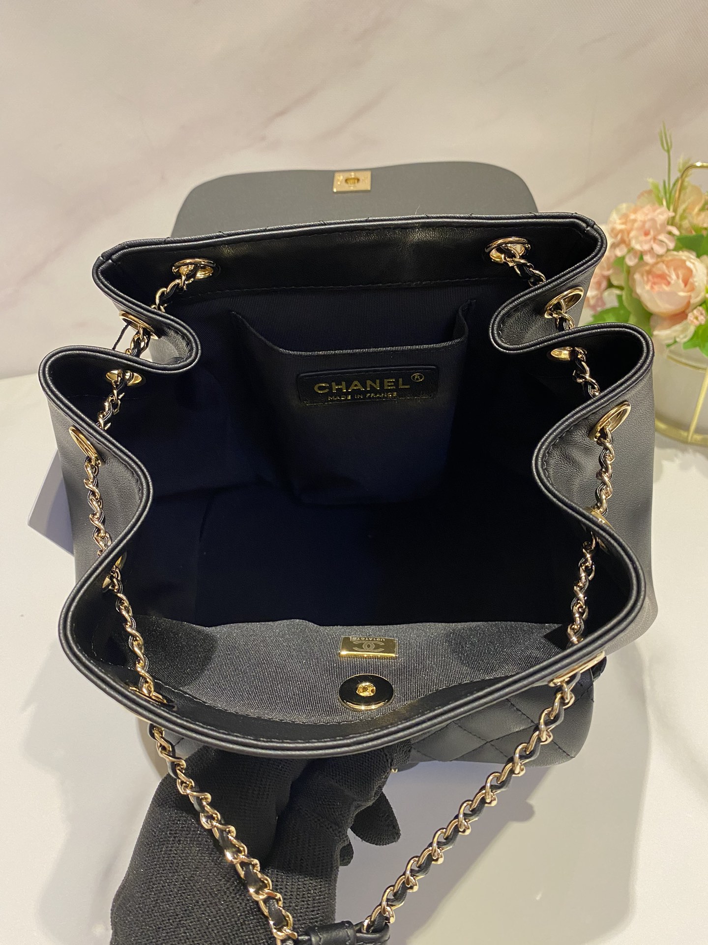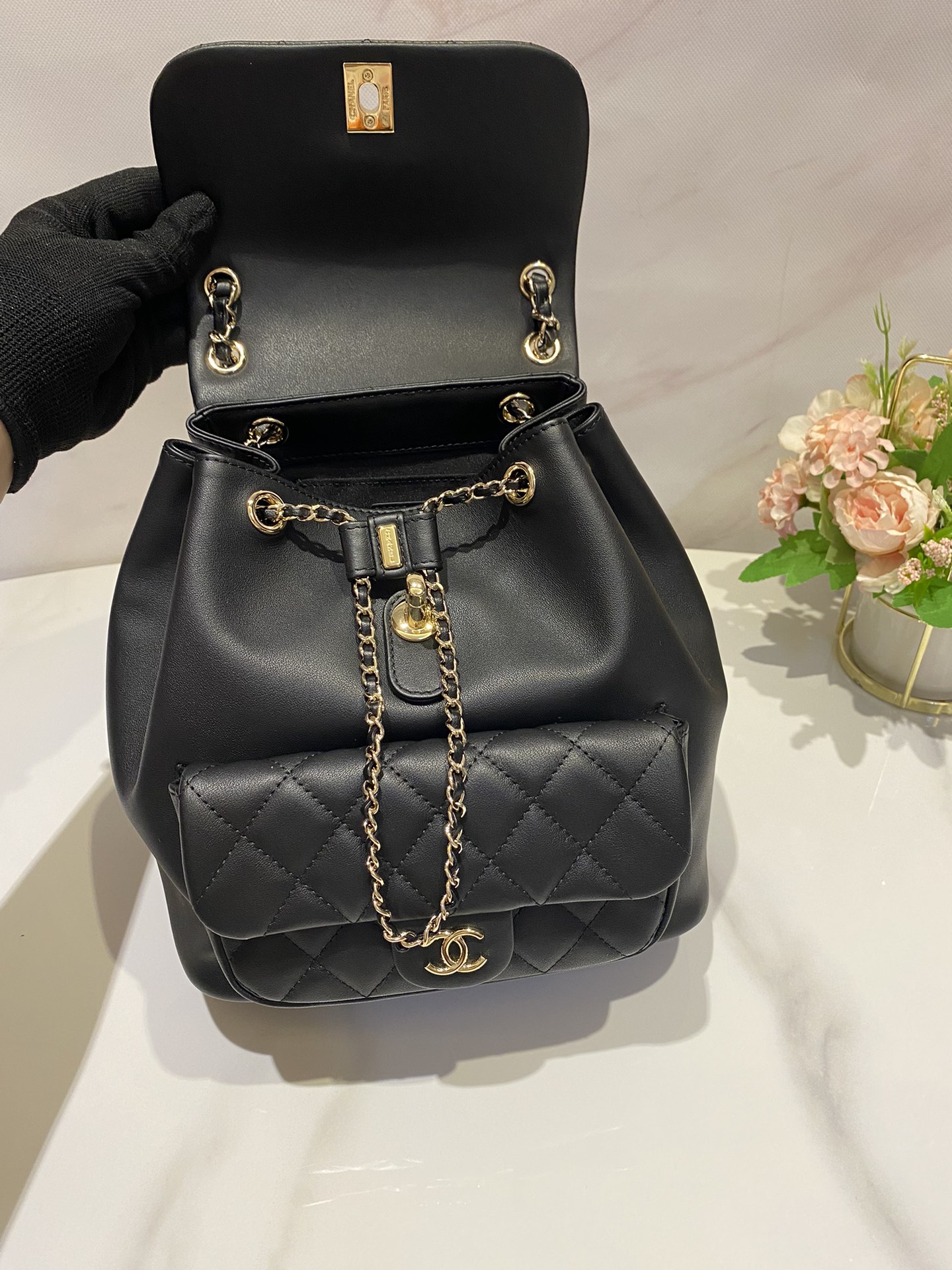 CHANEL 2021年クルーズコレクション(21P)で発表された限定デュマバックパック。28x20x8cmのコンパクトサイズながら、ラップトップ収納可能な実用性を備える。ブラックのキャビアレザーにゴールドハードウェアを組み合わせたクラシックなデザイン。背面にはパスポート収納可能な隠しポケットを装備し、旅行やビジネスシーンに最適。ショルダーストラップは着脱式で、ハンドバッグとしても使用可能。