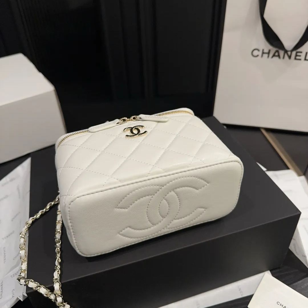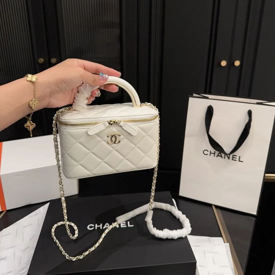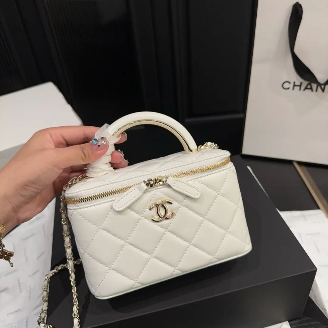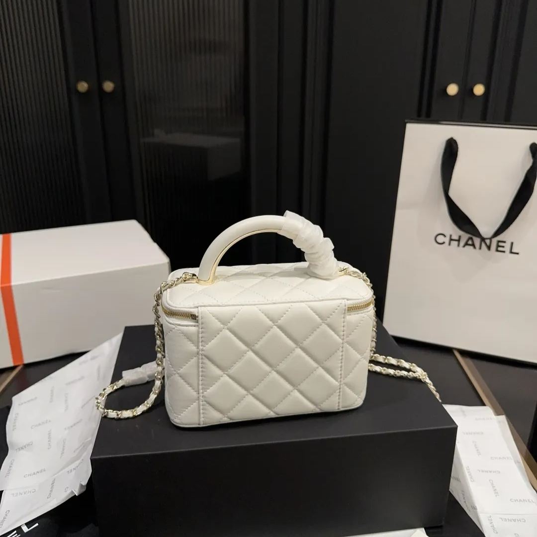 CHANEL 22Aハイジュエリーコレクションの象徴的なボックスバッグで、金属製ハンドルとクラシックな菱目縫いが特徴。高級小羊皮を使用し、19x13cmのコンパクトサイズながらスマートフォンやコンパクトを収納可能。ゴールドまたはシルバーのメタルハンドルは頑丈な構造で、従来のレザーハンドルよりも耐久性に優れる。ブラックカラーを基調とし、チェーンストラップ付きでショルダーとしても使用可能。