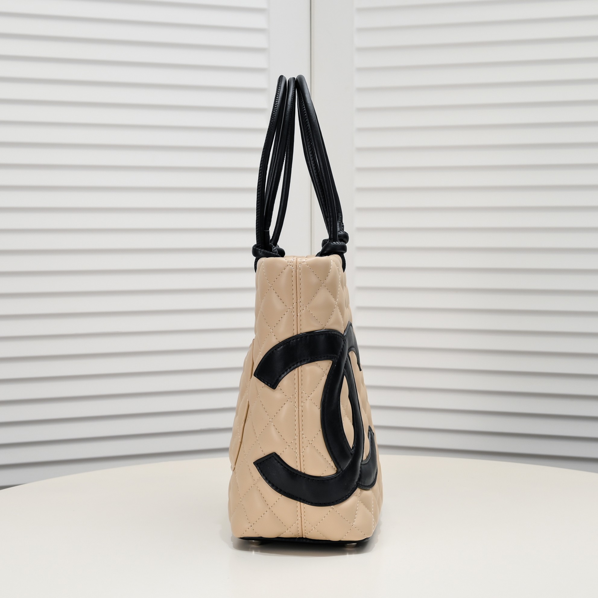 バスケット部分にブラックレザーの縁取りとショルダーストラップを組み合わせ、ラグジュアリーな印象を与えます。 -