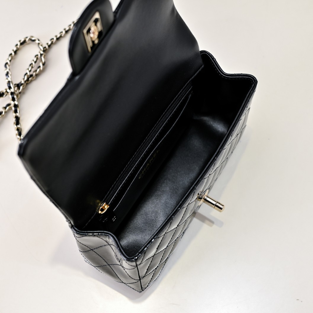 CHANEL 2024春夏コレクションで登場した、柔らかな黒小羊皮を使用したミニバッグ。20x12x6cmのコンパクトサイズで、スマートフォンや小物を収納可能。ブラックスチールのハードウェアがモダンでクールな印象を与え、エレガントかつドライなスタイリングに最適。チェーンショルダーは皮穿き仕様で、肩掛けや斜め掛けにも対応。内側にはファスナーポケットを装備し、実用性も兼ね備えたデザインです。