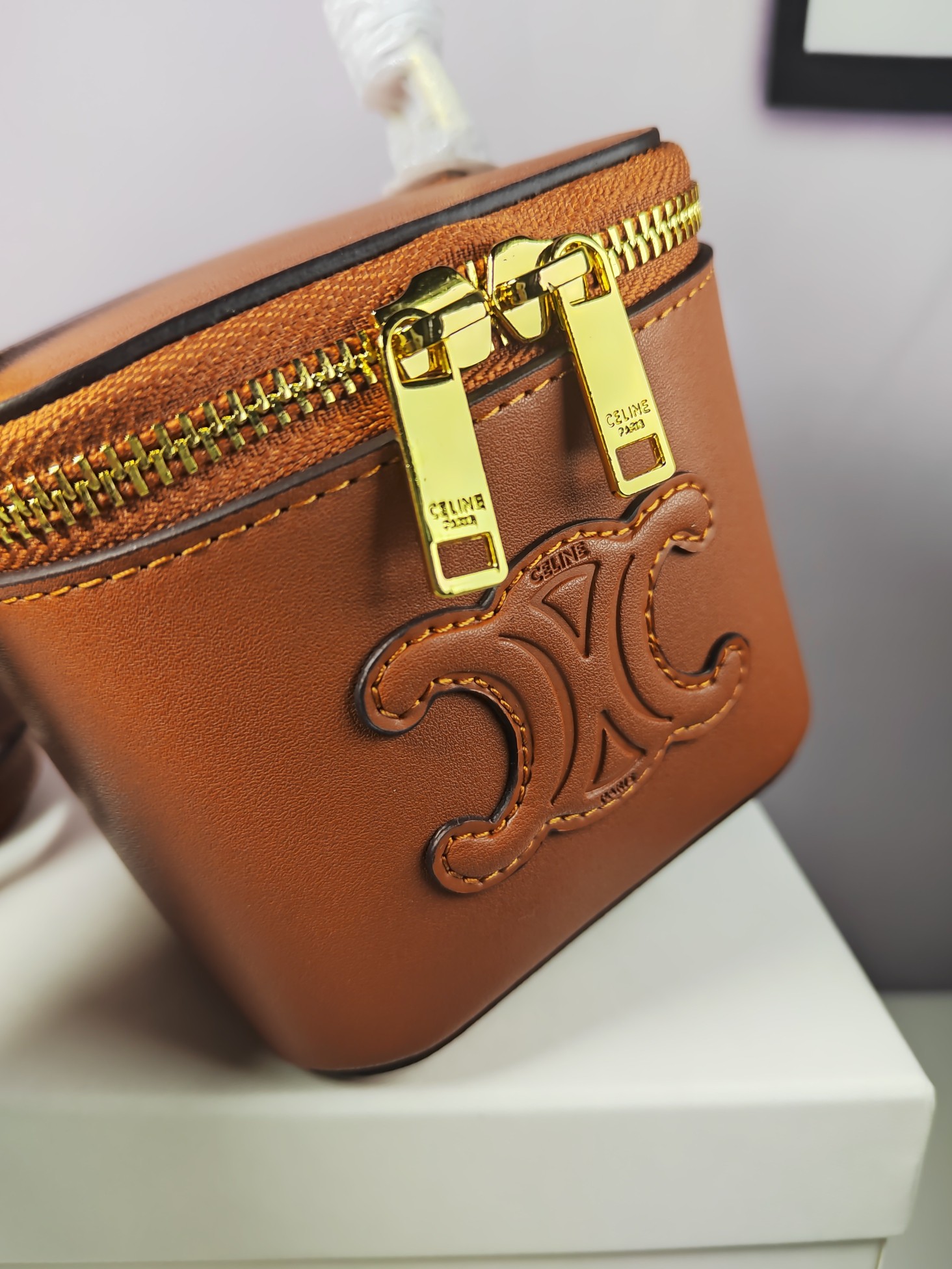 CELINEのアイコニックなトリオンフモチーフをあしらったミニサイズのコスメティックポーチ。なめらかなスムースレザーを使用し、高級感のある質感が特徴です。コンパクトながら化粧品や小物をしっかり収納できる設計で、バッグインバッグとしても最適。ブランドの象徴であるゴールドのトリオンフロゴが洗練された印象を与えます。