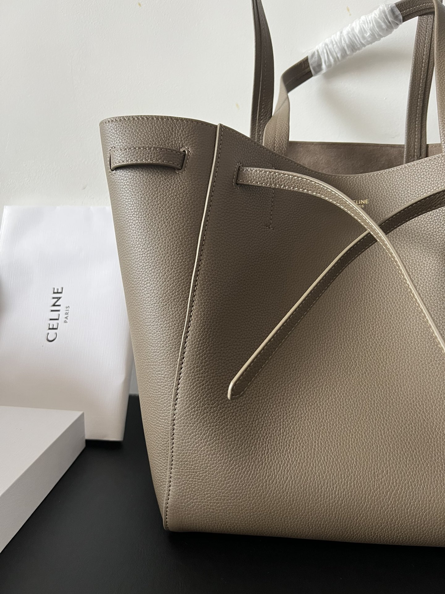 27x31x17cmの大容量シルエットで、イタリア産トゴカーフレザーとスエード調内裏を組み合わせたショッパーバッグ。調整可能なレザー抽緒(紐長さ42cm)と上部金具留めを備え、オープントップ/クローズドの2WAYスタイルに対応。メインコンパートメントにジッパーポケット1か所を配置し、ノートPCやA4書類の収納にも最適。