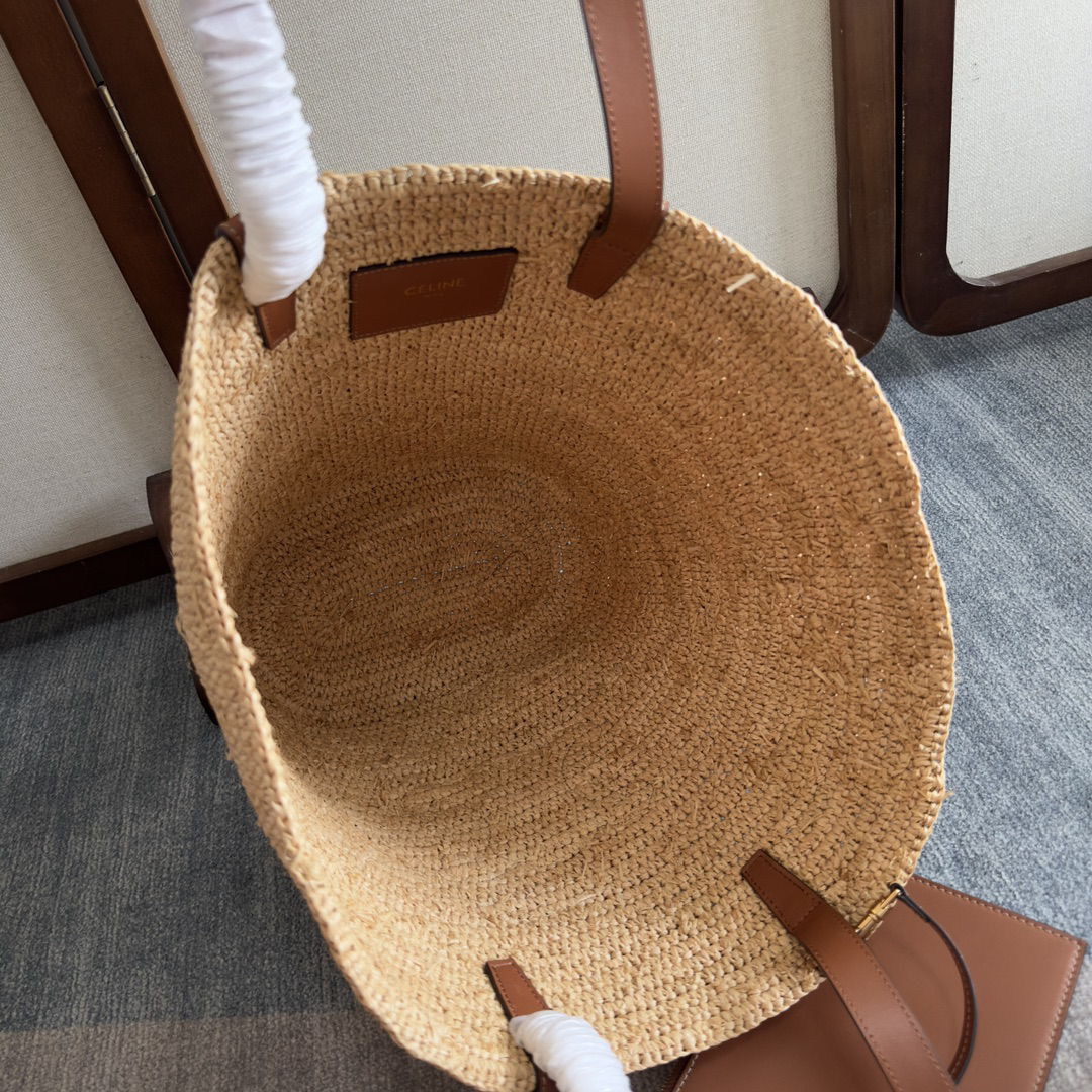 22x30x14cmのラージサイズ(型番114342)で、天然植物繊維とイタリア産カーフレザーの組み合わせが特徴。無裏地仕様の軽量設計に、ゴールドトーン・トリオンフェ金具と調整可能なレザーストラップ(肩紐長さ38cm/取っ手長さ15cm)を採用。メインコンパートメントに取り外し可能なレザー製ジッパーポケットを装備し、ビーチバッグから日常使いまで対応。