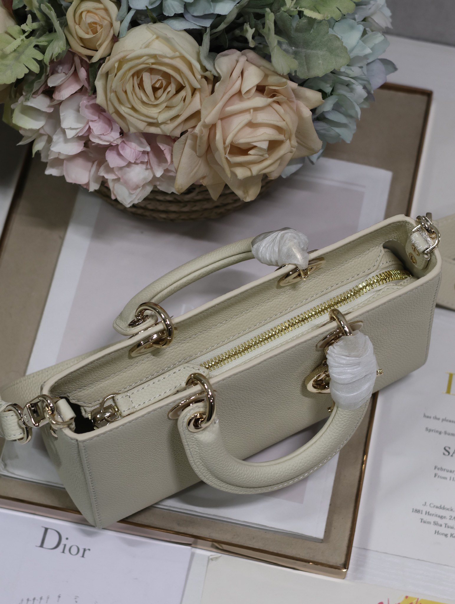 レディディオールのエレガントなデザインを継承しつつ、ソフトでモダンなシルエットが特徴のハンドバッグ12。アイボリー色のエピ風ベジタータンニン牛革に、ディオールの象徴「スーパーカンナージュ」の縫い目を施した高級感ある仕様。パーソナライズ可能なバンドリエール(3個のバッジ付属)と、ゴールドメタリックの「D.I.O.R.」チャームが洗練さを際立たせます