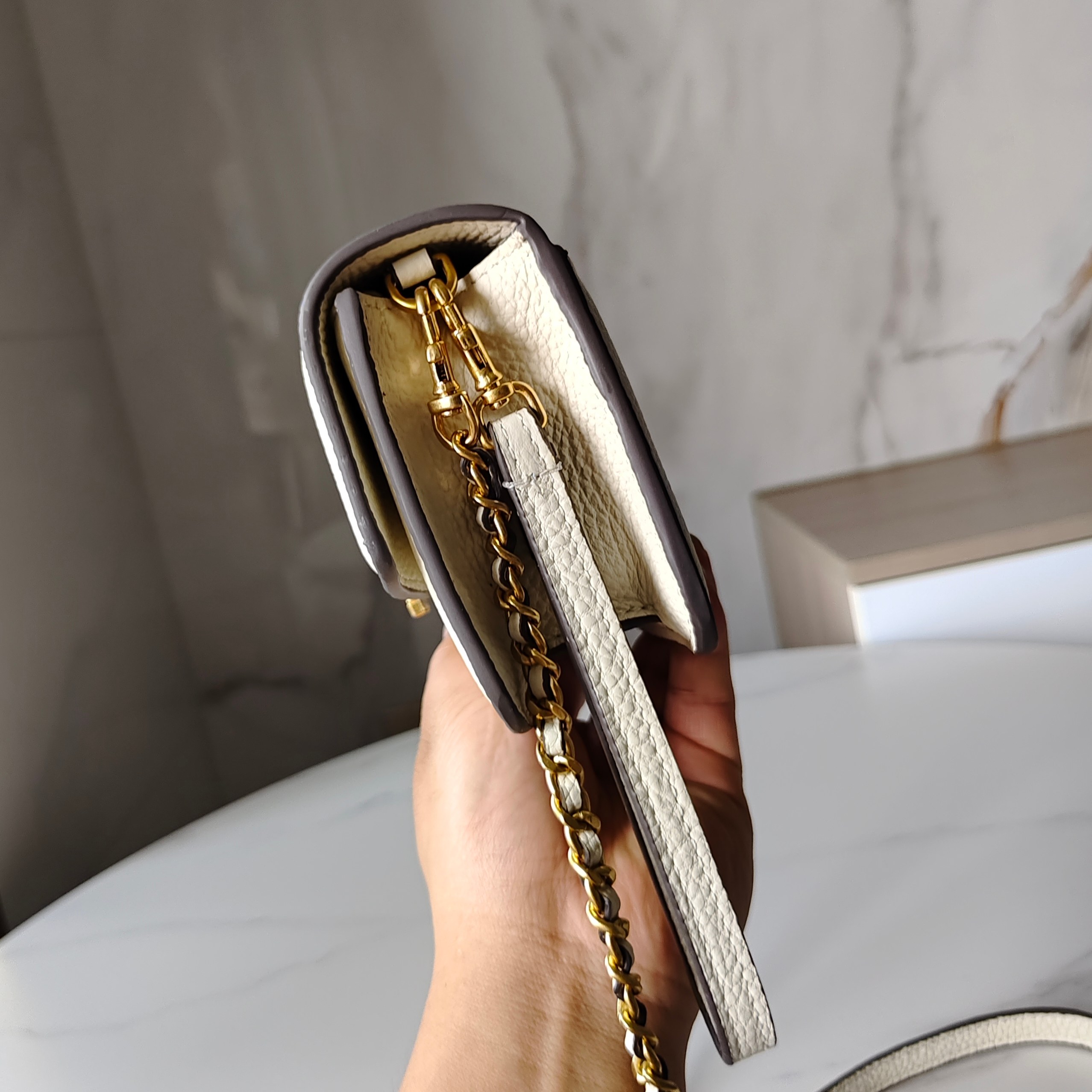 金色五金具とミニマルなロゴ配置で、トレンド感のある仕上がり。 -