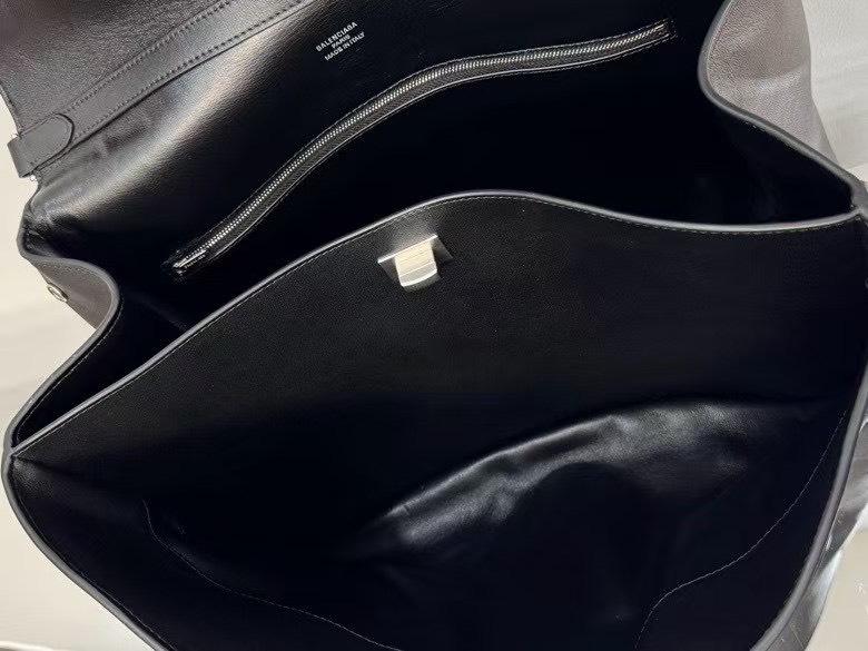 2025年春夏コレクションの新作メッセンジャーバッグで、40x11x30cmの大容量ボディに13インチノートPCも収納可能。高級感ある黒のスムースレザーとクロコダイルエンボス加工を組み合わせ、シンプルなシルエットにアンティーク調金具のドラマチックなコントラストを演出。メインコンパートメントはダブルジッパー開閉式で、背面にスリットポケットを装備した実用性重視デザイン。調節可能なショルダーベルト(最大120cm)でショルダー/クロスボディの2WAY着用が可能。