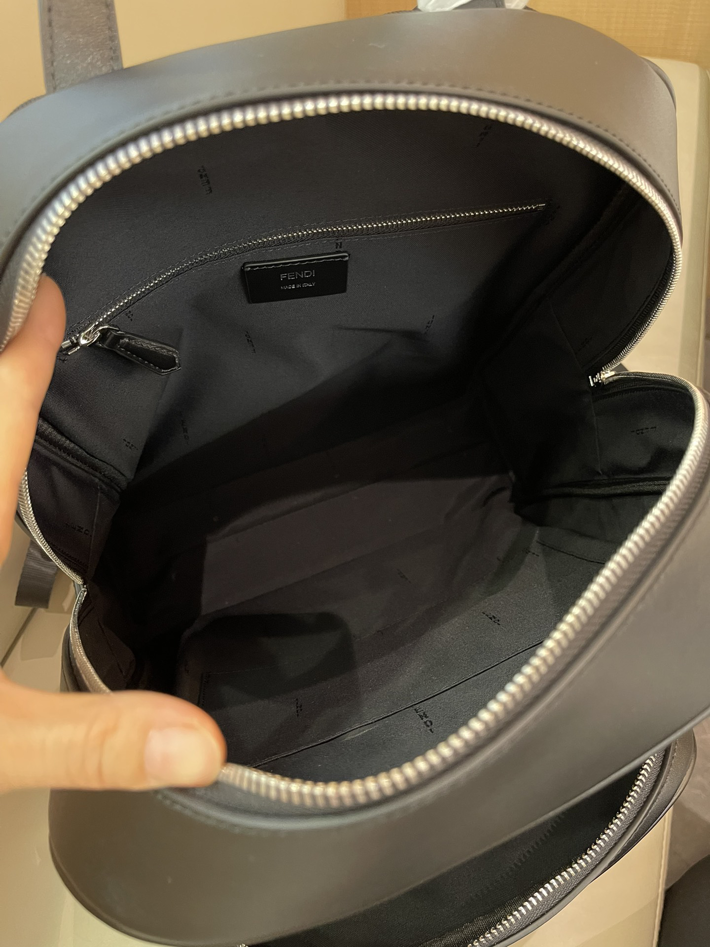 FENDIの「ストライク」シリーズに属するメンズ向けバックパックで、ブラックのプレミアムレザーとナイロンのコンビネーションが特徴。前面にはエンボス加工のFENDI Romaロゴが施され、サイズは高さ41cmx幅30cmx奥行き16cmの実用的な容量設計。13インチノートPC収納可能なパッド入りポケットを内蔵し、2つの前面ポケットと背面メッシュポケットで収納力も抜群。イタリア製の品質とシルバー調ハードウェアが洗練された印象を与えます。