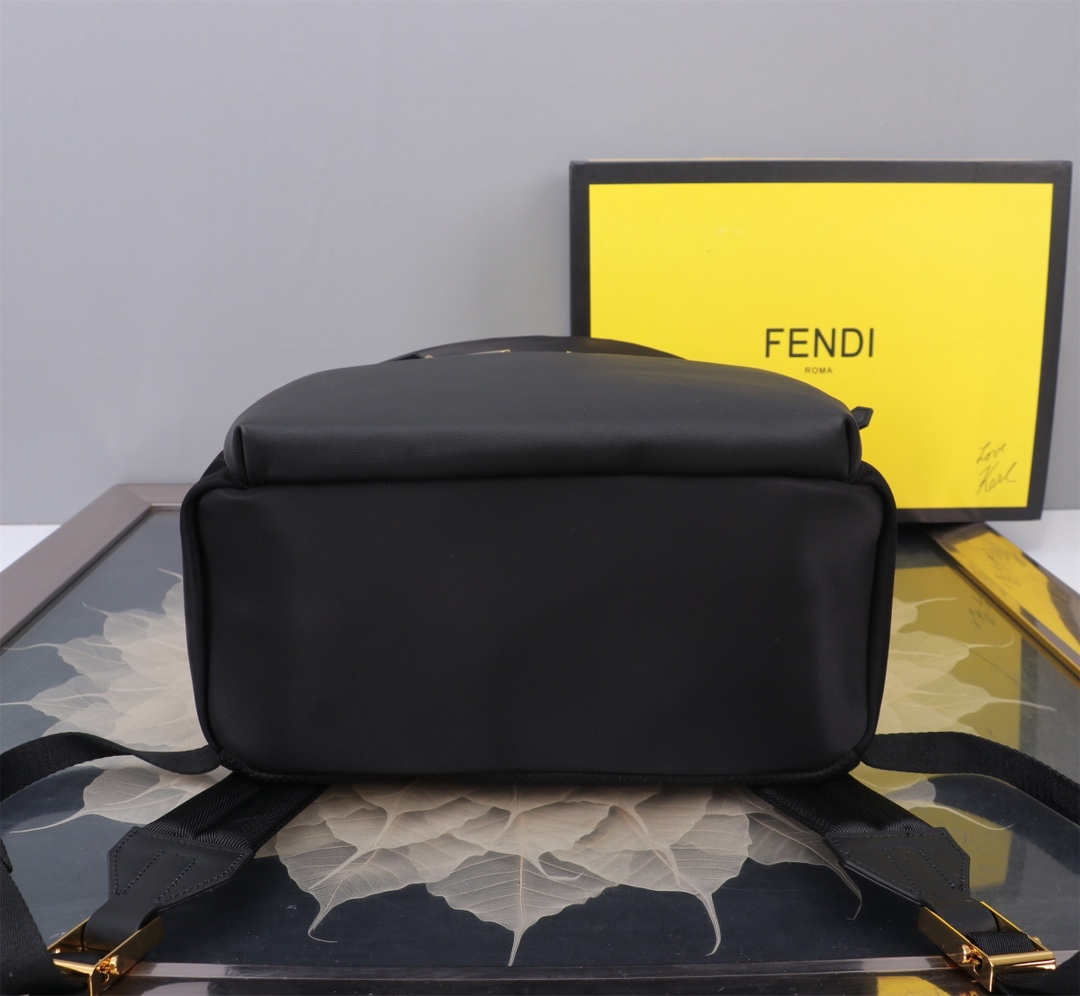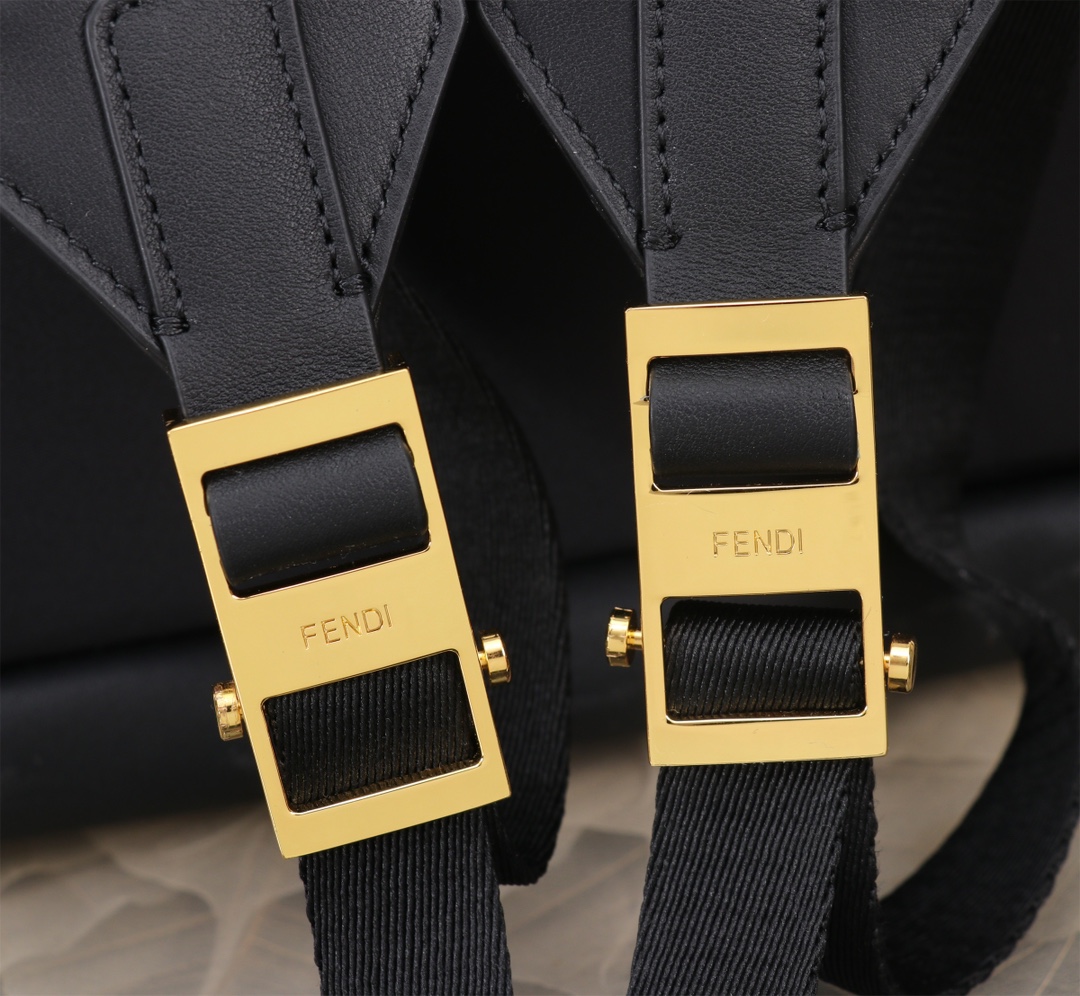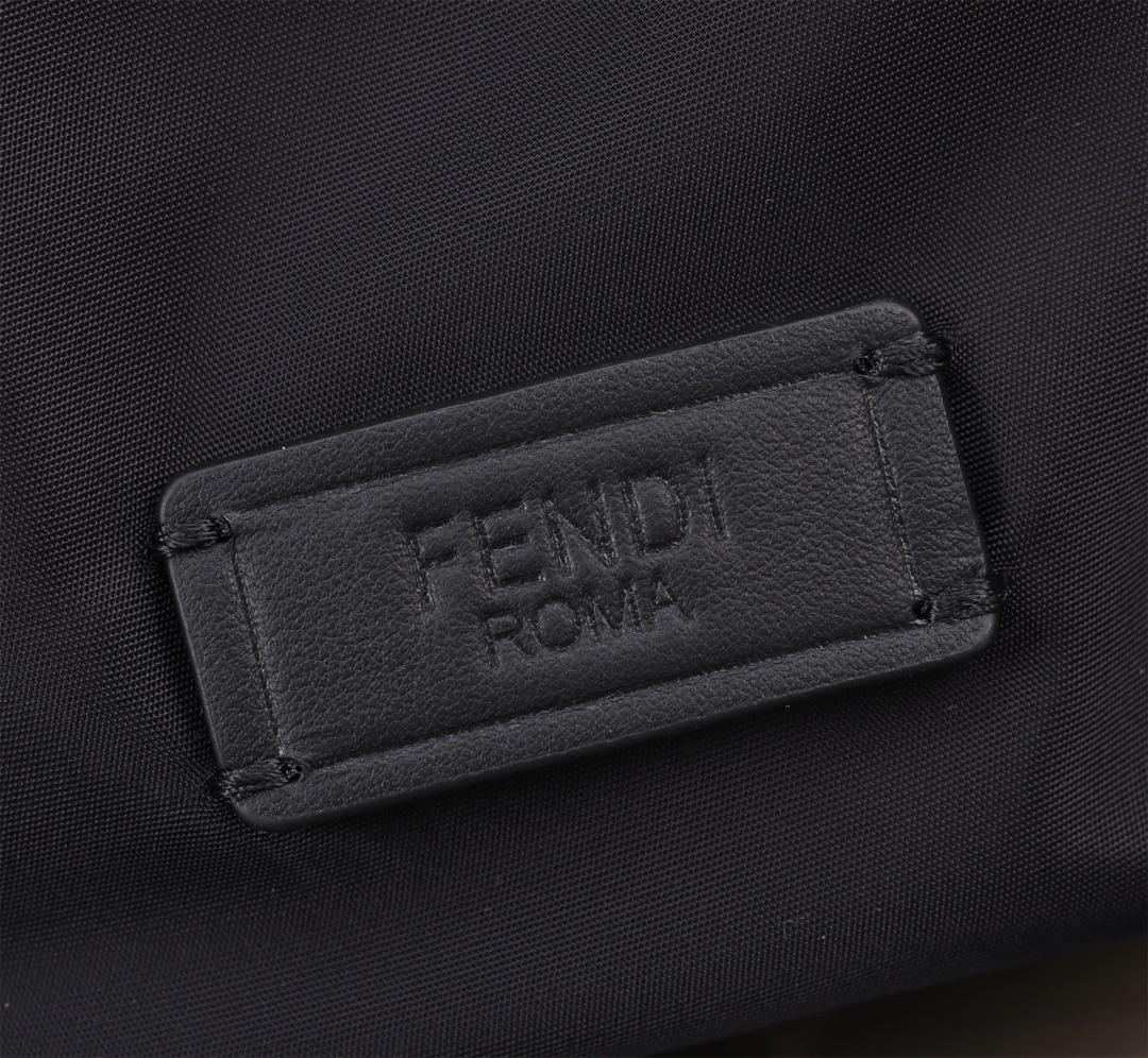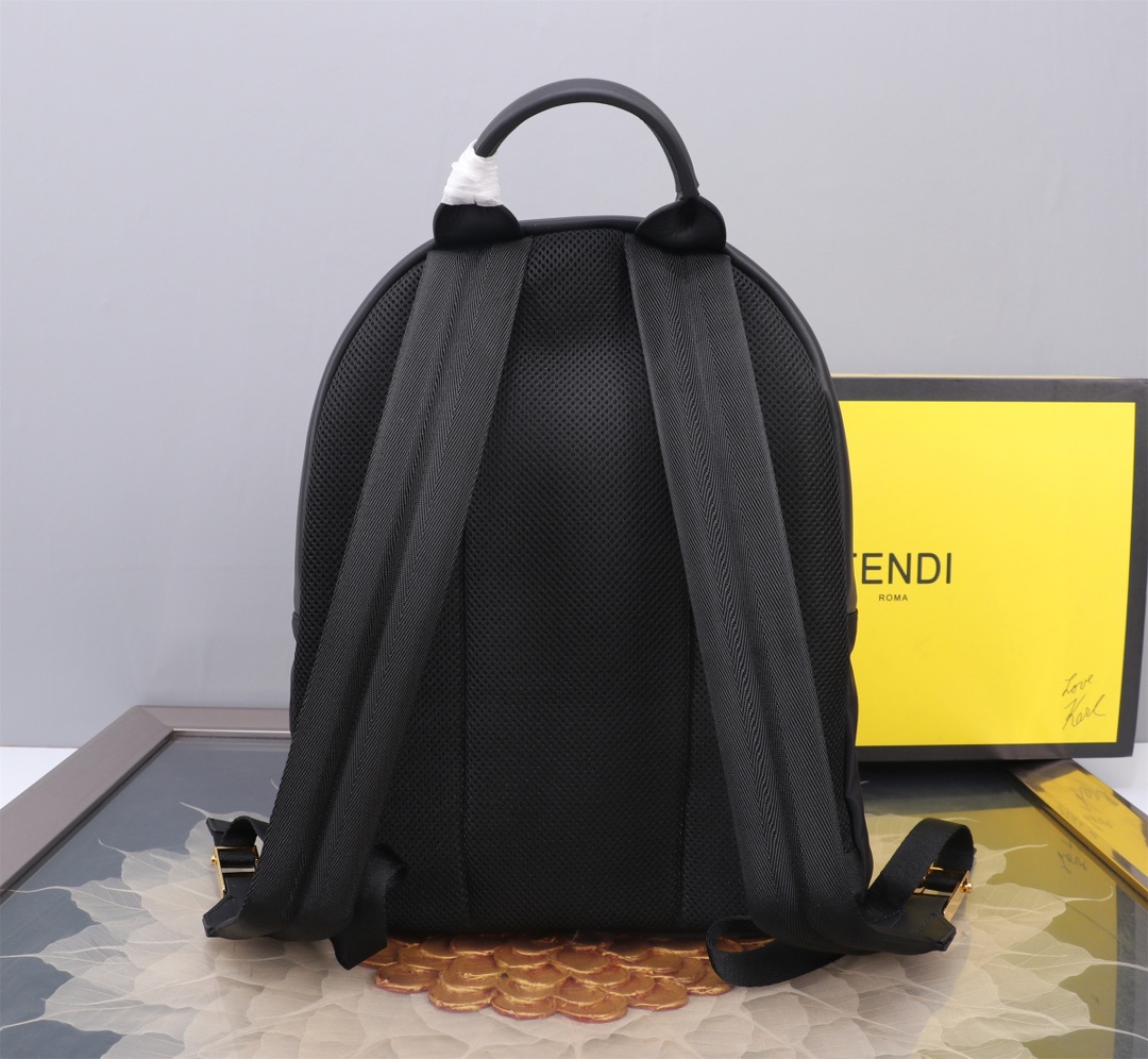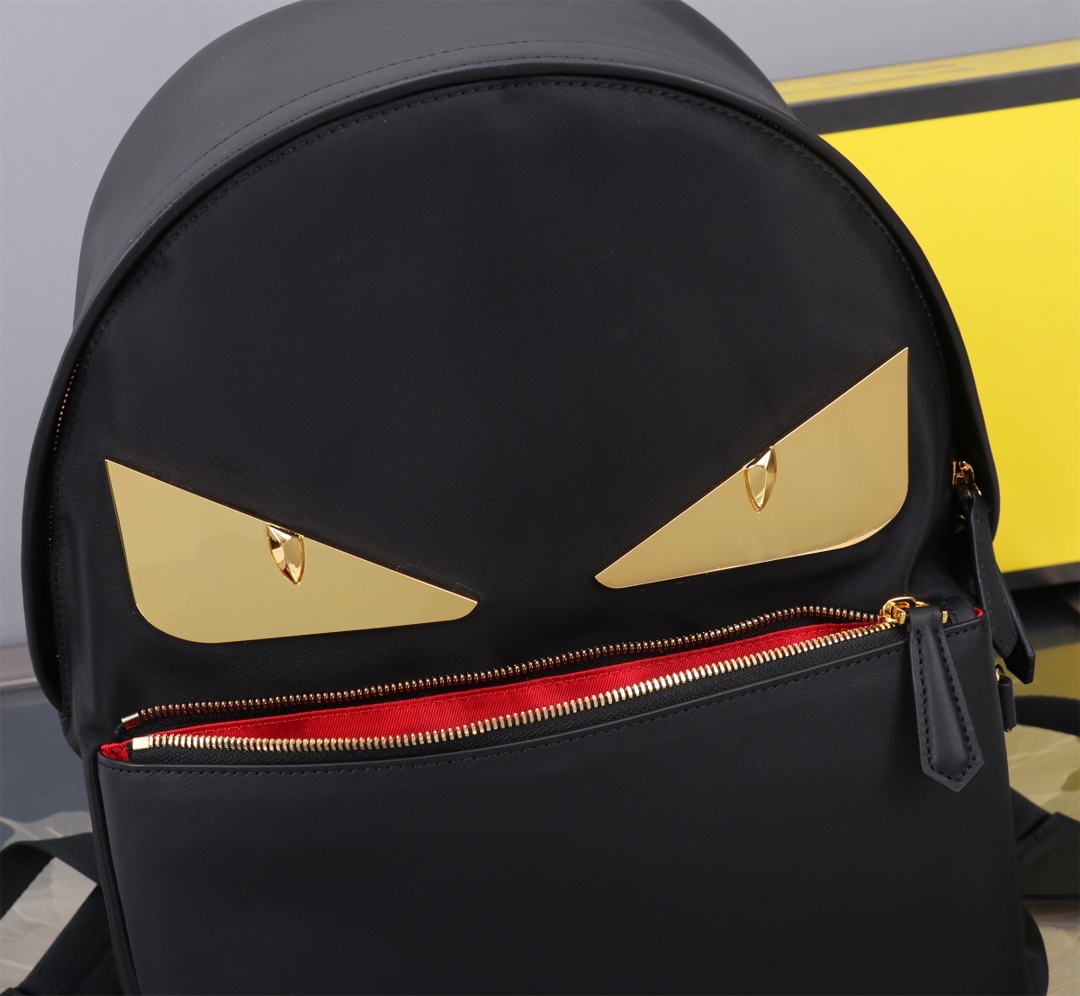 FENDIのアイコニックな「バグズ」シリーズから登場したメンズ用バックパック。ブラックナイロン生地と高級レザーの組み合わせが洗練されたデザインで、前面には遊び心のあるバグズの目が特徴的。サイズは33x38x16cm(高さx幅x奥行き)で日常使いに最適な容量。20年秋冬コレクションの定番モデルで、機能性とファッション性を兼ね備えた一品。