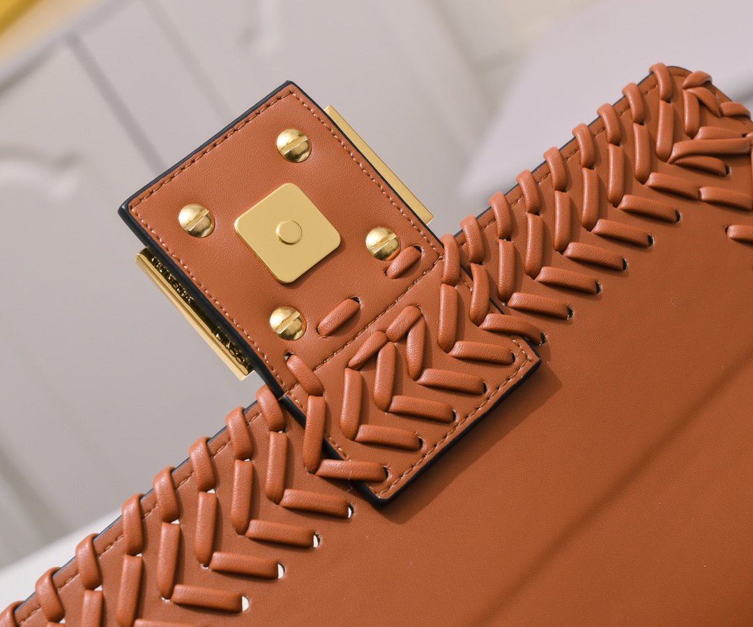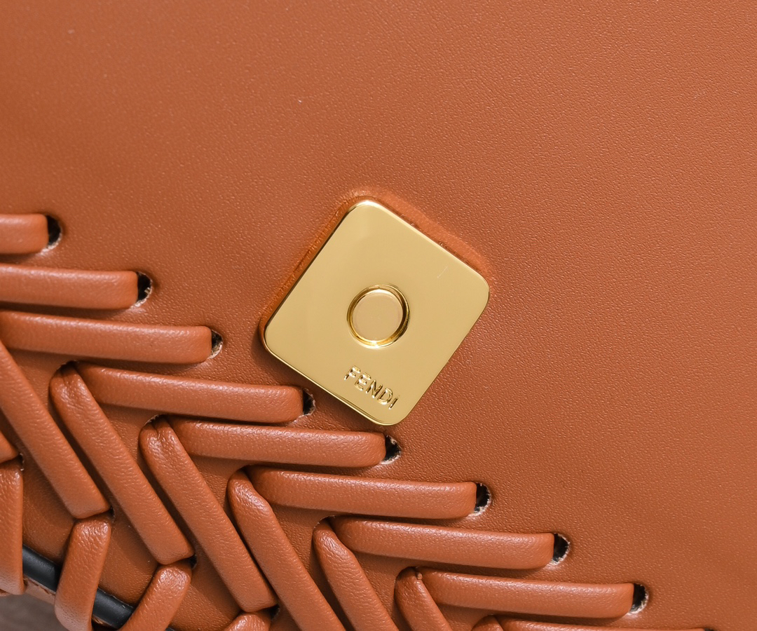 FENDIのアイコニックな Baguette メディウムサイズは、シープスキン風のペーパーカラー(羊皮紙調)レザーを手編み加工した特別なデザイン。27x15x6cmのコンパクトなボディに、FFモノグラムのメタルロックをアクセントに配し、洗練された雰囲気を演出。マグネット式フラップ開閉と内部のファスナーポケットを備え、実用的な収納力を兼ね備えています。取り外し可能なショルダーストラップ付きで、手持ちや斜め掛けなど多様なスタイリングが可能。