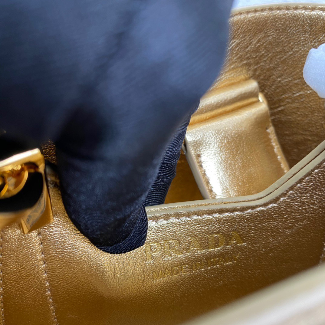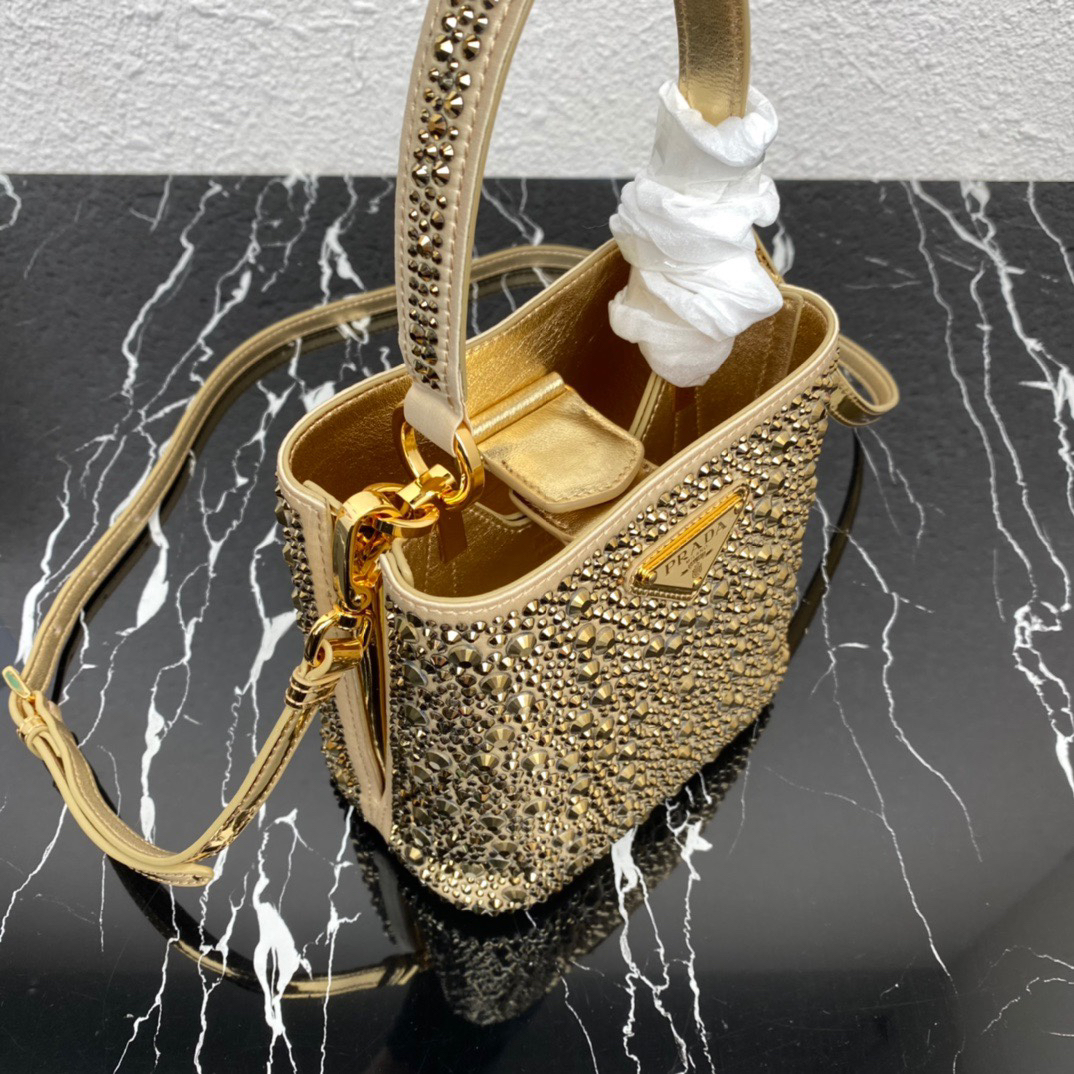 プラダの「1BA373」は、クリスタル風スパングルで全面を装飾したバケットシルエットのハンドバッグ。ジュエリーのような煌めきを放つデザインが、シンプルな装いにも華やかなアクセントを加えます。メインコンパートメントは柔軟な形状で小型アイテムを収納可能。着脱式ショルダーストラップで手持ちやショルダー掛けなど多様なスタイルに対応し、前面のメタルロゴプレートがブランドのアイコン性を際立たせます。サイズは縦15cmx横16cmx幅9.5cmとコンパクトながら、ナイトアウトから日常使いまで汎用性の高い逸品です。