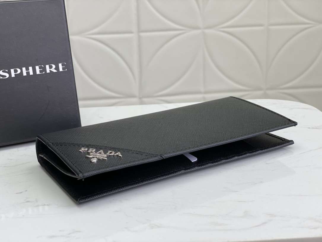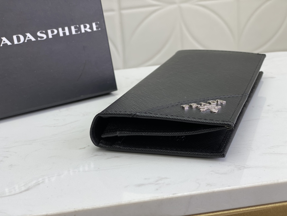 プラダのアイコン「サフィアーノレザー」を使用したビジネスウォレット(19x12cm)。イタリア職人による伝統の十字紋加工が施され、ビジネスシーンにふさわしい洗練された佇まい。スリムな2つ折りデザインながら、8カードポケットと紙幣収納スペースを完備。前面の三角形メタルロゴが、シンプルなデザインに品格を添えます。