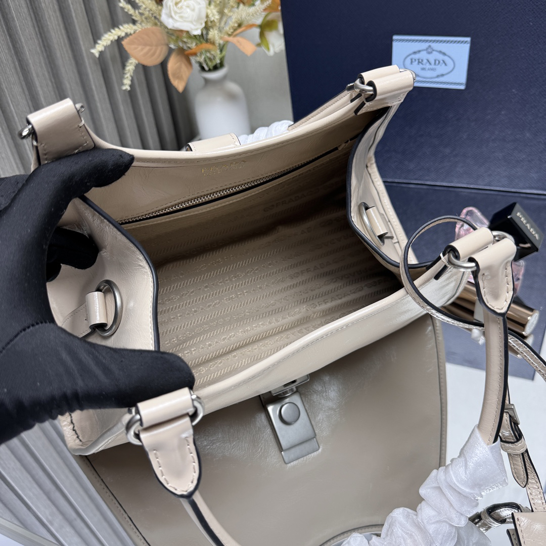 プラダの新作「ジオメトリック トラペゾイドトート」は、幾何学的なラインと繊細な職人技が光る春夏コレクションの注目作。32cmx21cmx15cmの台形シルエットに、スリムなレザーハンドルと脱着式ショルダーストラップを組み合わせたマルチキャリーデザイン。高密度ナイロン素材の軽量性と、内側ファスナーポケットによる実用性を両立。前面に配置したメタリックトライアングルロゴが、ミニマルながらブランドのアイコン性を際立たせます。