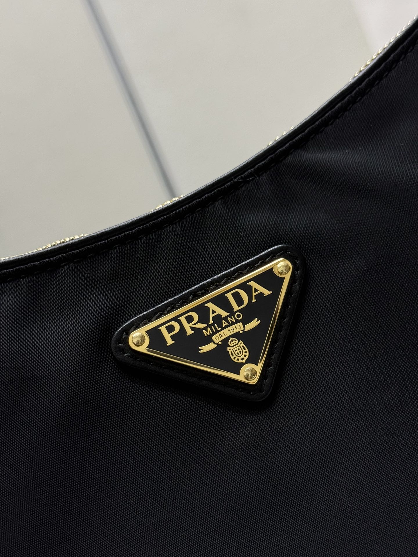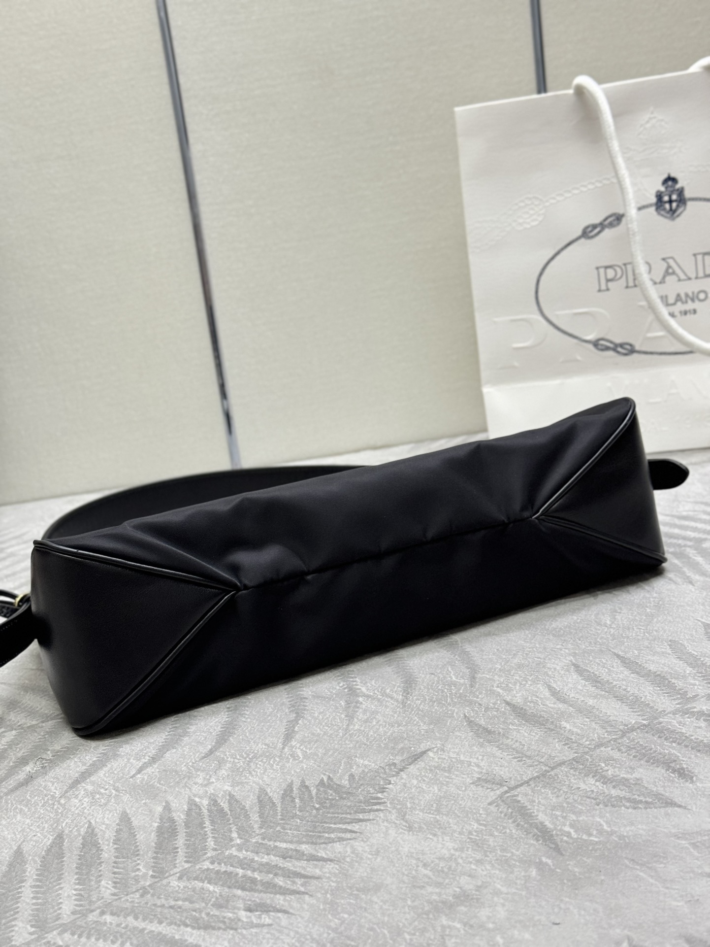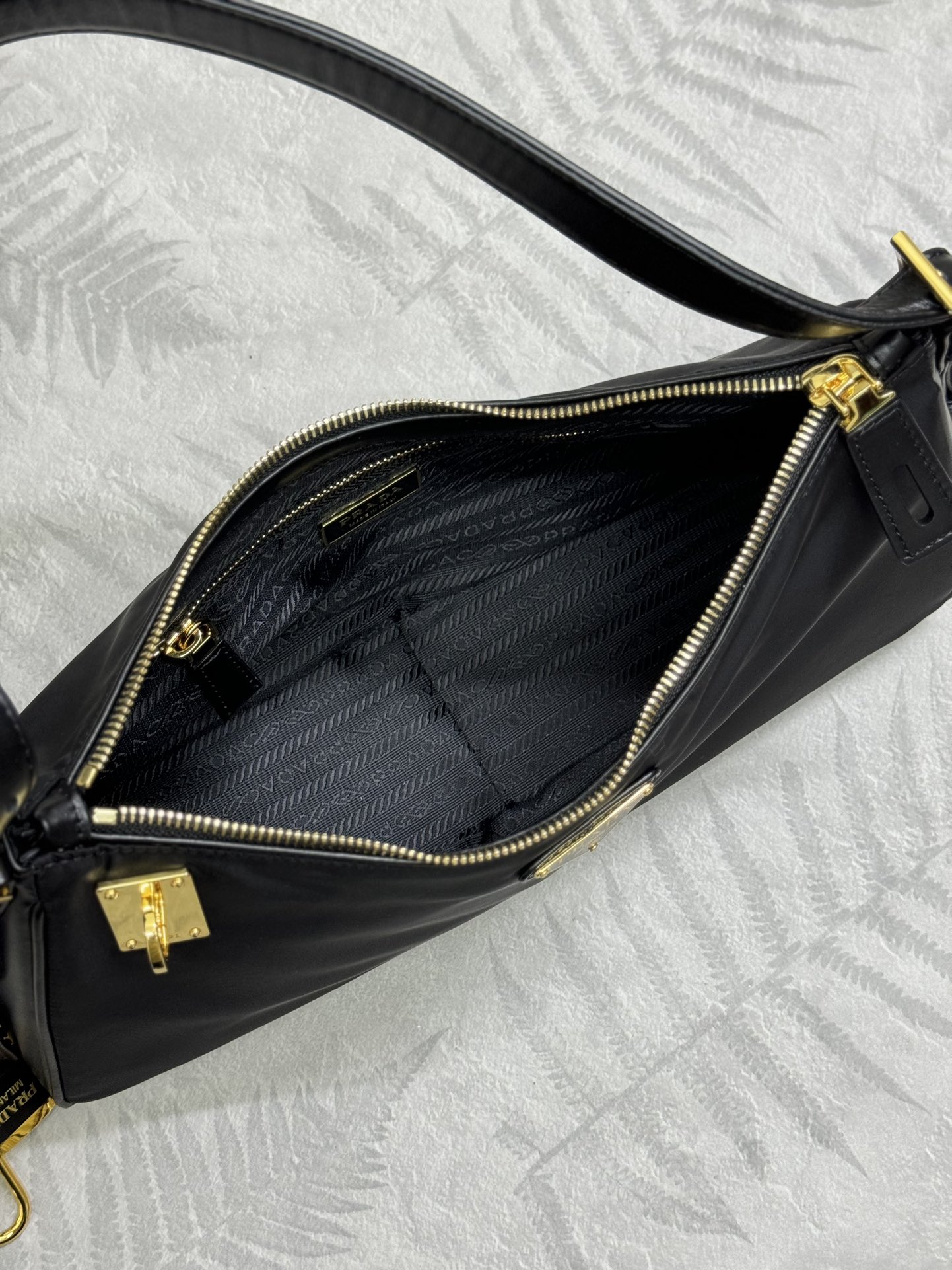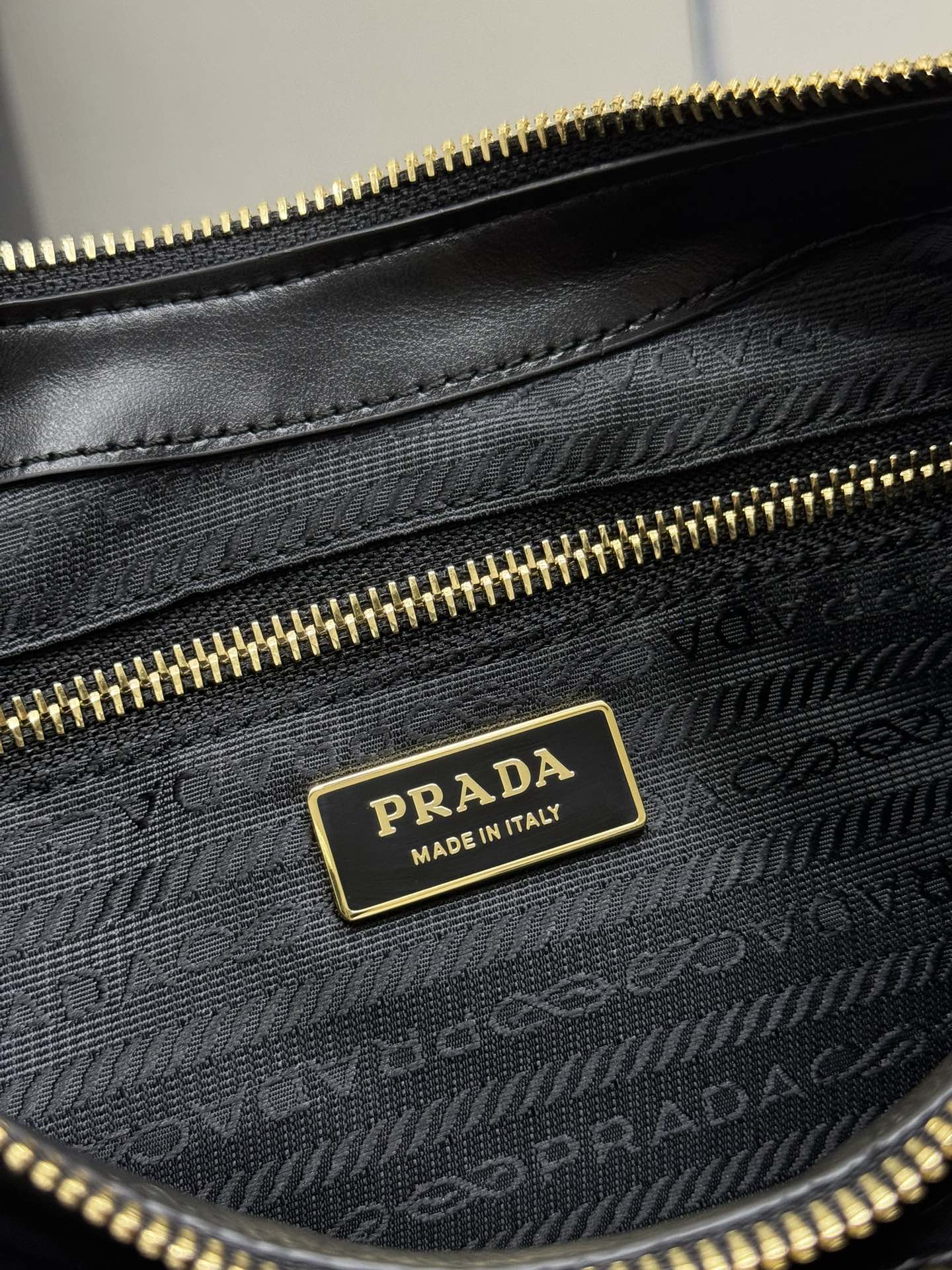 プラダの象徴であるパッドロックをアクセントに、ジッパーとの二重開閉で実用性とデザイン性を両立。 -