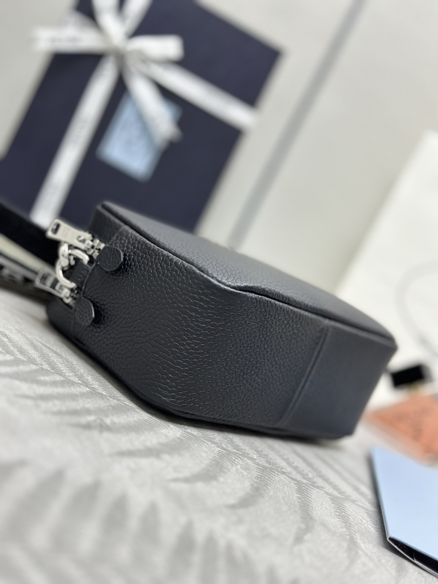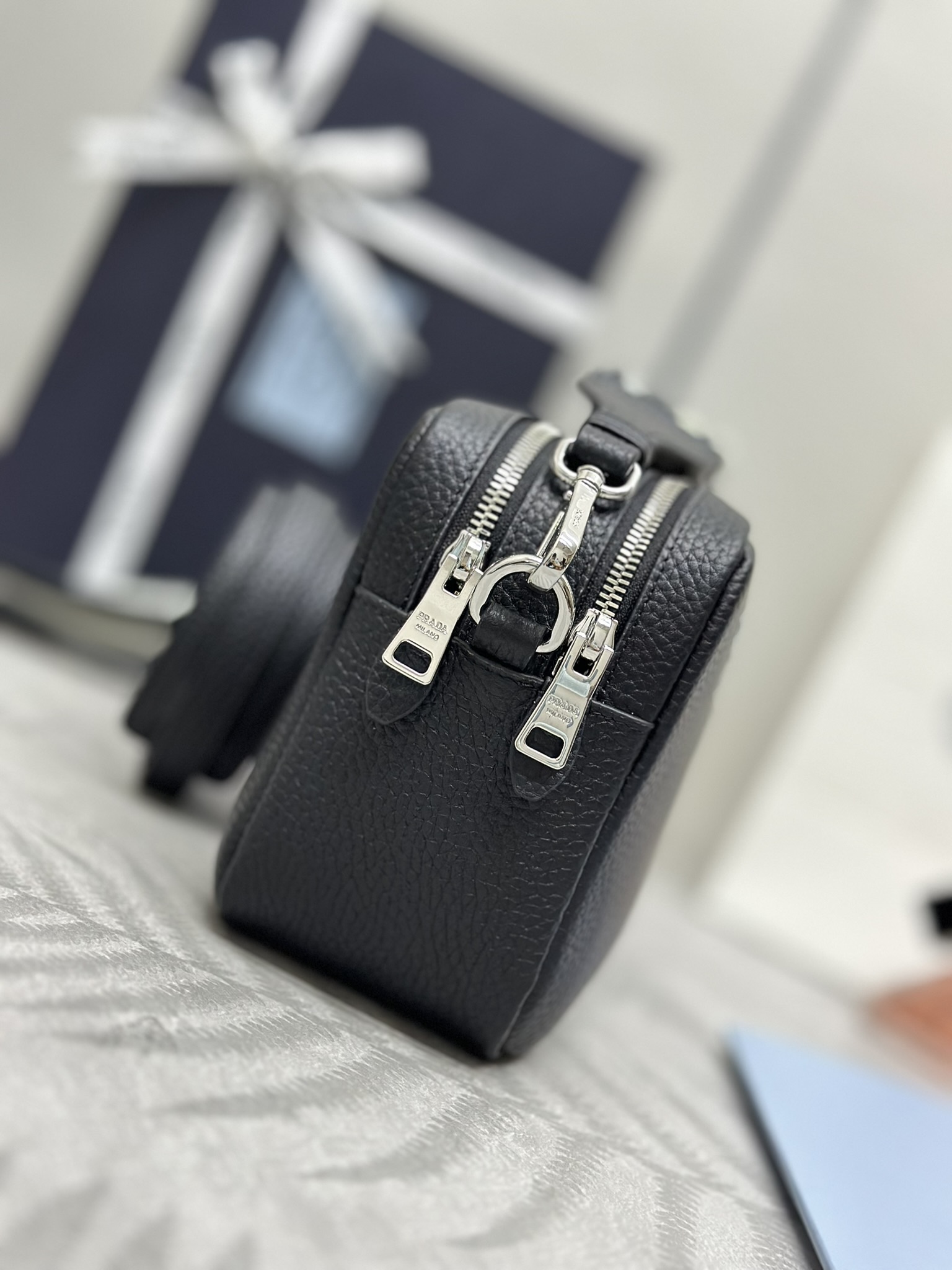 プラダの新作「1BH082」は、鹿革調エンボス加工の牛革とロゴプリントテキスタイルを組み合わせた多機能ショルダーバッグ。縦22x横14xマチ8cmのコンパクトボディに2つの独立したコンパートメントを内蔵し、スマホ・ウォレット・化粧品を分類収納可能。付属のレザーストラップ(調節可能)とテキスタイルストラップをシーンに応じて着脱・交換し、カジュアルからエレガントまで自在にスタイリングを変革。柔らかな素材感と軽量性で、日常使いの快適性とトレンド感を両立させた逸品です。