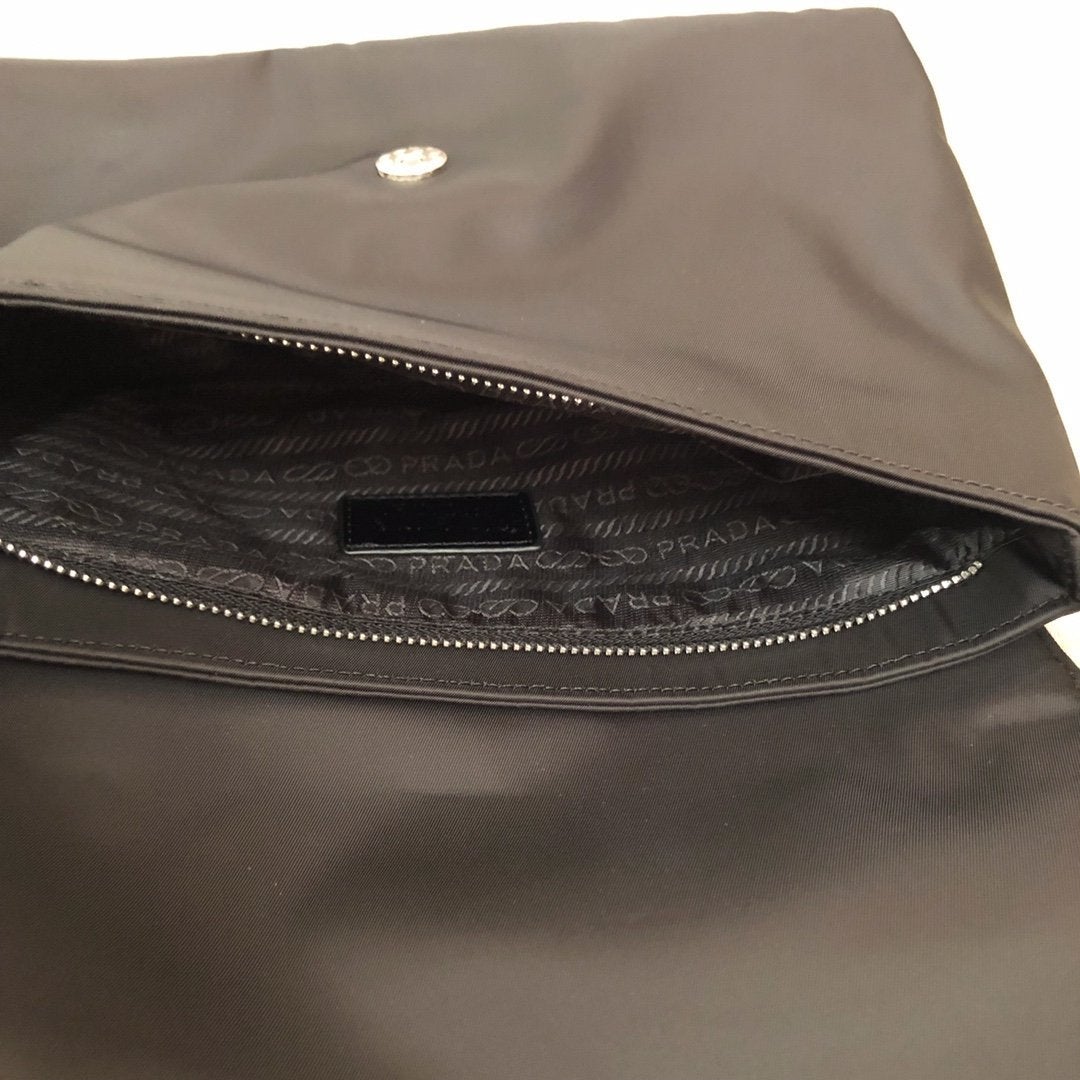 プラダのヴィンテージコレクションから生まれたナイロン製アンダーアームバッグ(28x17cm)。輸入ナイロン素材を使用した軽量かつ丈夫な作りが特徴です。フラップデザインとトップハンドルを備え、手持ちからショルダー掛けまで様々なスタイリングが可能。大容量のメインコンパートメントは日常使いに最適で、シンプルながら存在感のあるデザインが魅力です。