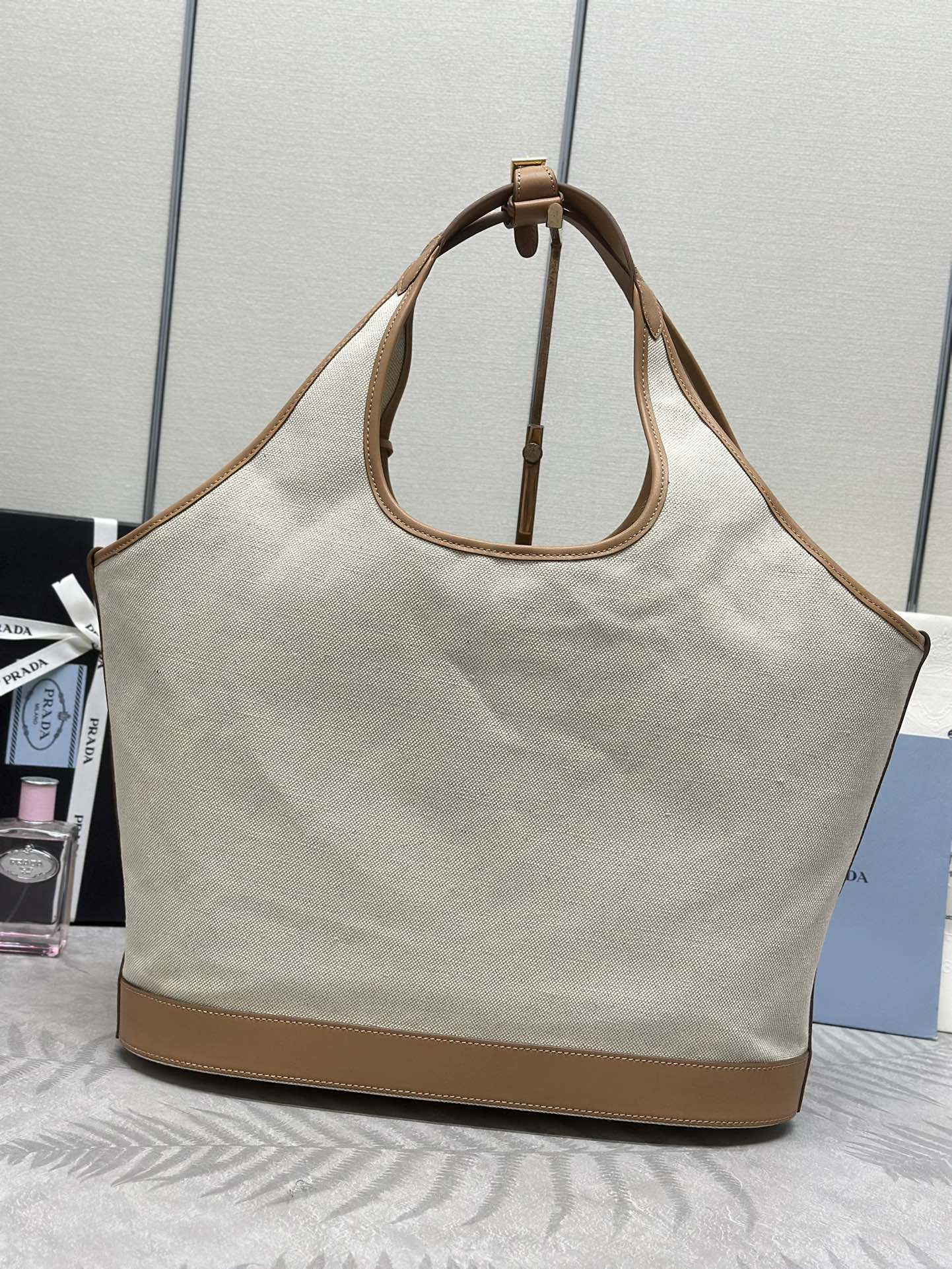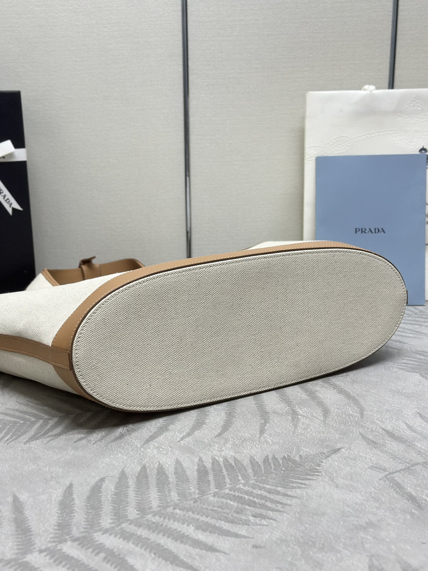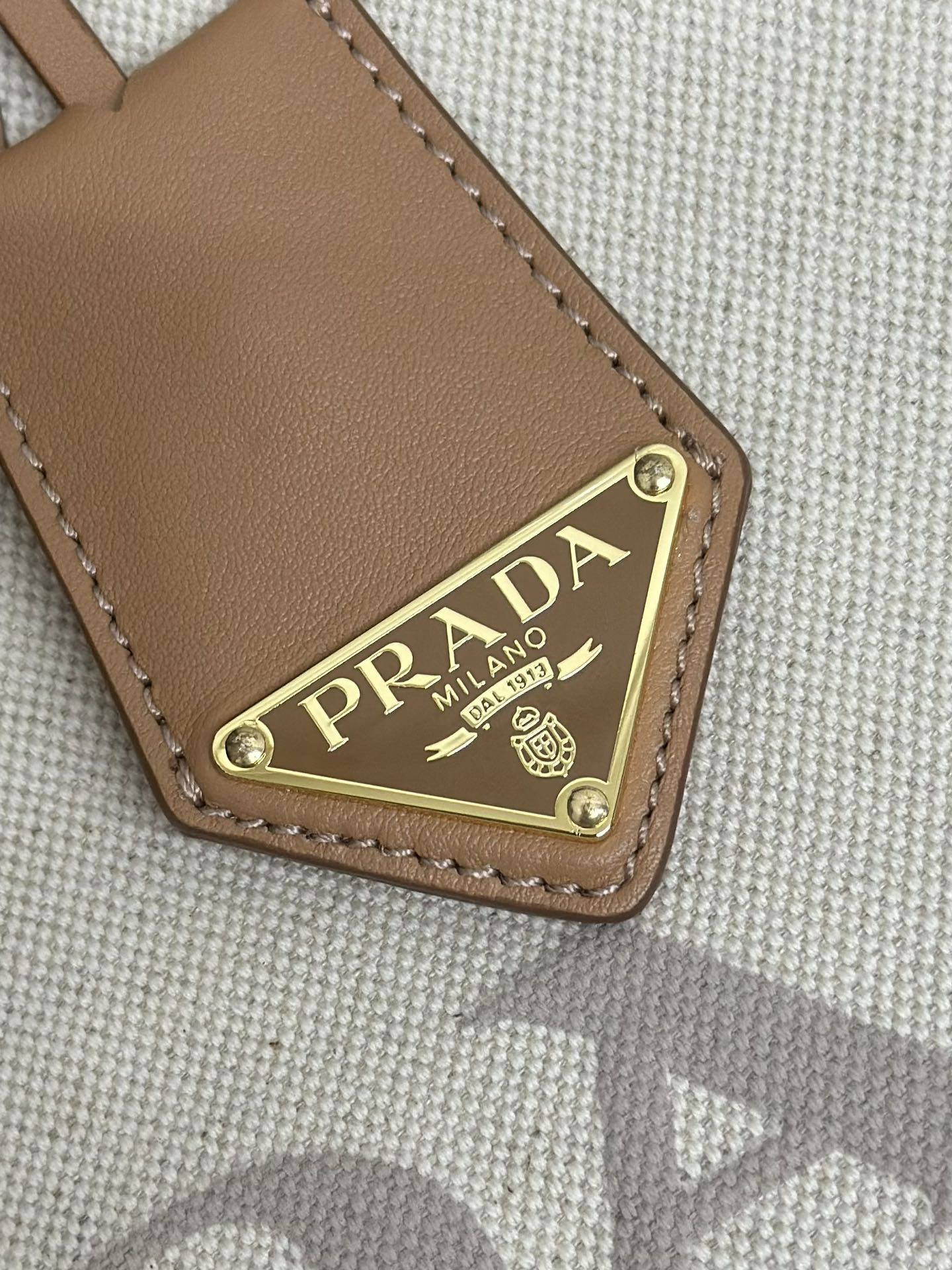 プラダの新作「1BG472」は、リネン混紡素材と構造的なジオメトリックデザインが特徴の大容量トートバッグ。高さ30x幅37.5x奥行き13cmの立体感あるシルエットがモダンな存在感を放ち、レザー縁取りやエナメルコーティングの三角形メタルロゴ付きキーホルダー(着脱式)が上品なアクセントに。軽量かつタフな素材で、日常使いからビーチリゾートまで幅広く対応。前面の浮き彫りロゴがブランドのアイコン性を主張し、機能性と洗練された美学を両立させた逸品です。
