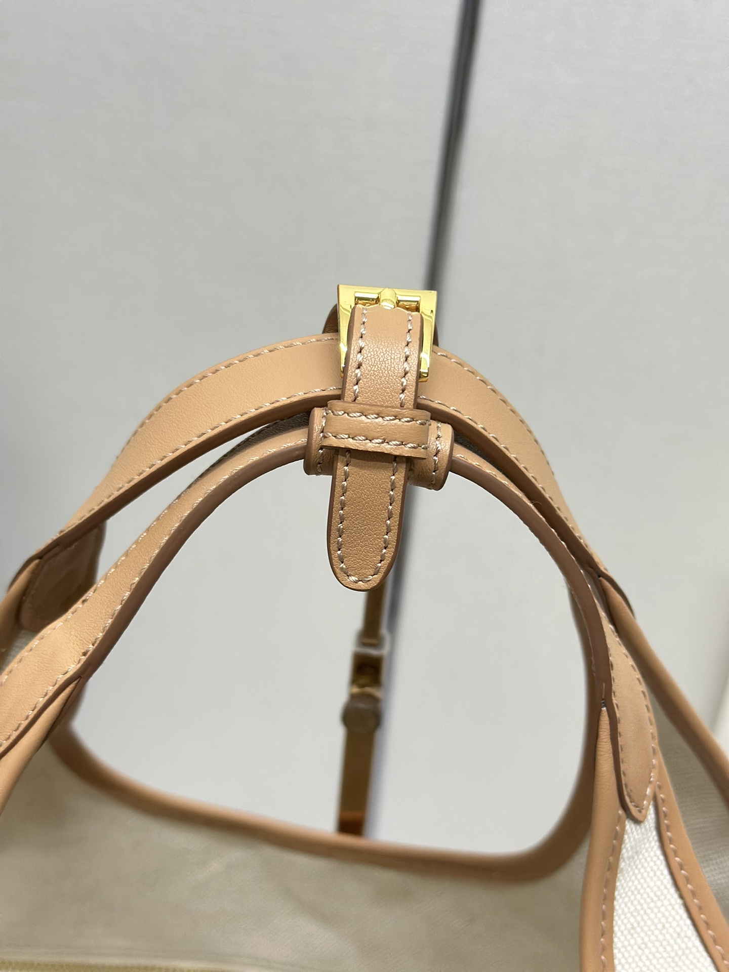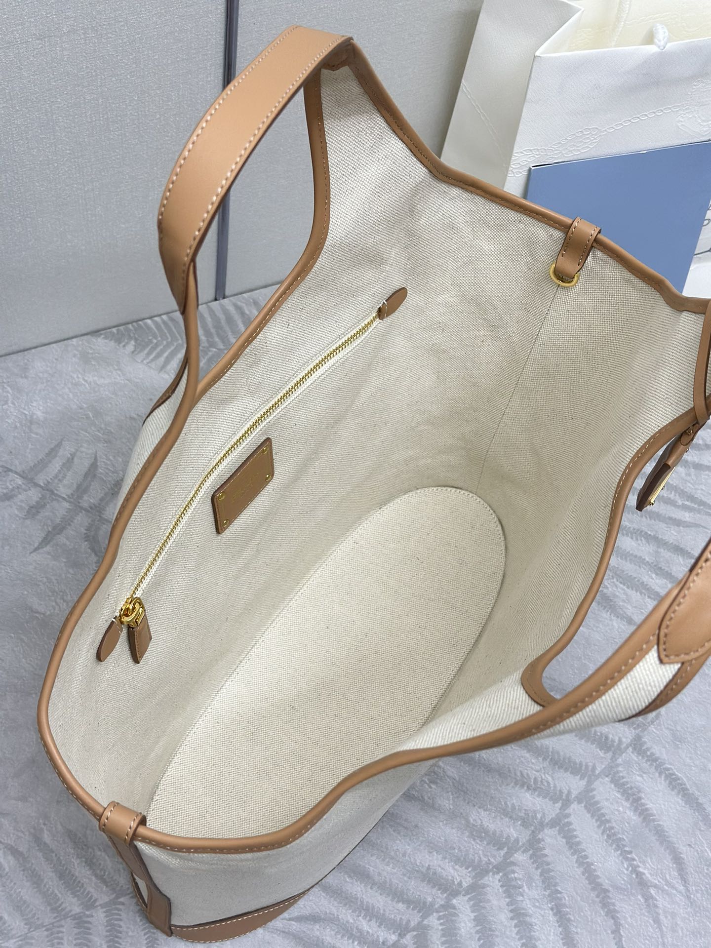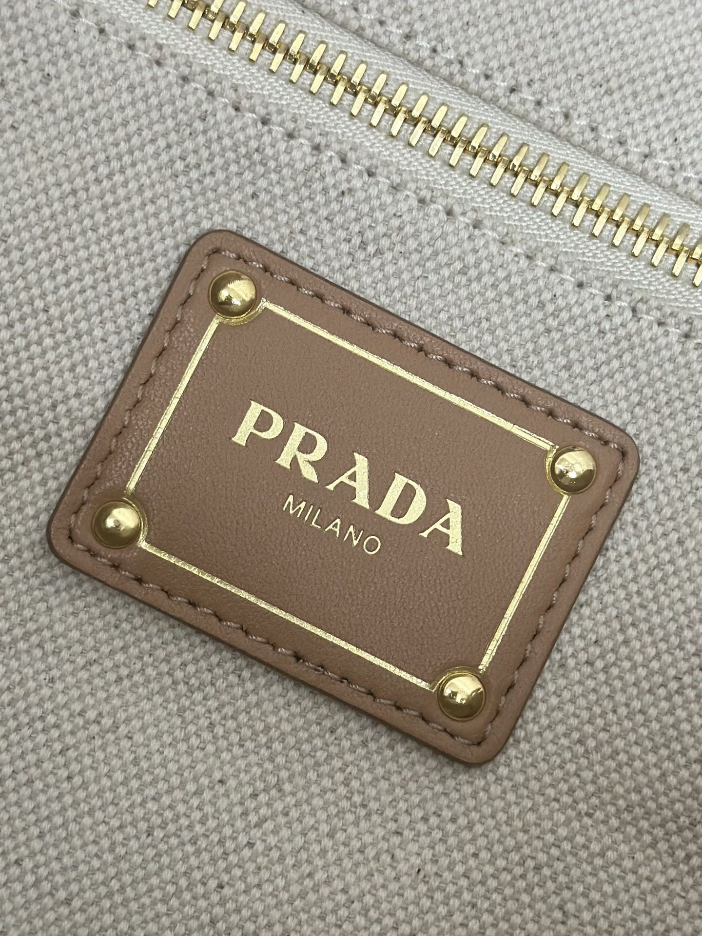 プラダの新作「1BG472」は、リネン混紡素材と構造的なジオメトリックデザインが特徴の大容量トートバッグ。高さ30x幅37.5x奥行き13cmの立体感あるシルエットがモダンな存在感を放ち、レザー縁取りやエナメルコーティングの三角形メタルロゴ付きキーホルダー(着脱式)が上品なアクセントに。軽量かつタフな素材で、日常使いからビーチリゾートまで幅広く対応。前面の浮き彫りロゴがブランドのアイコン性を主張し、機能性と洗練された美学を両立させた逸品です。