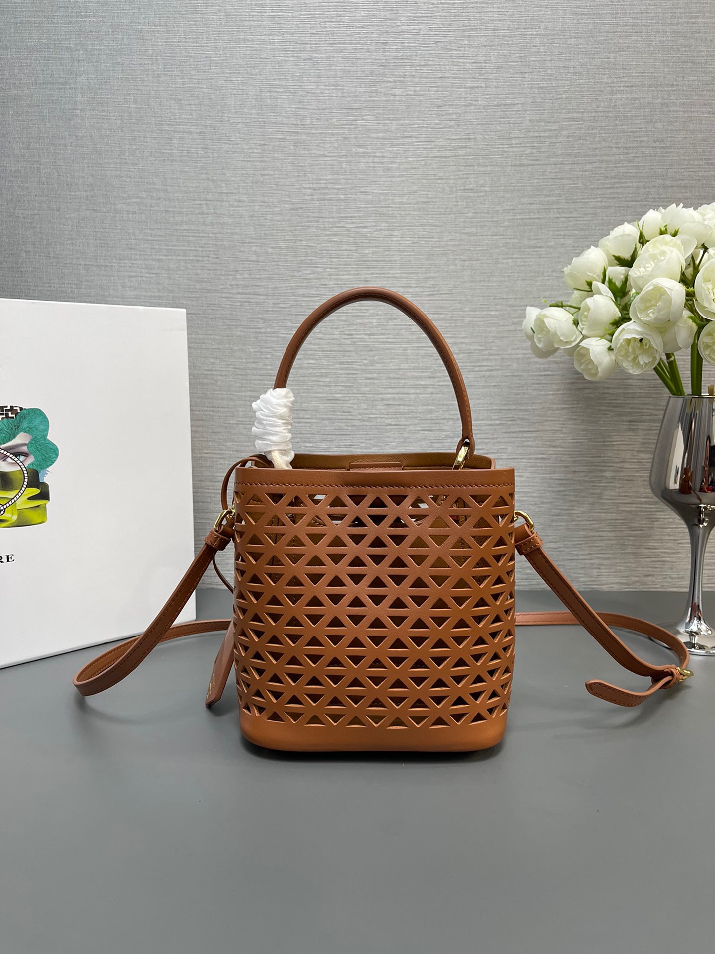 プラダの新作ミニボトルバッグ(1BA217)は、サフィアーノレザーに施された精密なレーザーカット加工が特徴的なデザイン。18cmx17cmのコンパクトサイズながら、10.5cmの底幅で安定感を確保。小孔を規則的に配列したボディが軽量化と通気性を実現し、春夏の軽やかな装いに最適。内側にはスリムポケットを配置し、カードケースやリップクリームを整理可能。三角形メタルロゴチャームが遊び心を添え、カジュアルからセミフォーマルまで幅広いスタイリングを引き立てる、機能美とファッション性を兼ね備えた一品です。