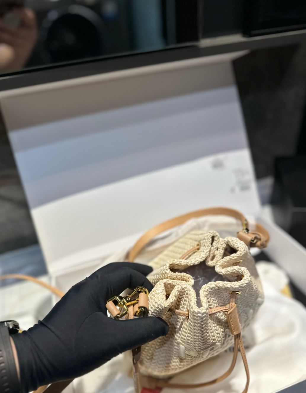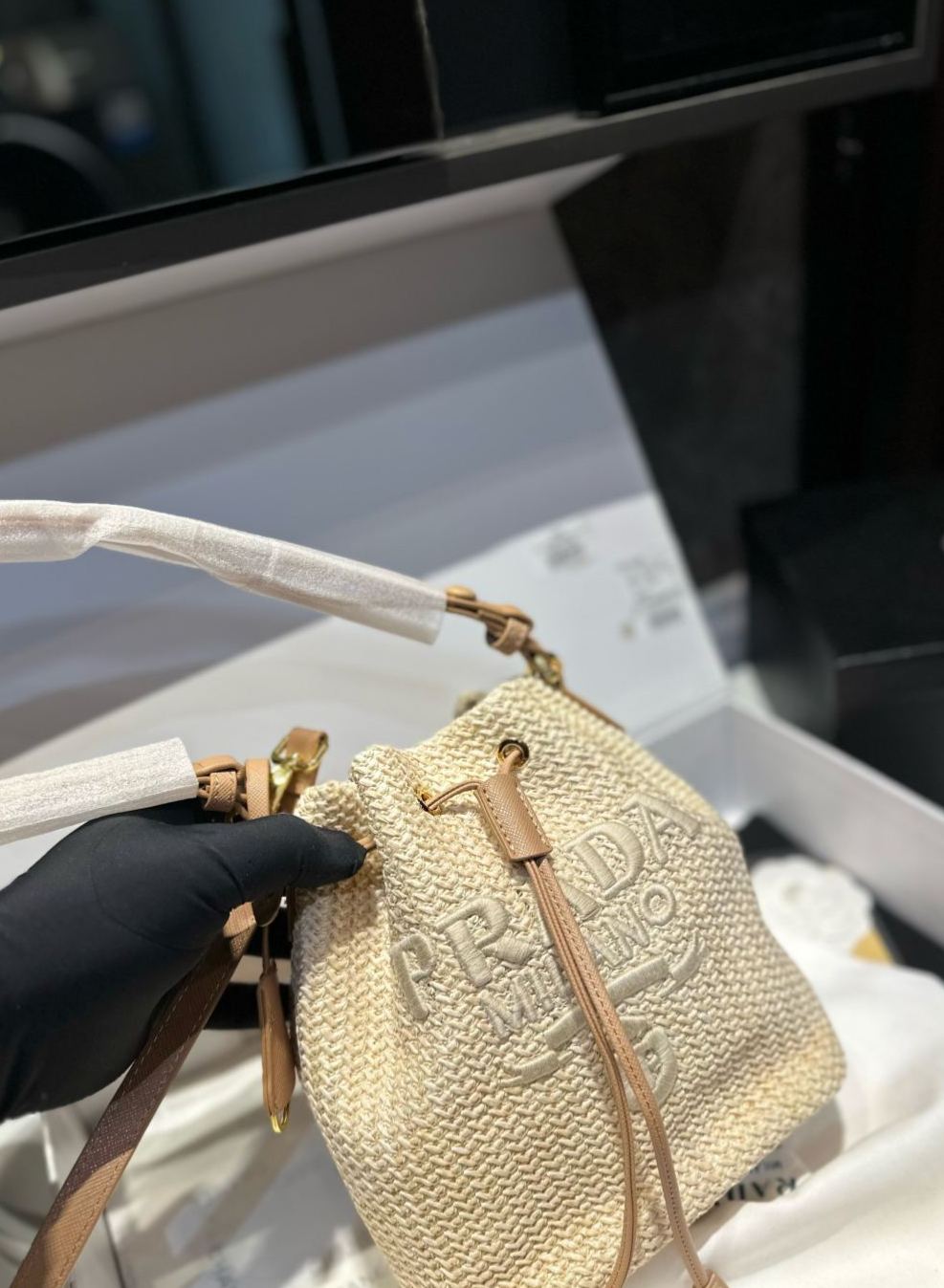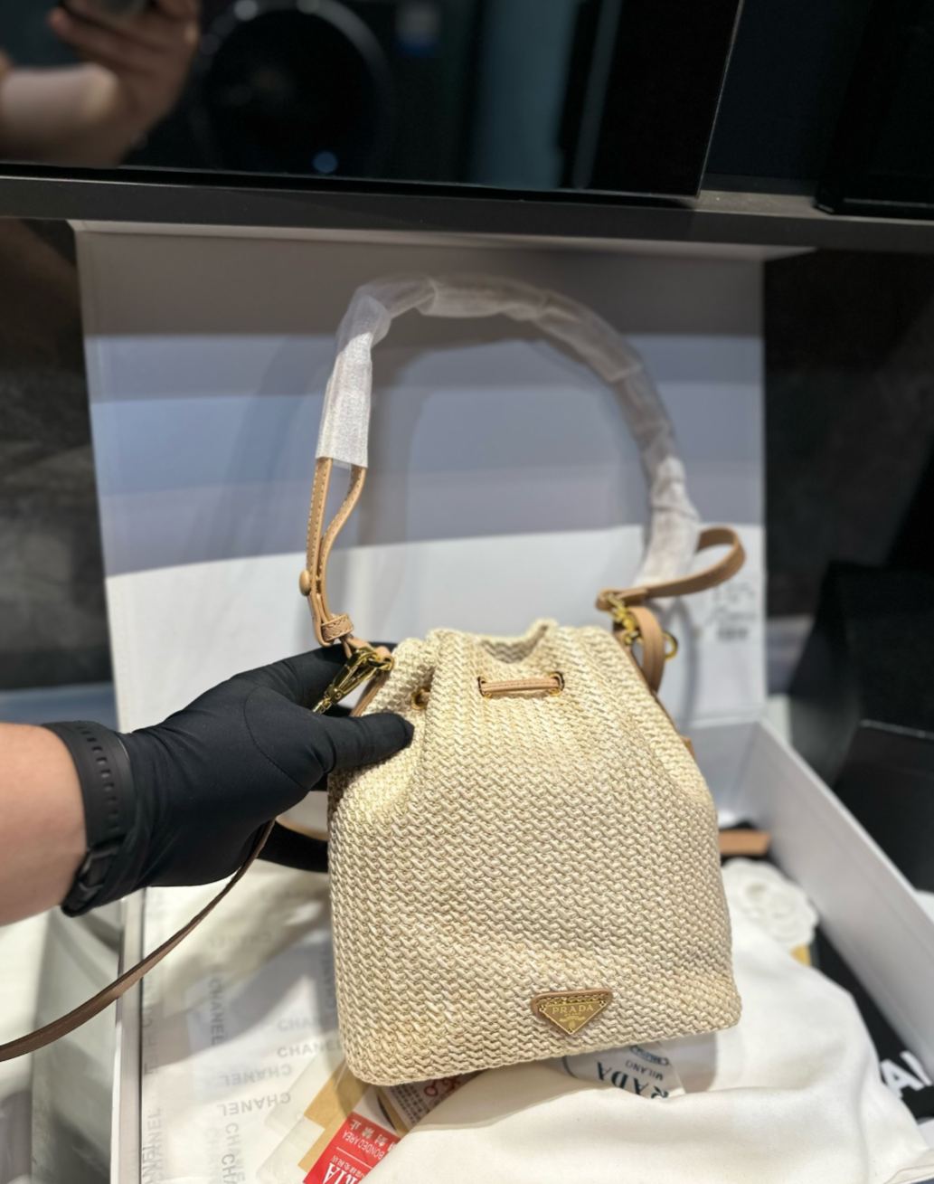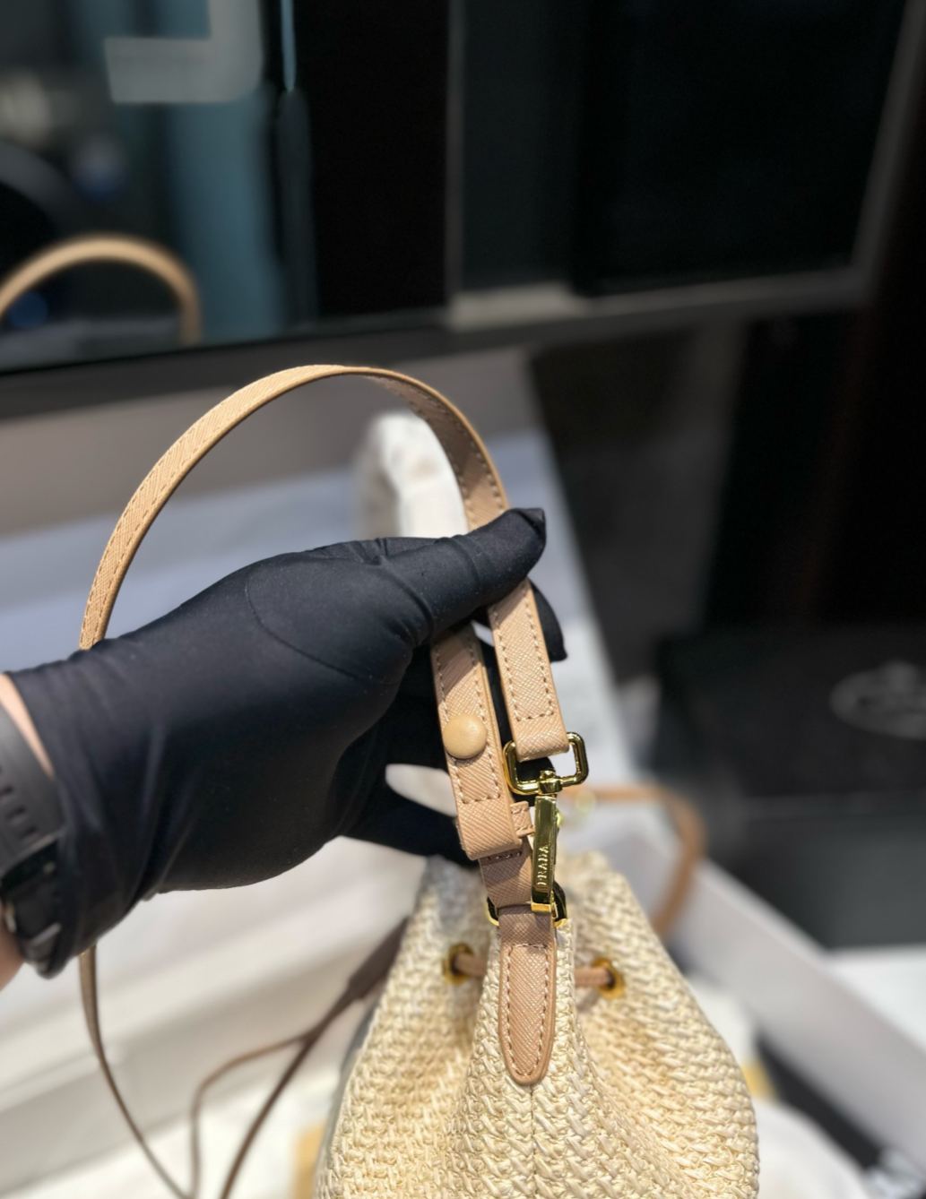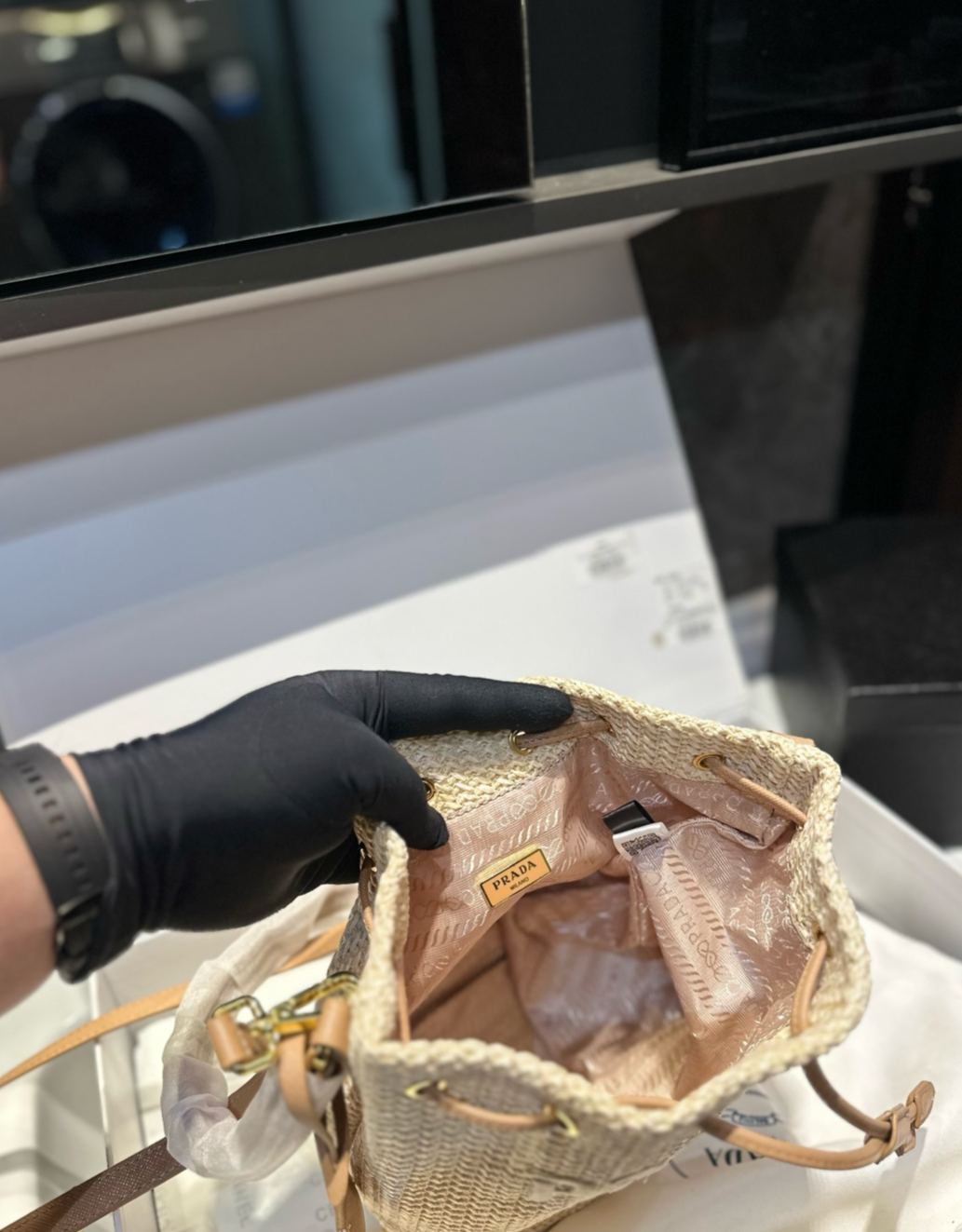 プラダ独自のレザー編み込み技術により、立体感あるウェーブ模様を形成。職人が一枚ずつ手作業で仕上げる芸術的なディテールが、他にはない高級感を醸出。 -