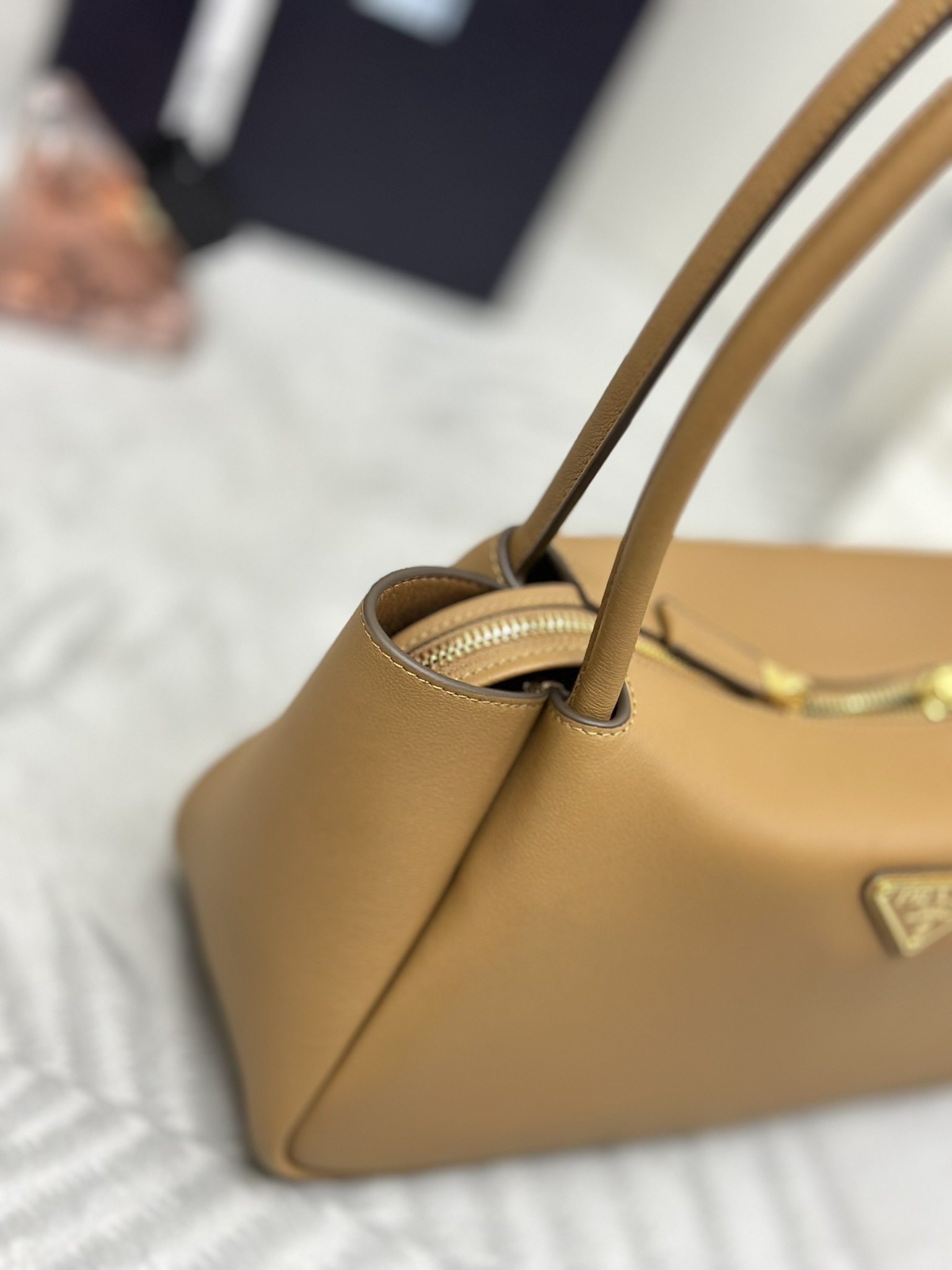 プラダの新作「1BA444」は、輸入高級牛革(スムースレザー)と内側のシープスキン裏地で仕上げた多機能ショルダーバッグ。縦28x横18xマチ11cmの大容量ボディに2つの仕切りポケットを備え、ビジネス書類から日常のエッセンシャルアイテムまで整理して収納可能。ハンドルと調節可能なショルダーストラップを装備し、手さげのエレガントさと肩掛けのカジュアルさを自由に切り替え。メタリックハードウェアの輝きがシンプルなデザインに洗練されたアクセントを添えます。