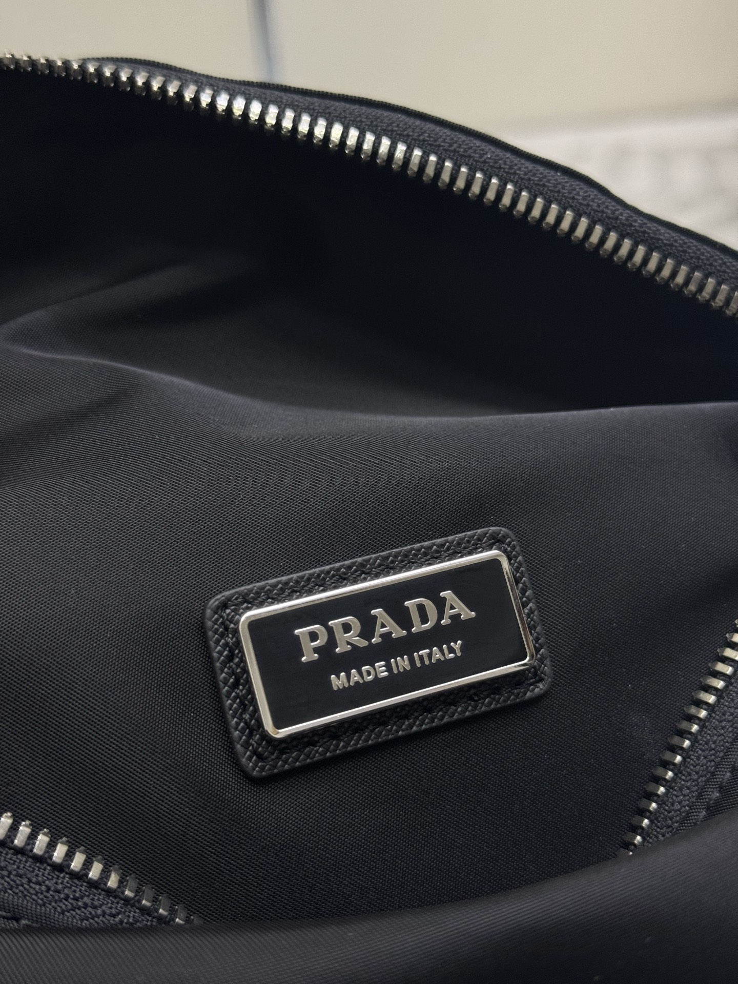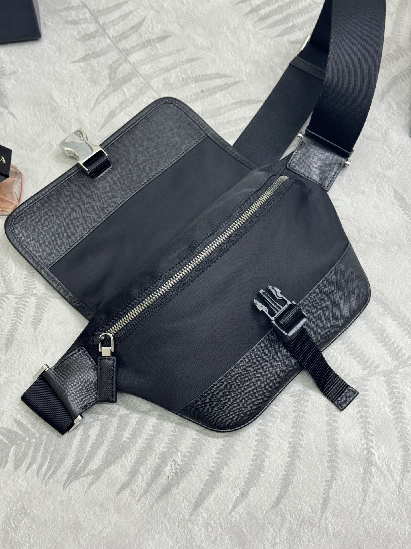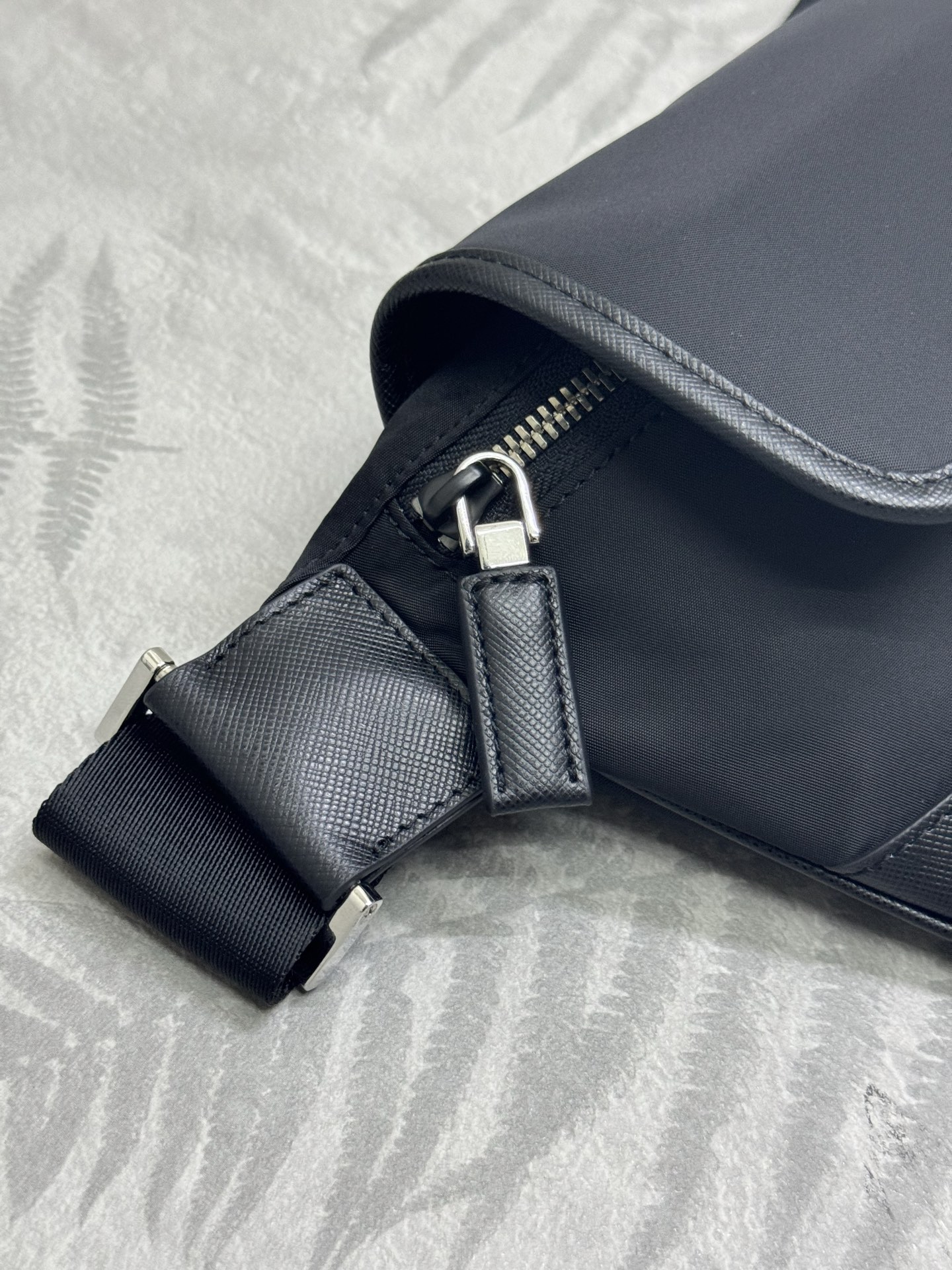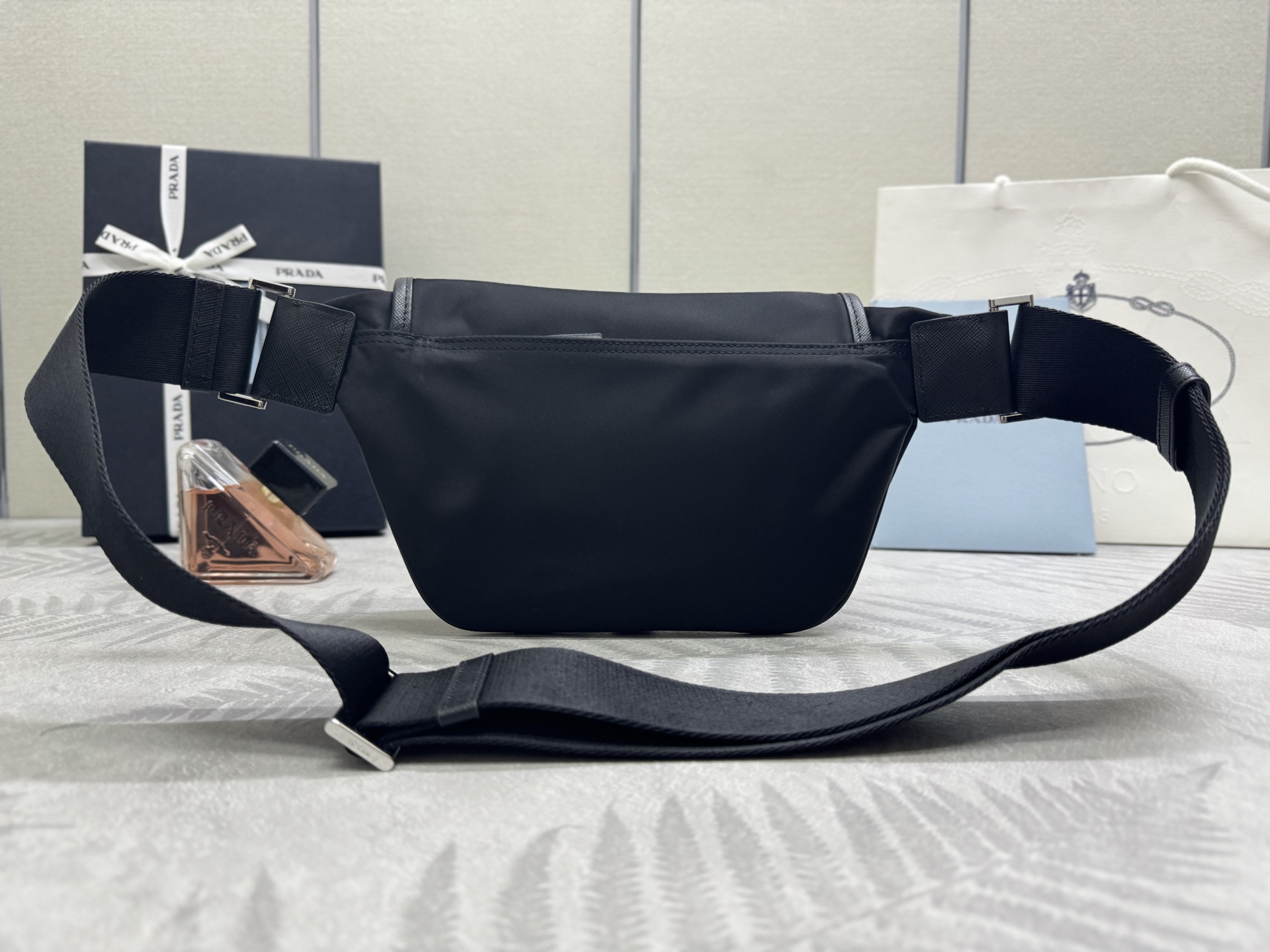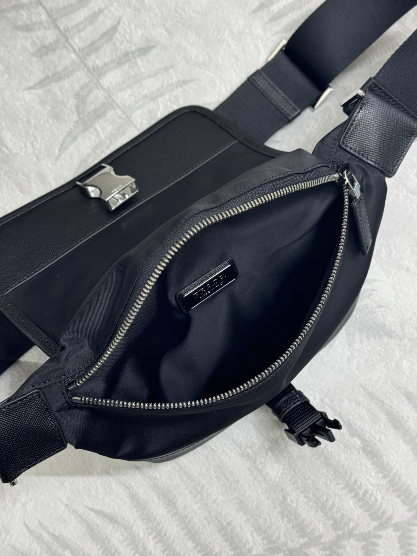 プラダの象徴であるテッスートナイロンを基調に、耐水性・軽量性を保持。レザー縁取りで高級感を付与し、日常使いに最適。 -