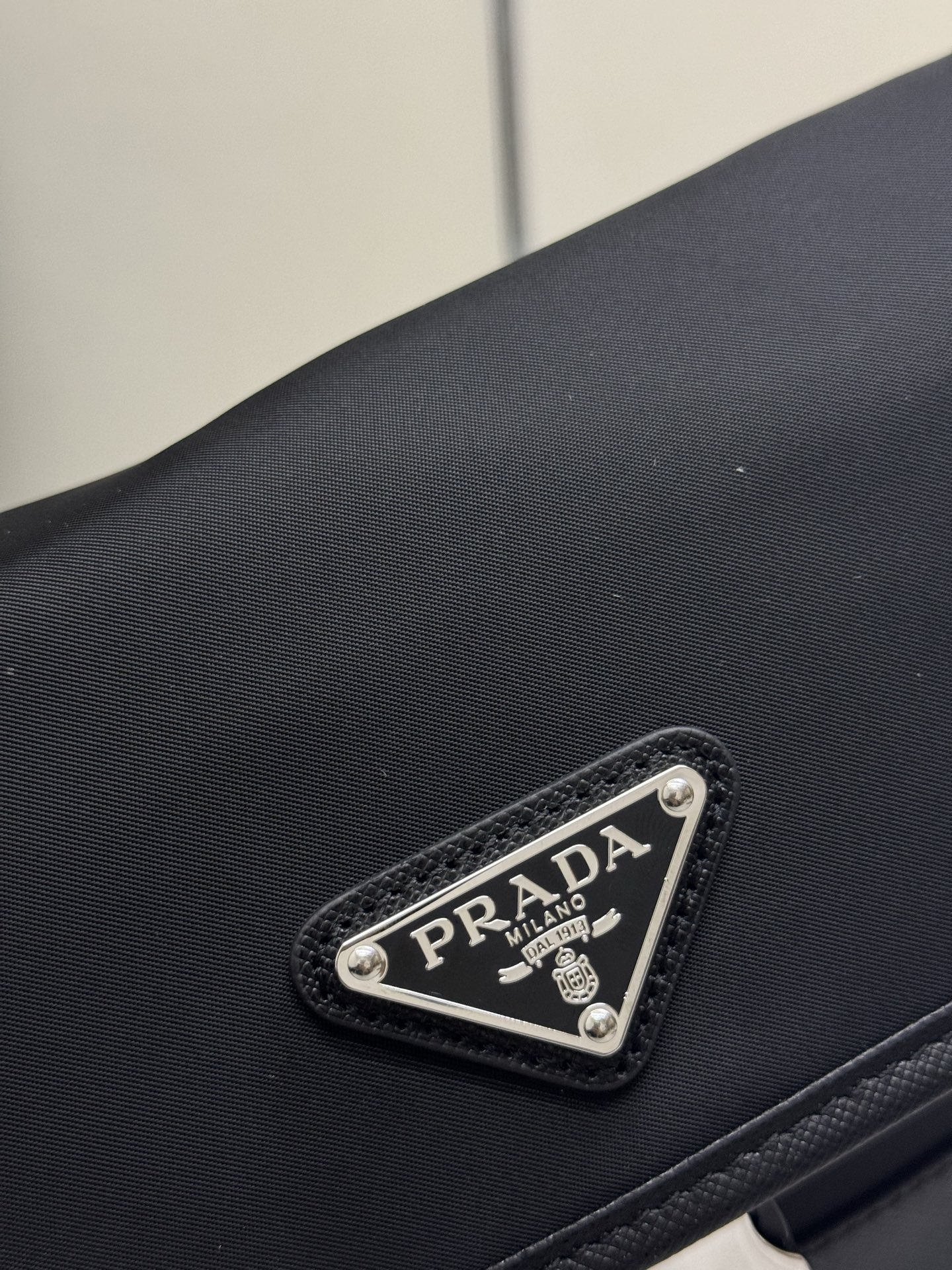 前面に配置したエナメル加工の三角形メタルロゴが、ミニマルデザインにプラダのクオリティを刻印。 -