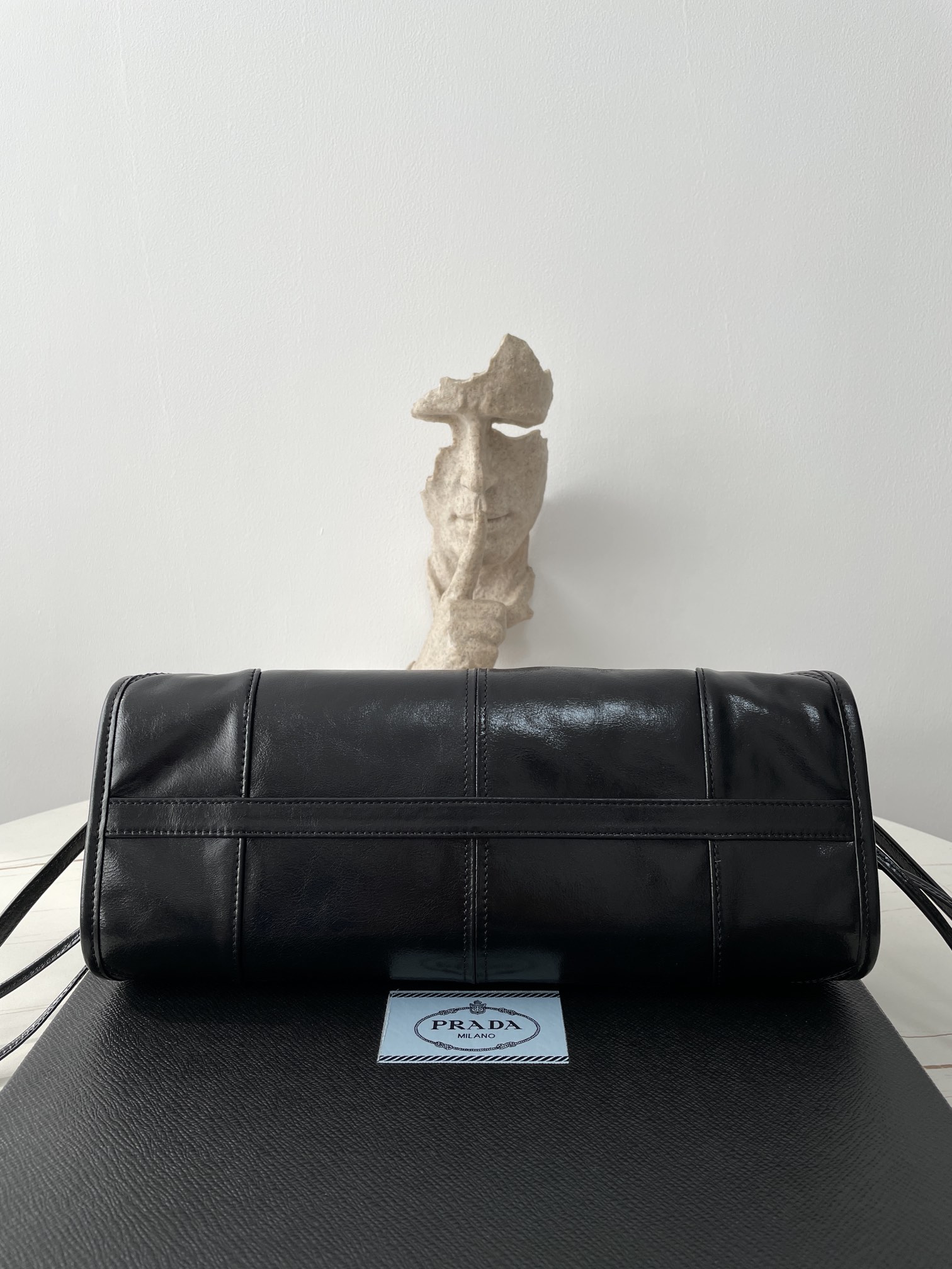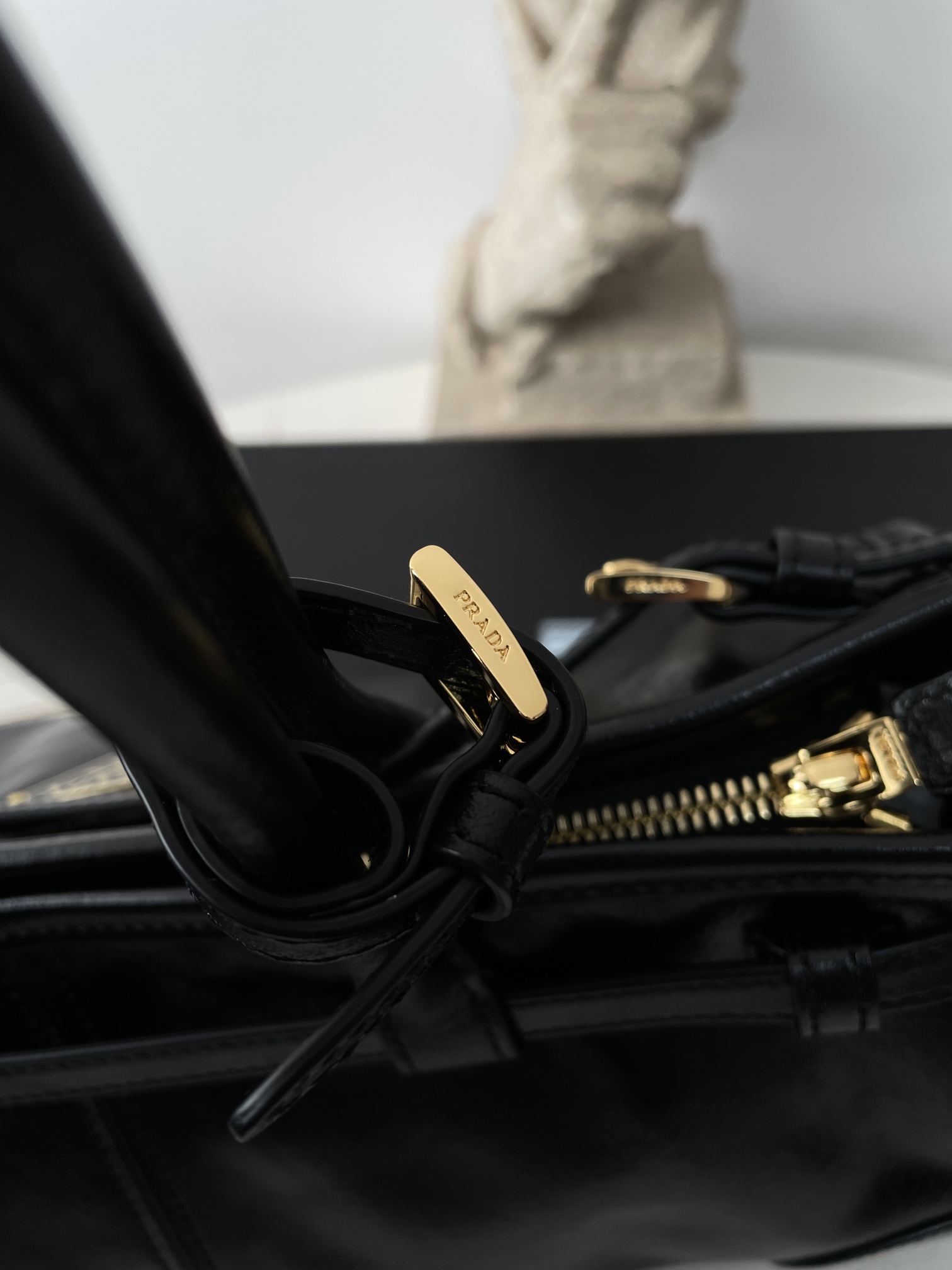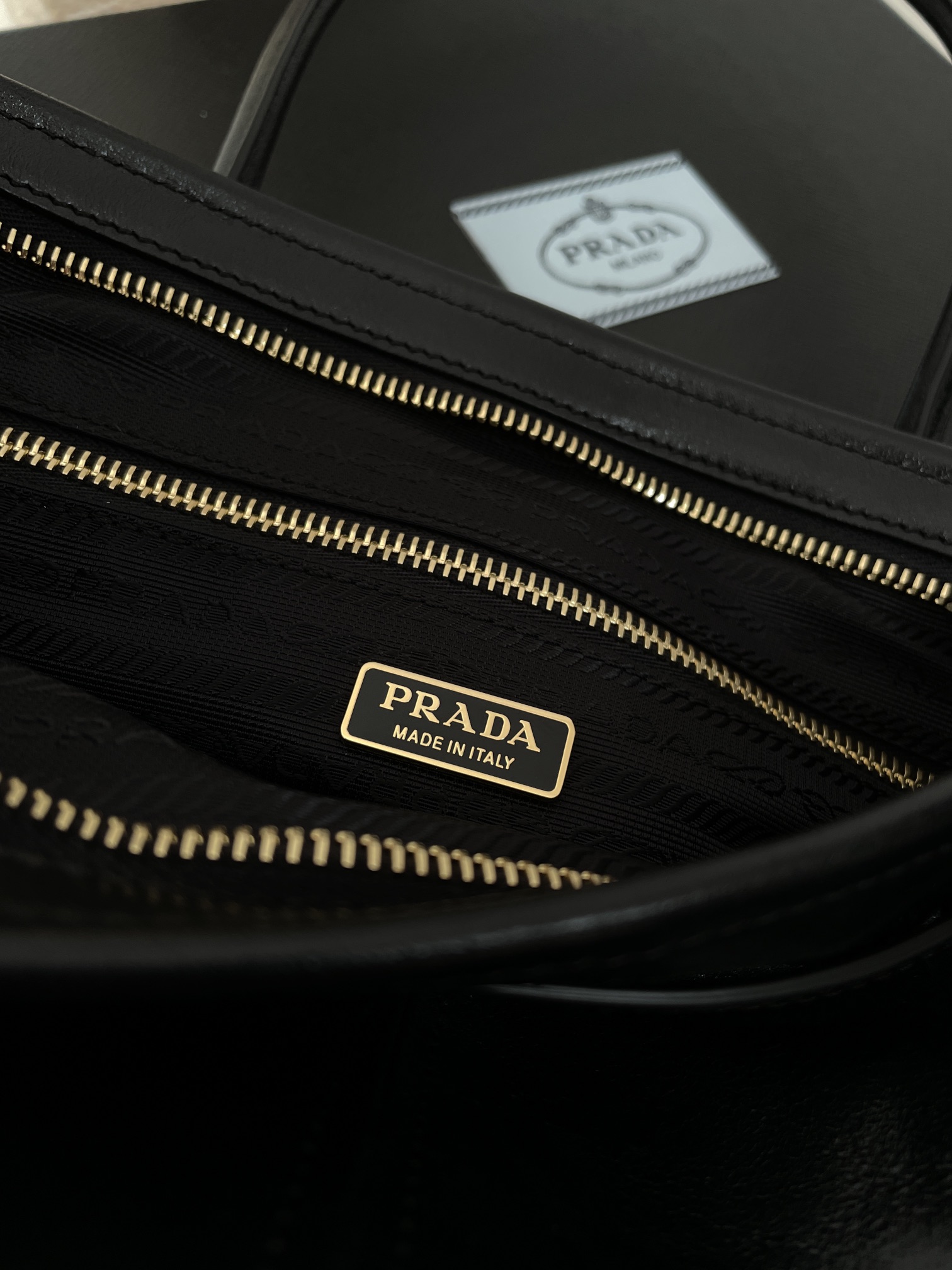 前面に施された三角形の金属ロゴプレートと内側の「PRADA MILANO」刻印が、本物の品質を証明します。 -