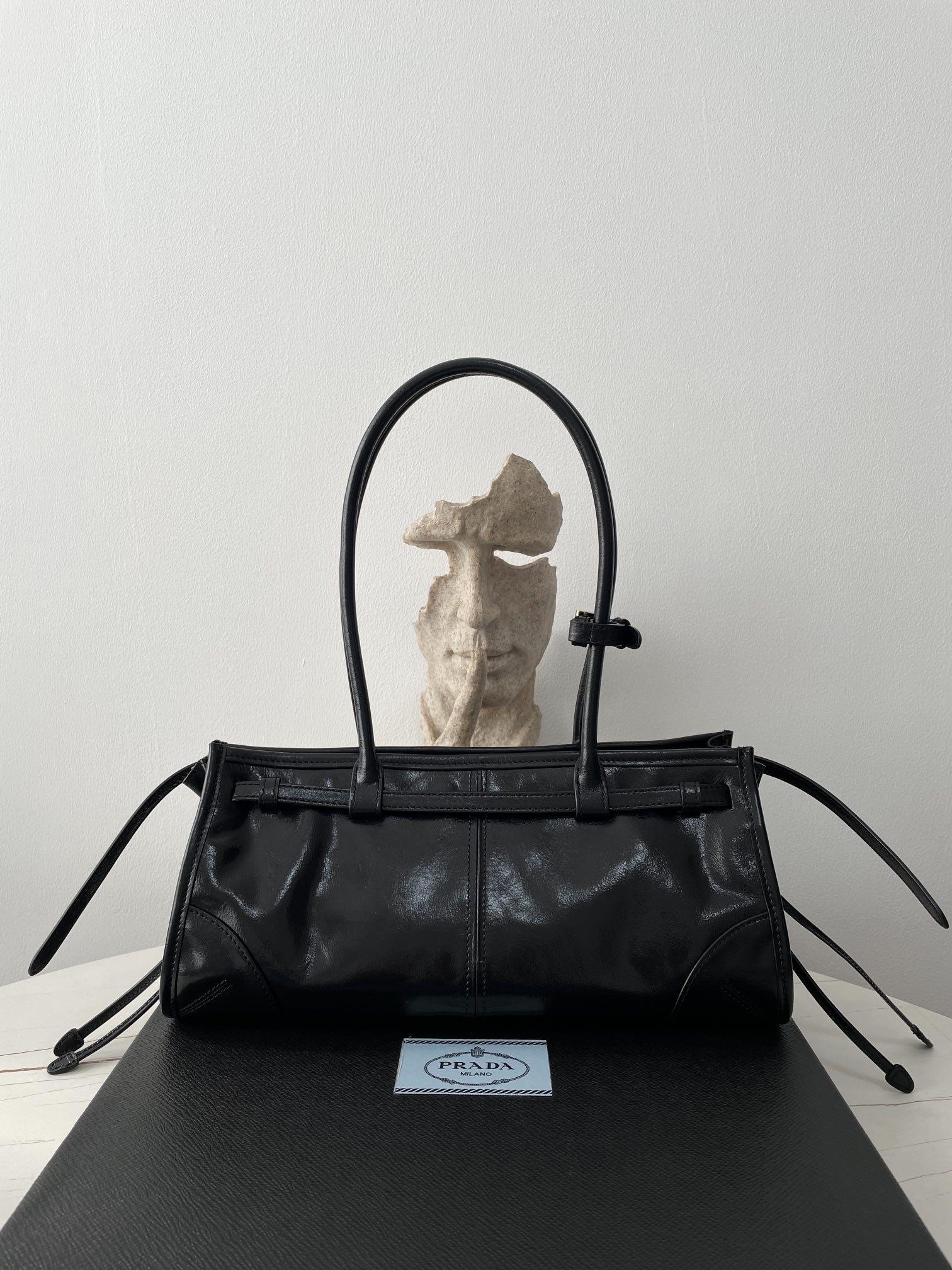 プラダのSoft Lux Bagは、エレガントなシルエットと洗練されたディテールが特徴のトートバッグです。なめらかなレザー素材とソフトな質感で、日常使いから特別な日のスタイリングまで幅広く対応。中サイズ(縦28cmx横35cmxマチ13cm)で収納力がありながら、軽量設計が魅力。内側にはプラダのアイコニックなロゴが施され、トップハンドルと着脱可能なショルダーストラップで多様な持ち方が可能です。