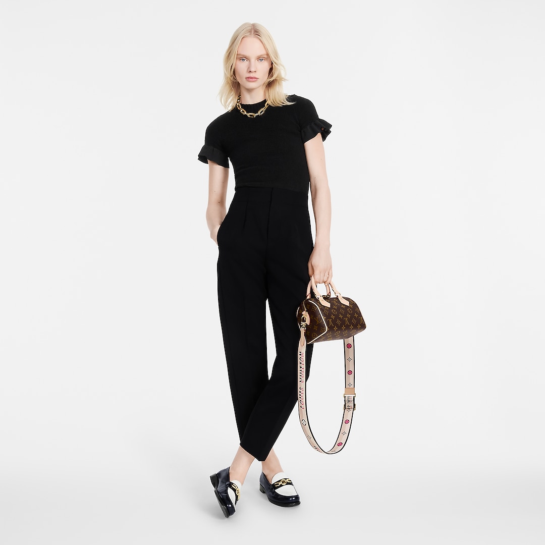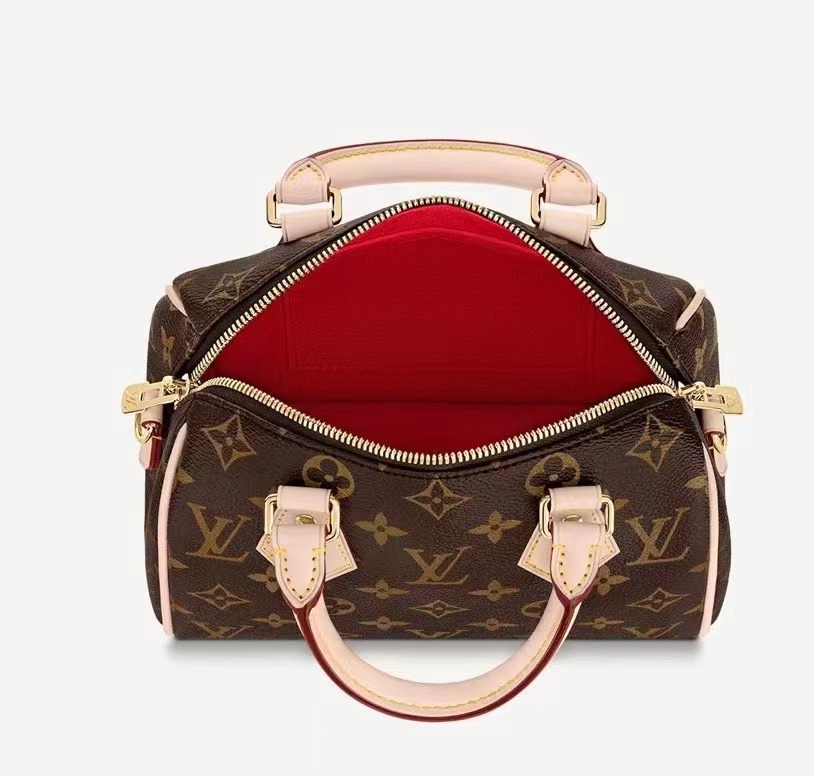 伝統的な旅行鞄スピーディをミニチュアサイズに仕上げたスピーディバンドリエール 20。モノグラムキャンバスにヌメ革のトリミングを施して仕立てました。ロール仕上げのレザーハンドルに加え、Louis Vuittonシグネチャーを織り込んだ取外しと調整が可能な幅広のテキスタイルストラップを備えています。クラシカルなデザインに、レッドのテキスタイルライニングが際立ちます。