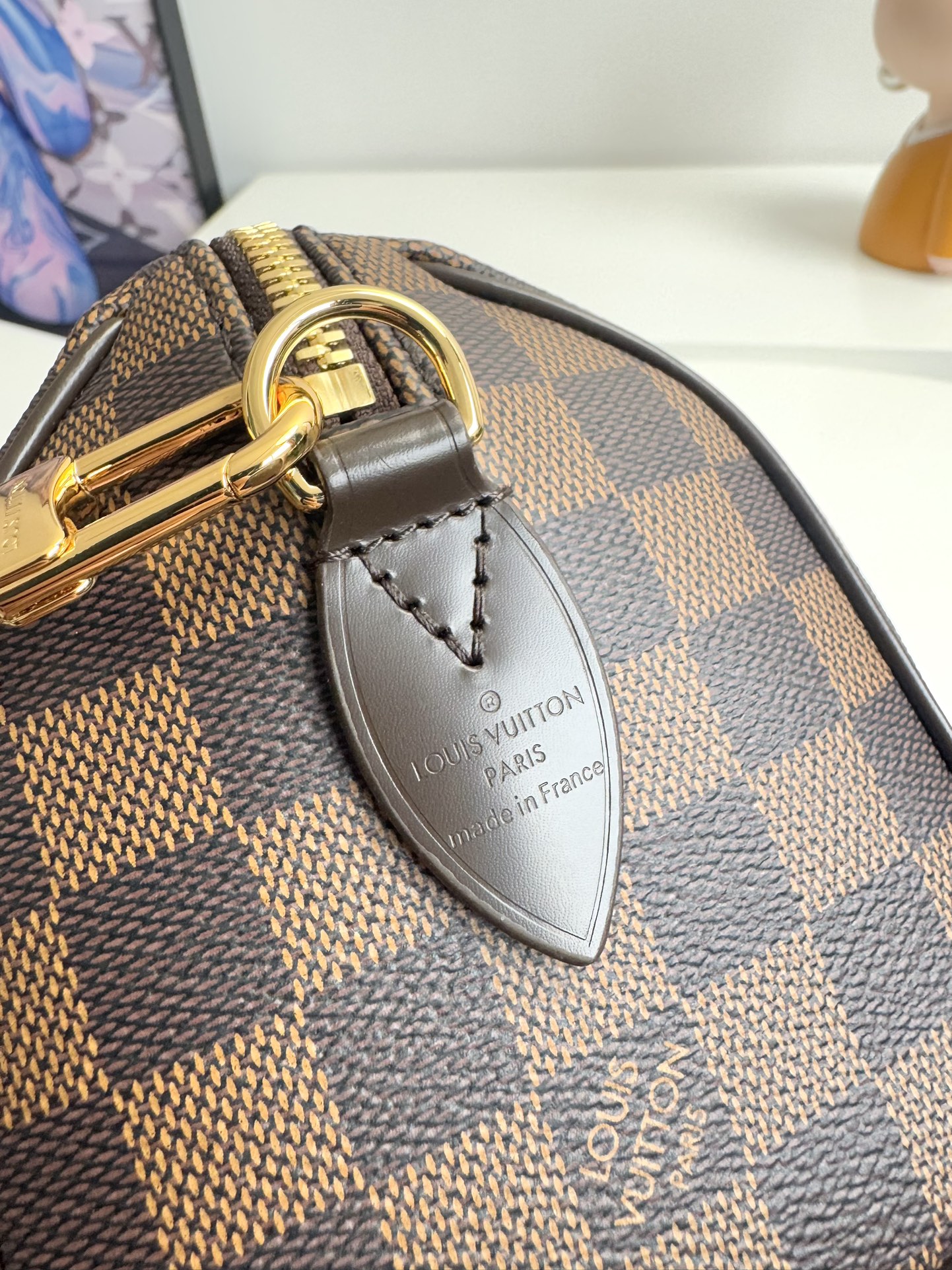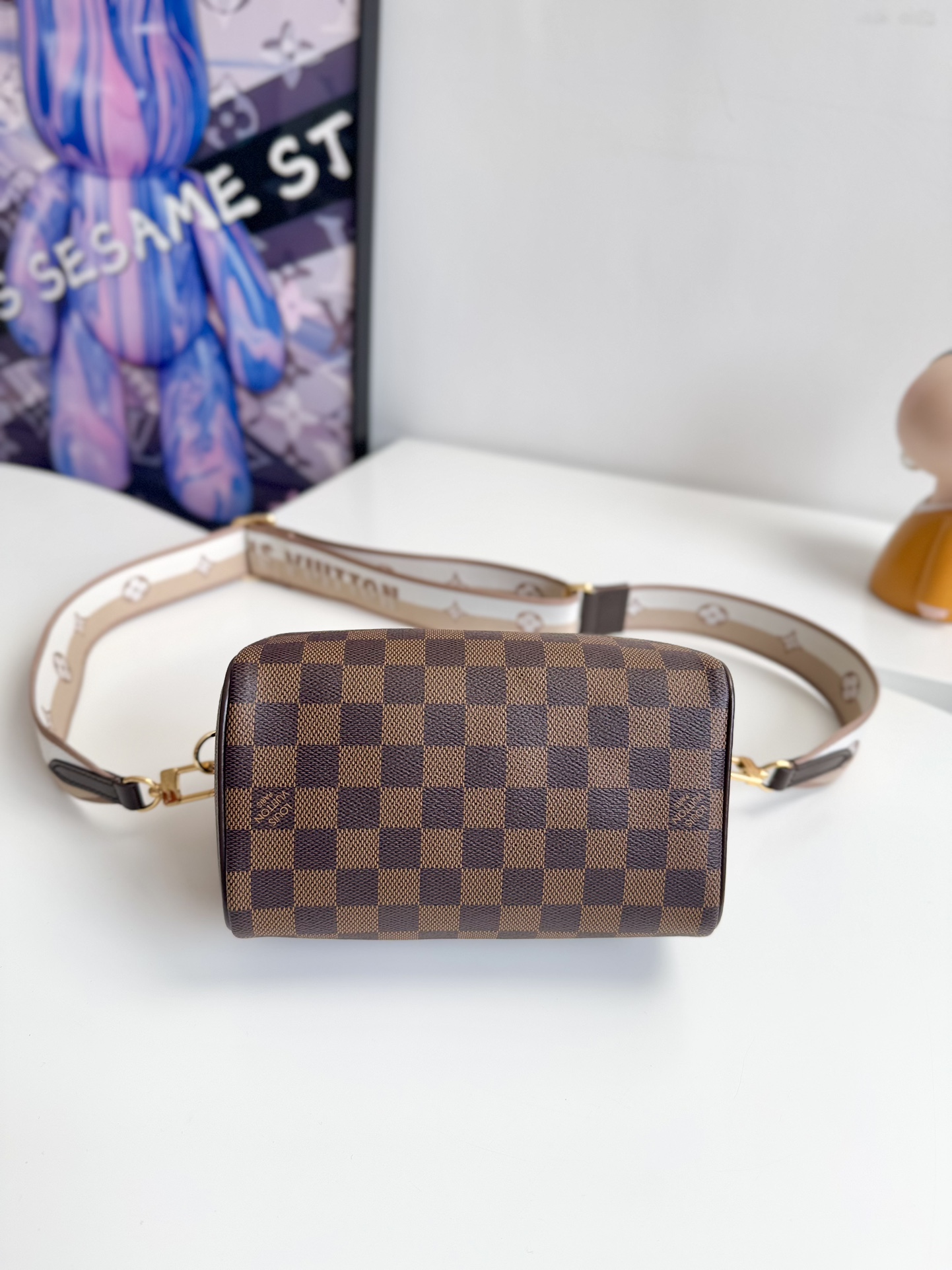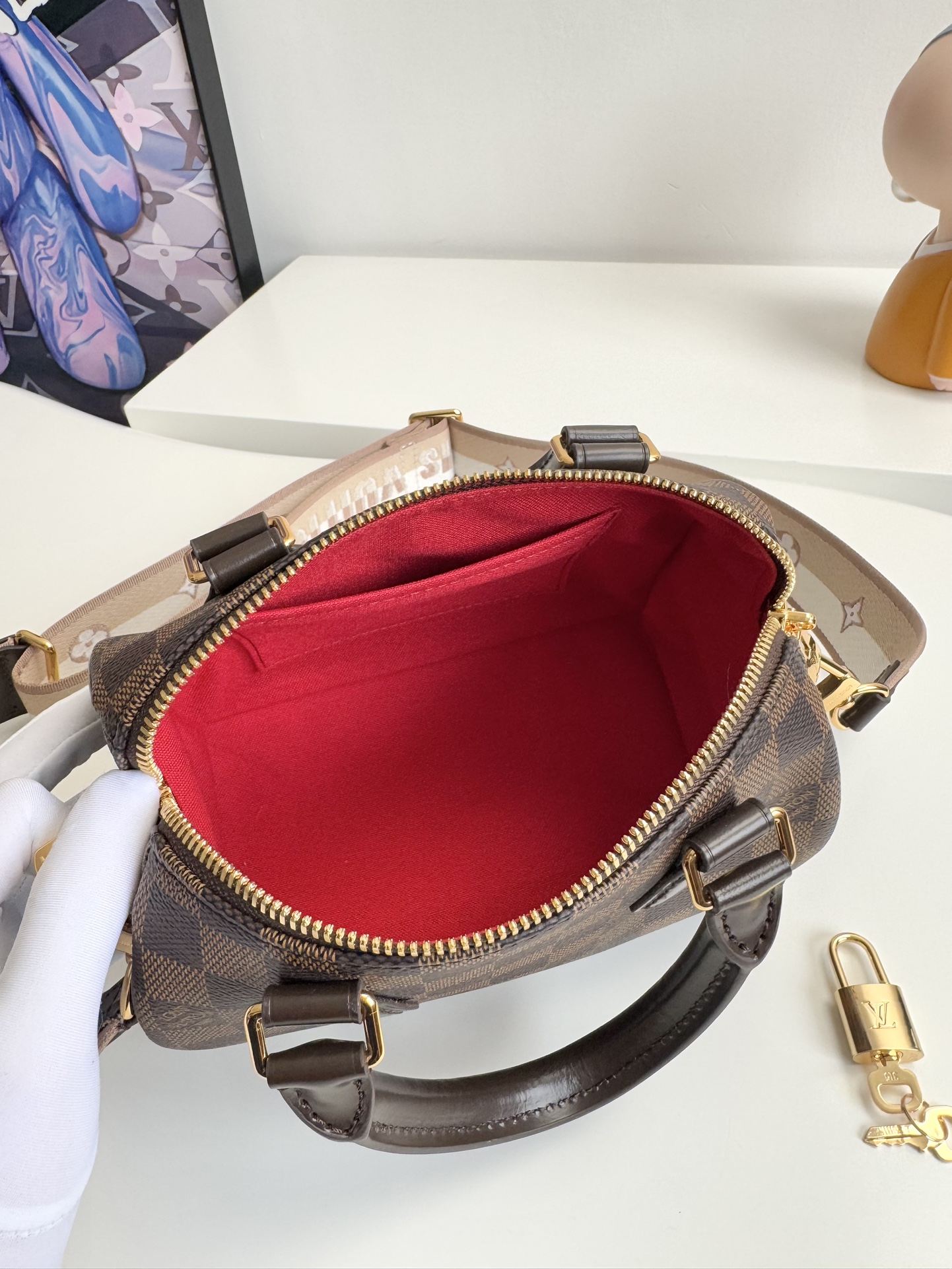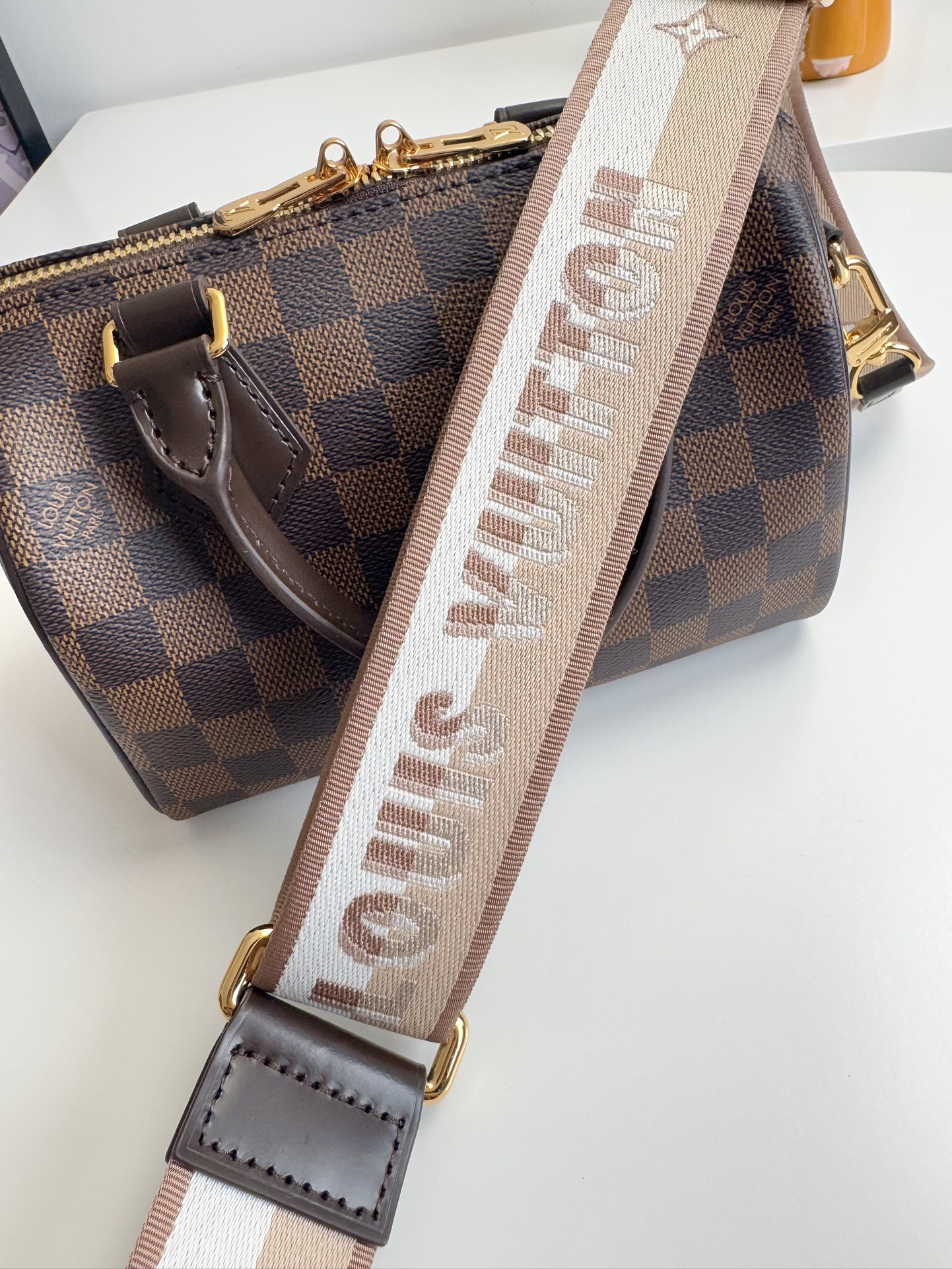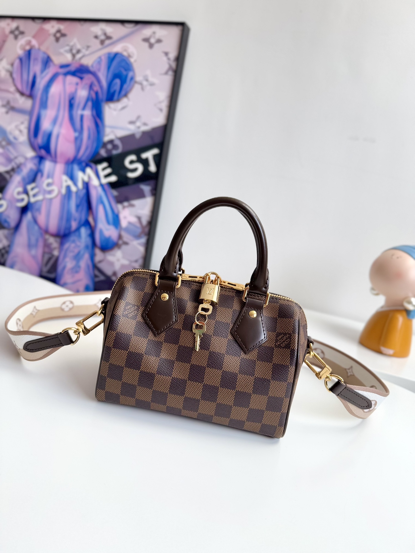 クラシカルなダミエ・キャンバスでアップデートした「スピーディ・バンドリエール 20」。チョコレートブラウンのレザーでトリミングを施し、ベージュのテキスタイルストラップを添えた、アクティブなライフスタイルにぴったりのスポーティなアイテムです。一目で分かるシェイプとゴールドカラーの刻印入りパドロック(錠前)、アイコニックなロール仕上げのトロンハンドルが、あらゆるシルエットを引き立てます。