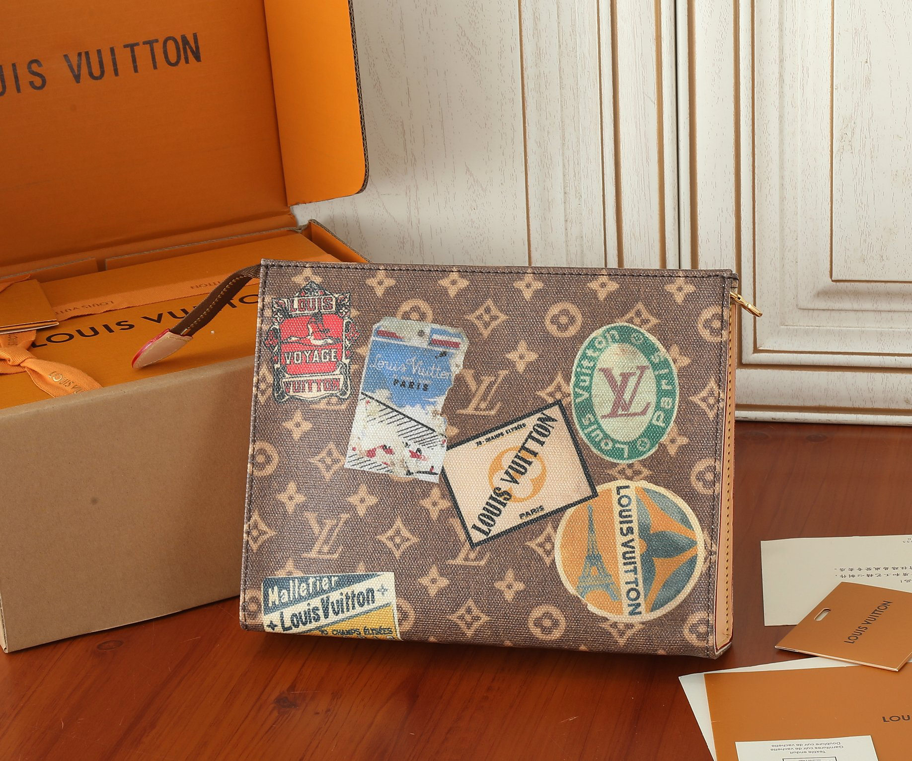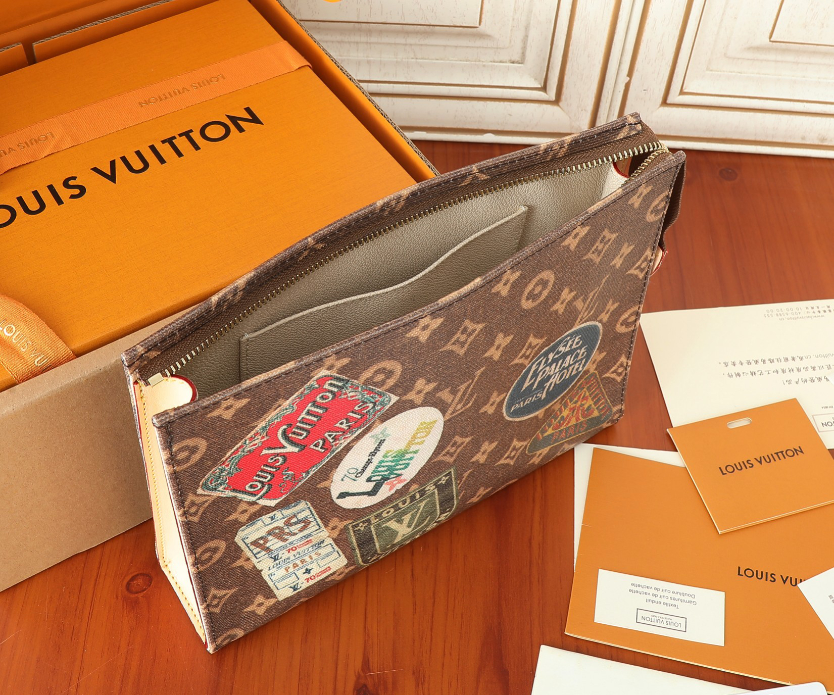 モノグラム コーティング キャンバス製のクラシックなトワレリー ポーチ。ヴィンテージ風ルイ・ヴィトン旅行ステッカーが華やかなアクセントに。内側のスリットポケットで小物を整理でき、コンパクトな手持ちサイズ(20 x 25 x 5.5 cm)で日常使いに最適。牛革トリムと洗えるライニングにより、機能性と耐久性を両立。
