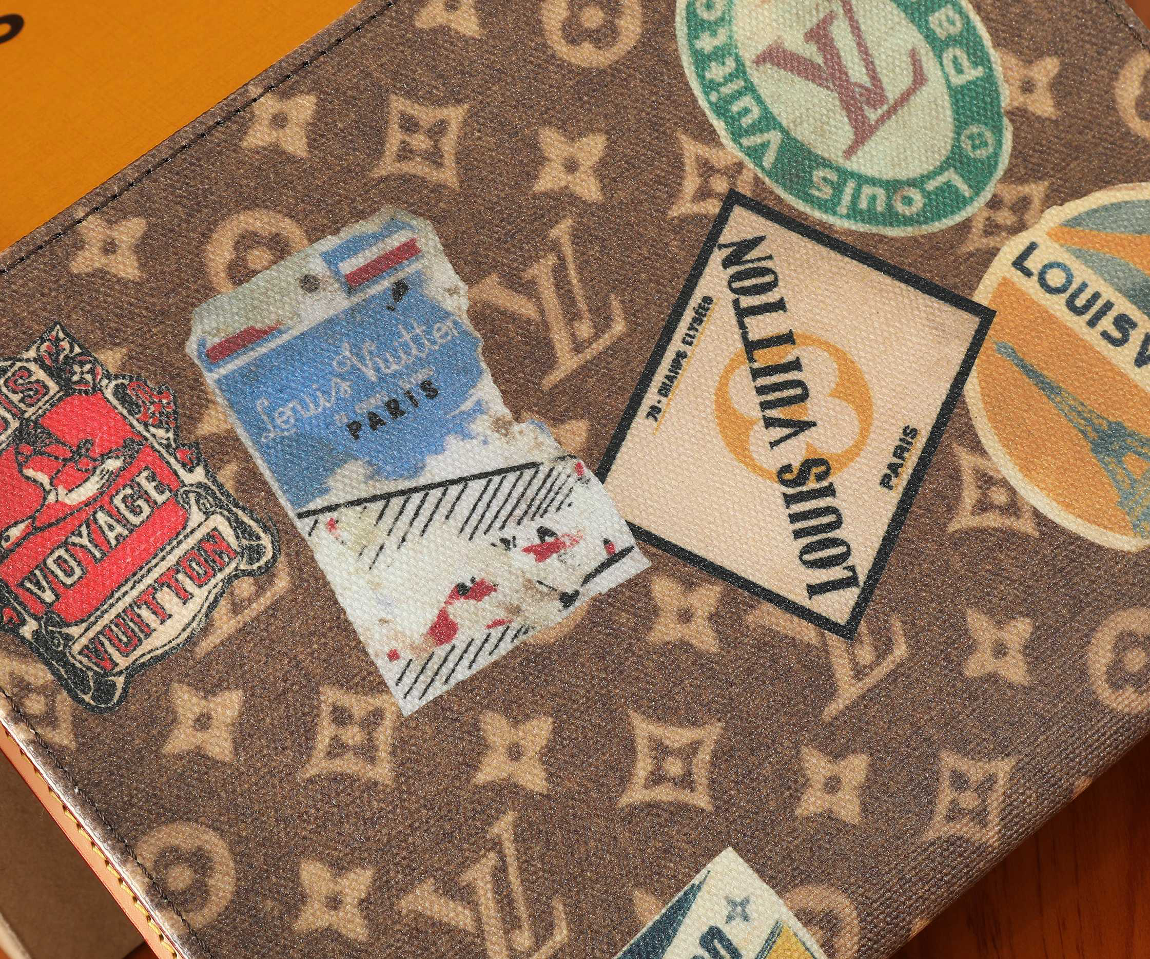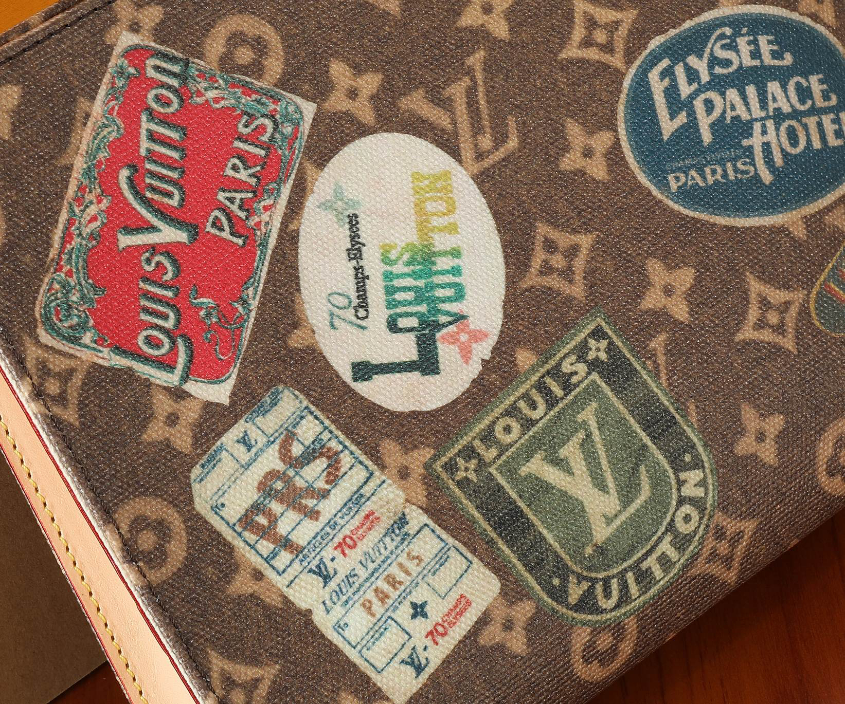 往年のルイ・ヴィトン旅行バッグを彷彿させるレトロなステッカー装飾が、上品な遊び心を演出。 -