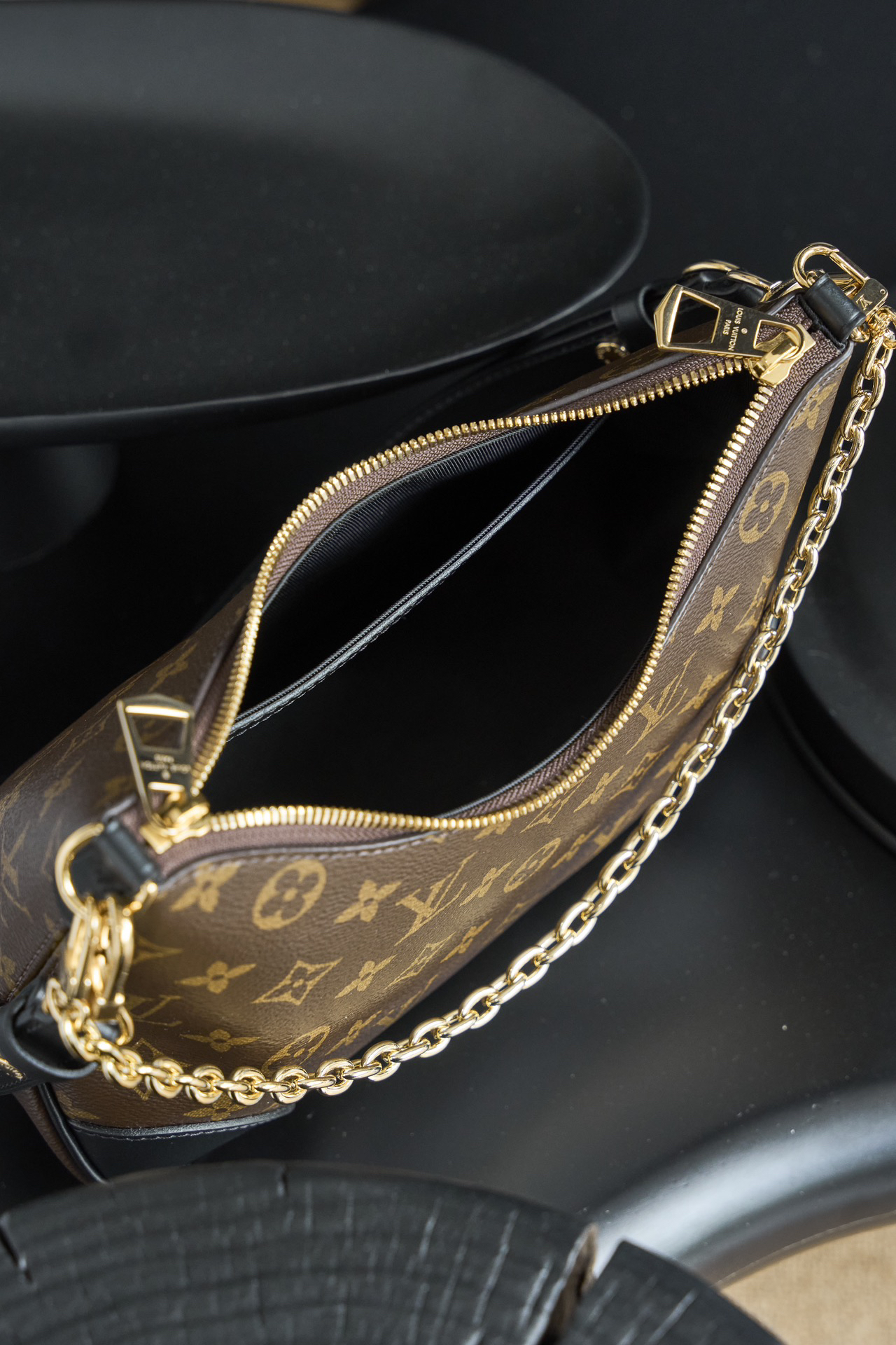 グレーメタリックチェーンとエクリプス柄のモノグラムが都市的洗練感を強調。 - 柔軟なスタイリング対応