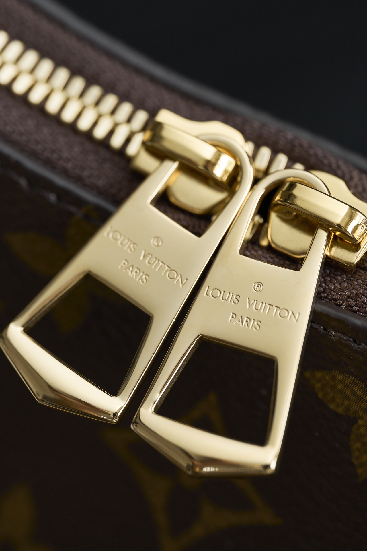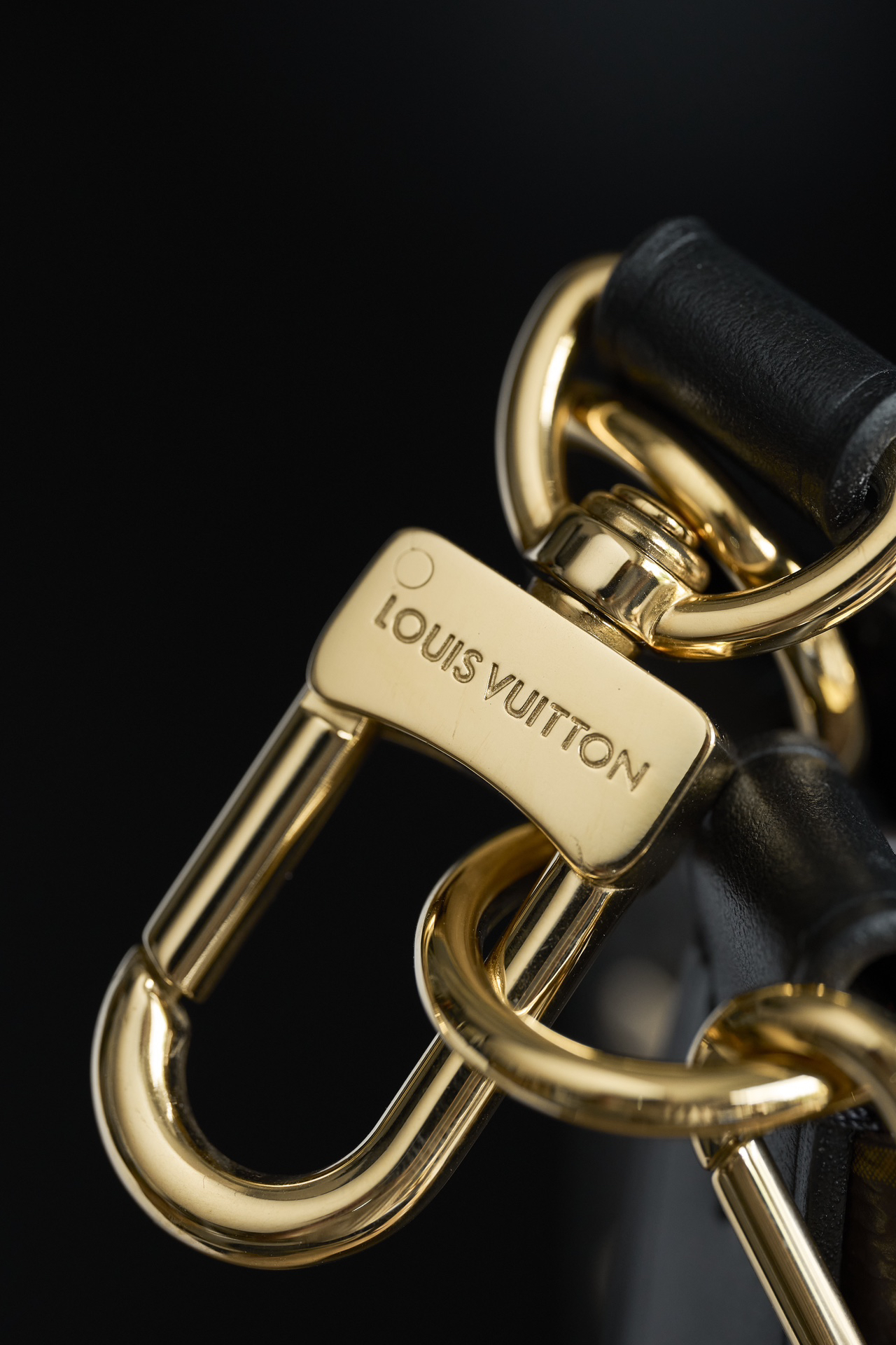 底部のレザー補強パネルと金メッキLVロゴが高級感を演出。
