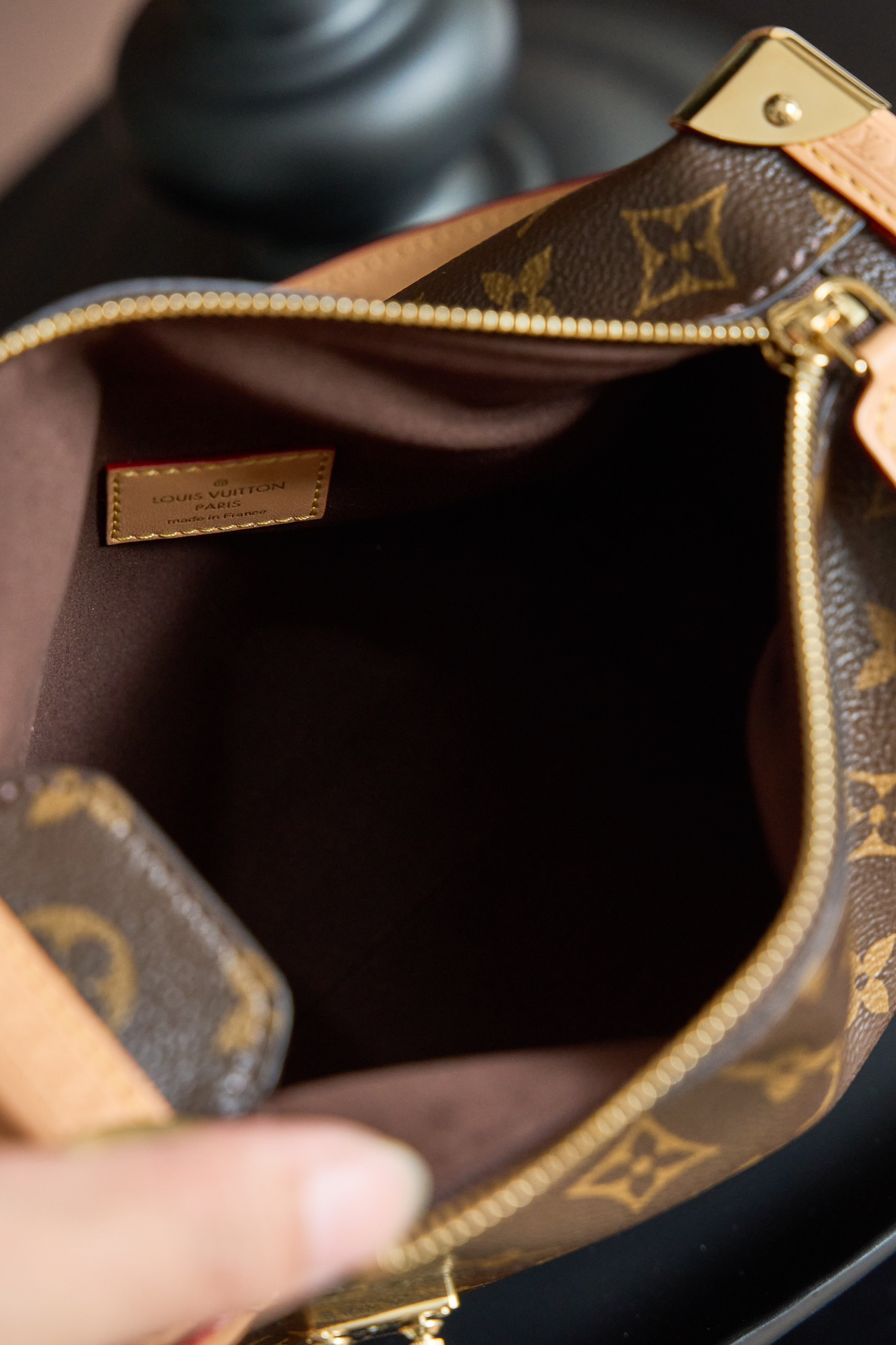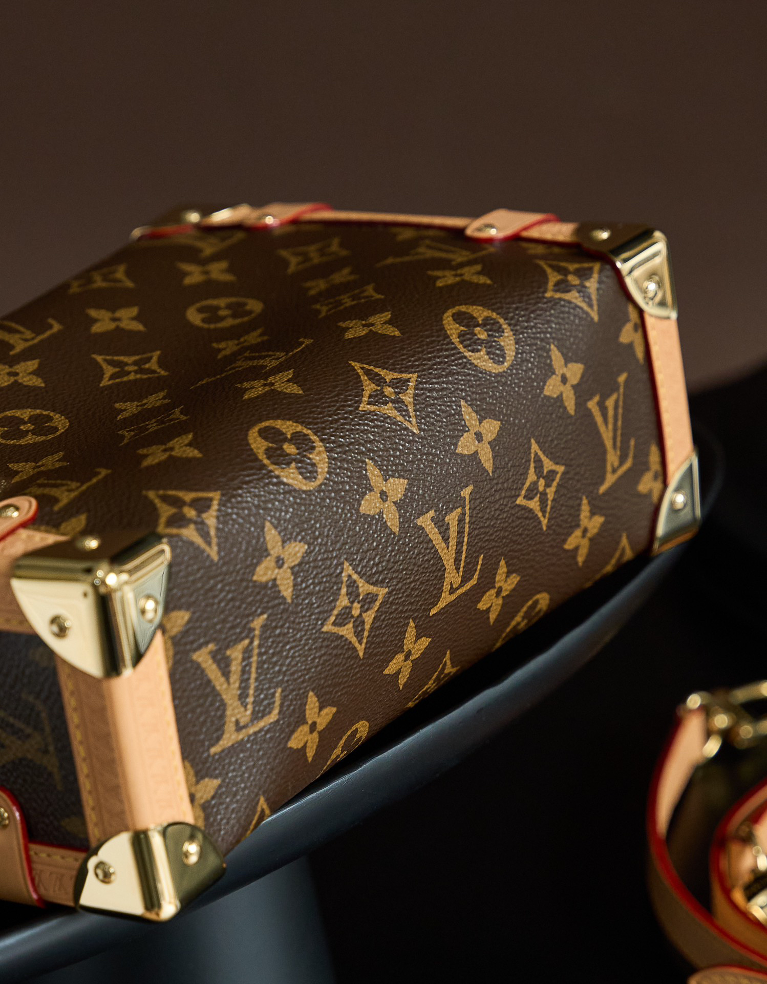 モノグラムキャンバスとヴァシュロンレザーを組み合わせたトランク型ハンドバッグ(縦24.0x横30.0xマチ18.0cm)。シンボリックなパッドロック留めと可動式ハンドルでクラシックな旅行用具の美学を再現。アジャスタブルショルダーストラップ(最大48cm)付きで手提げ/斜め掛け両用可能。