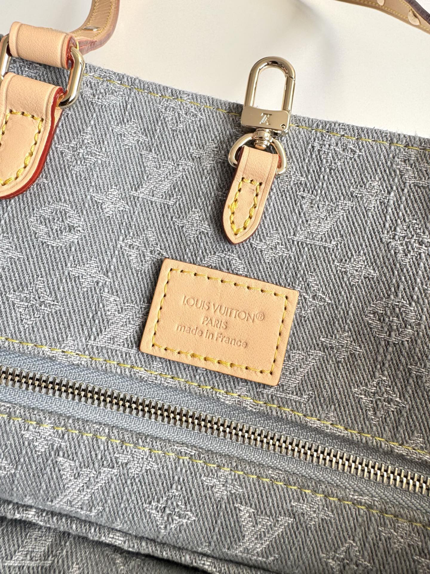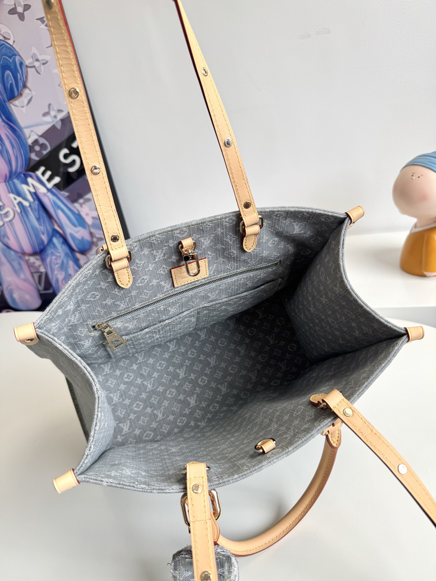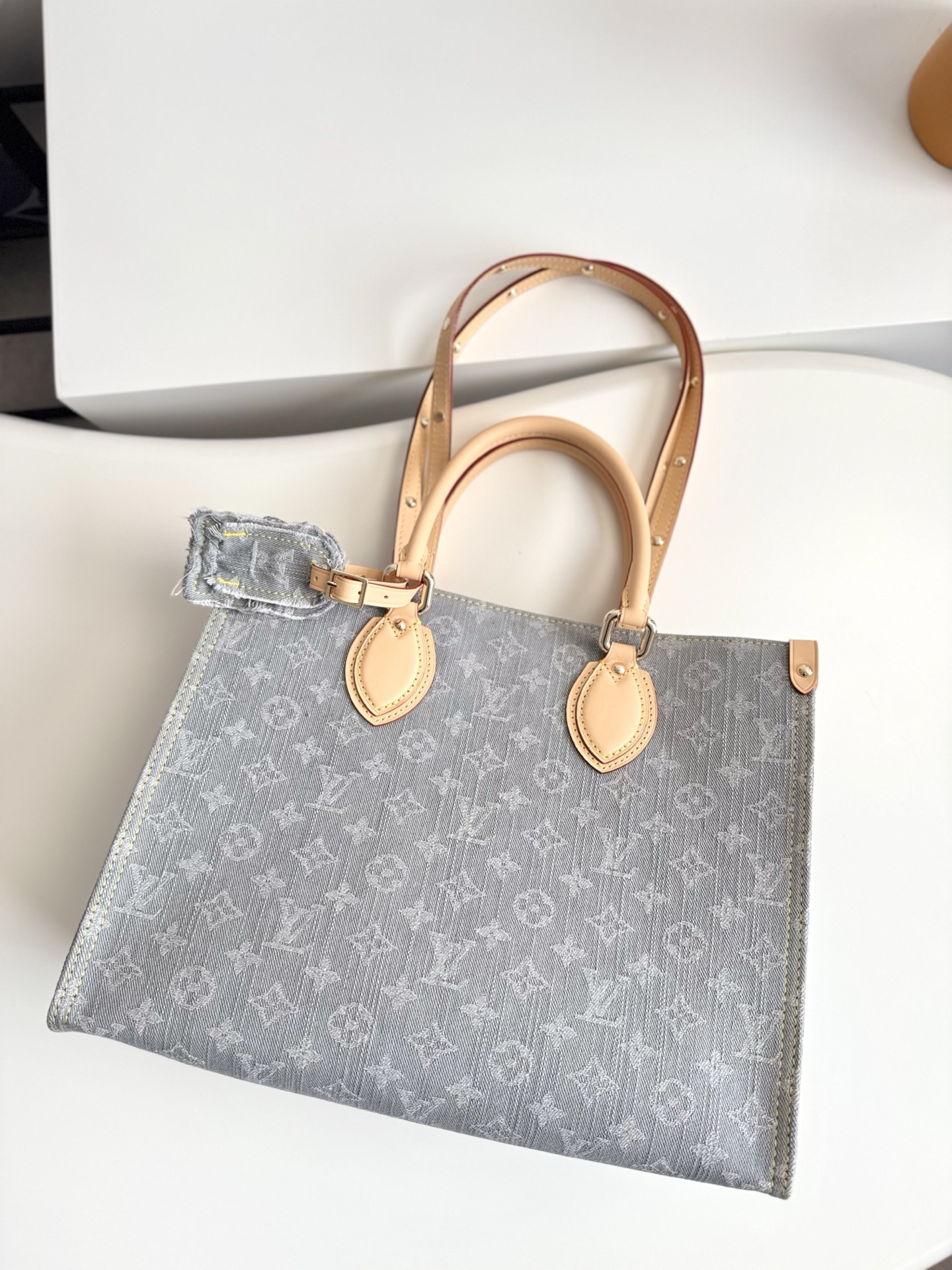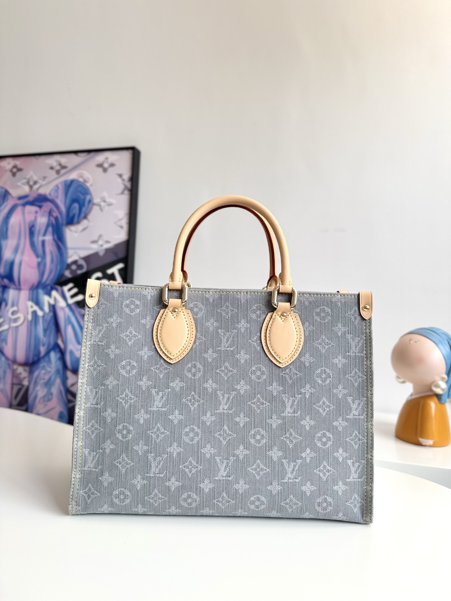 LOUIS VUITTONの「OnTheGo MM」は、モノグラム帆布とモノグラムリバース帆布を組み合わせた大容量トートバッグ。サイズは35x27x19cmで、14インチノートPCや日常小物を収納可能。Toronハンドルと取り外し可能なショルダーストラップを備え、手持ち・肩掛けの2WAYスタイルに対応。内側にはファスナーポケットとオープンポケットを配置し、実用的な収納力を実現。