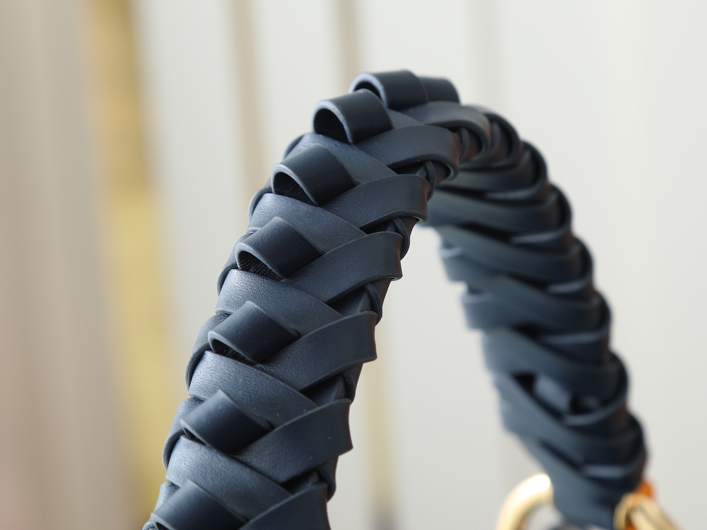 マルチウェイ着用:編み込みレザーハンドルでショルダーや肘掛けスタイルに対応。
