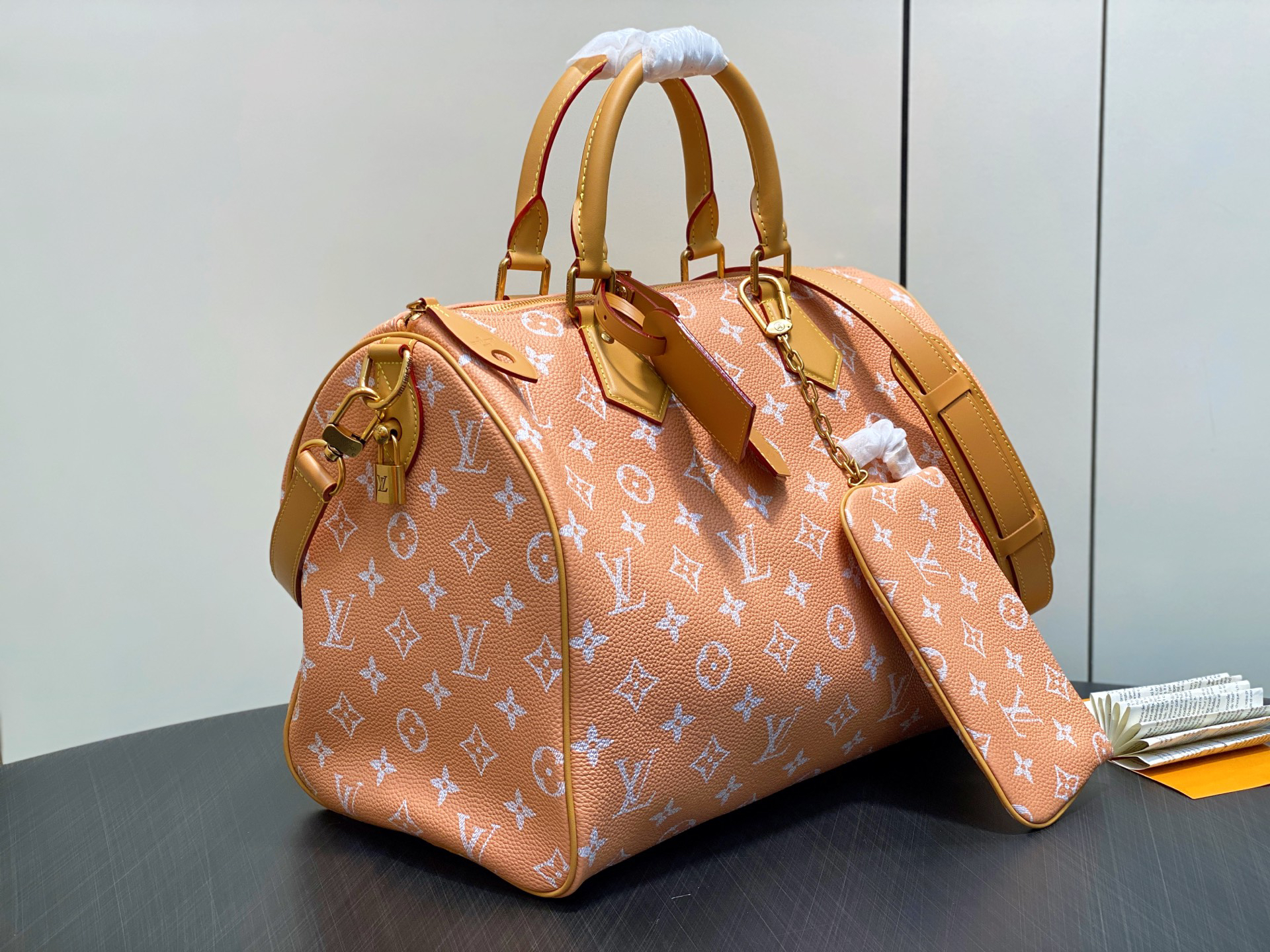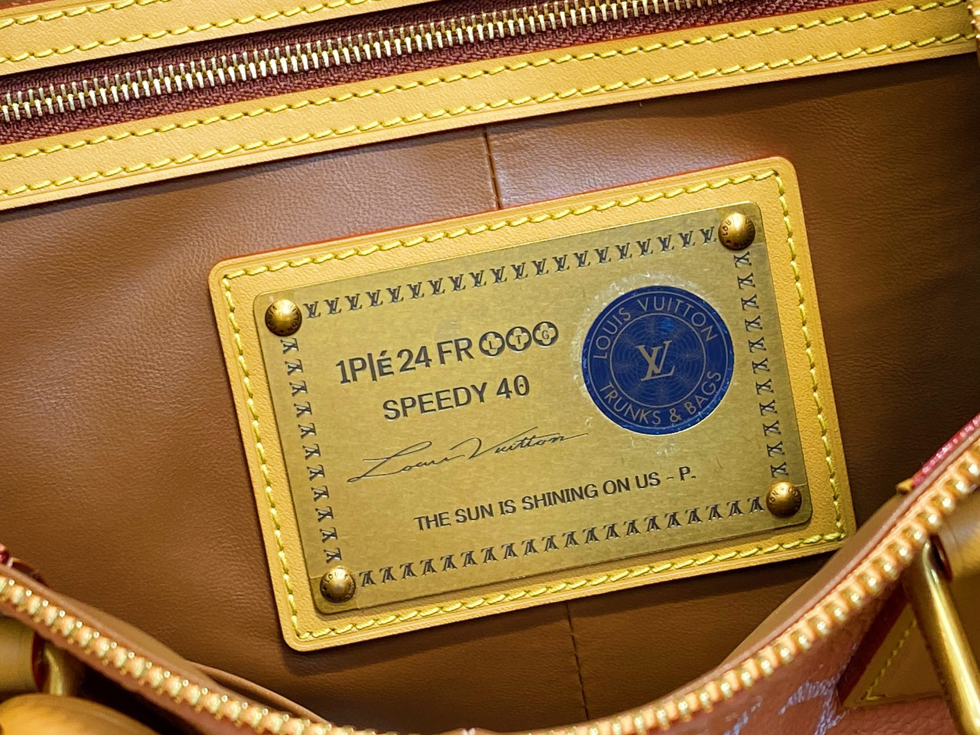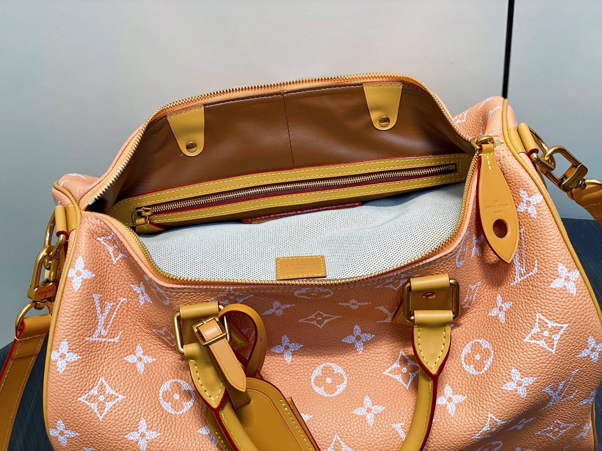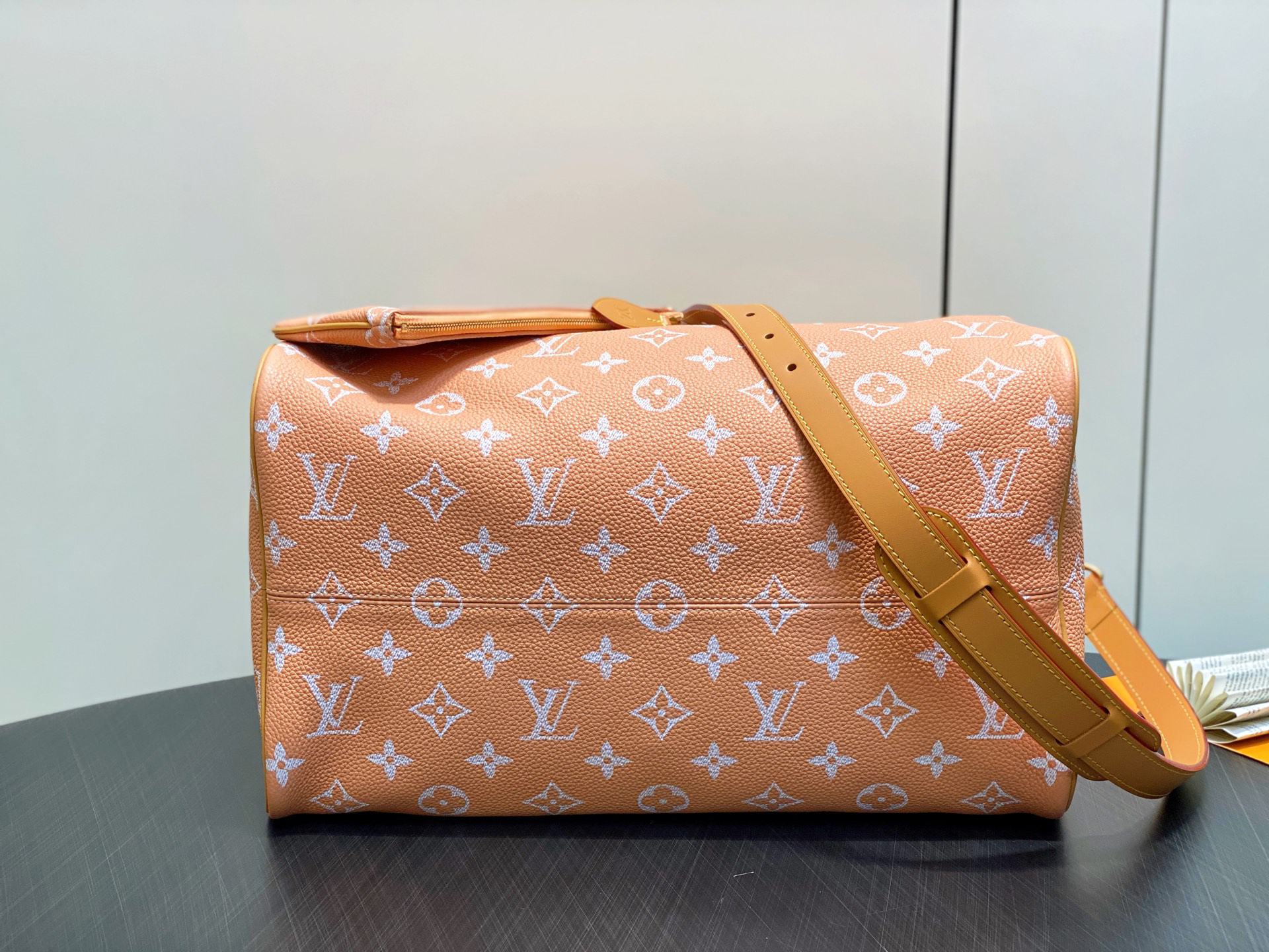 LOUIS VUITTONの「Speedy P9 Bandoulière 40」は、クリエイティブディレクターPharrell Williamsによる2025年春夏コレクションの目玉アイテム。モノグラム柄をシルクスクリーンプリントした柔らかい粒面牛皮革を使用し、26x23x40cmの大容量設計で旅行や日常使いに最適。羊皮革内装と着脱式ショルダーストラップ(調節範囲46-60cm)を備え、エレガントさと機能性を両立。
