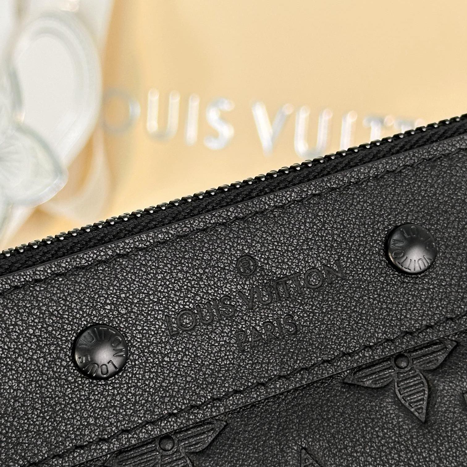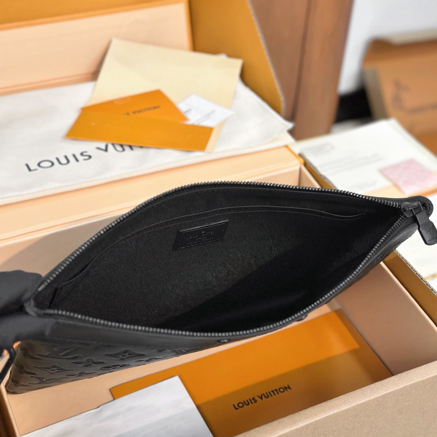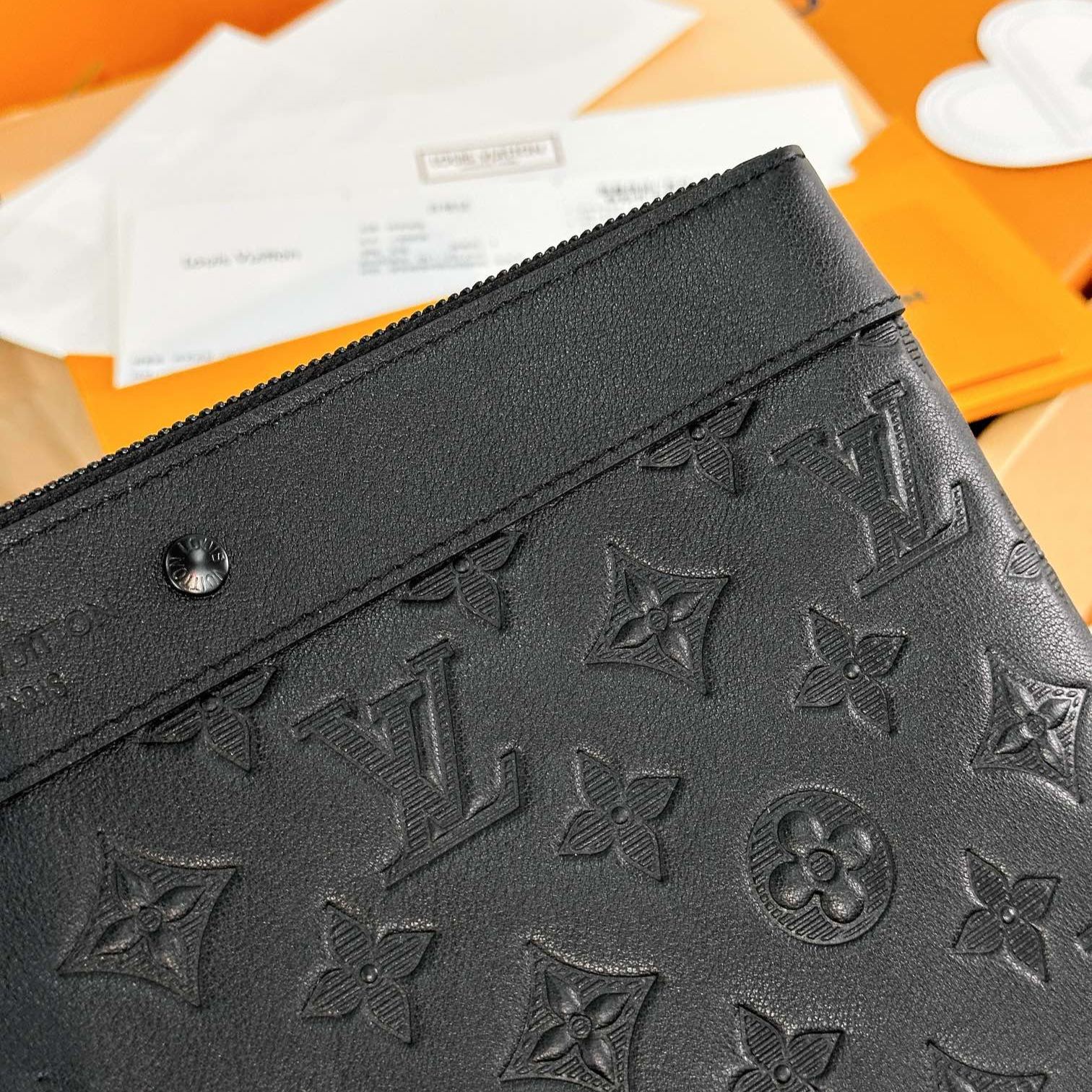 ルイ・ヴィトンのモダンなPochette To-Goハンドバッグ。21.5x1x30cmのスリムサイズに、スマートフォンや小物を収納可能な大容量設計。Monogram Shadowの圧紋牛皮革を使用し、上質な牛皮革内張りとメタルハードウェアで仕上げ。取り外し可能なレザーリストストラップ付きで、手持ちからリストバッグまで2WAYスタイルが可能。メインコンコンパートメントと内ポケットで実用的な収納を実現した、日常使いに最適なアイテムです。