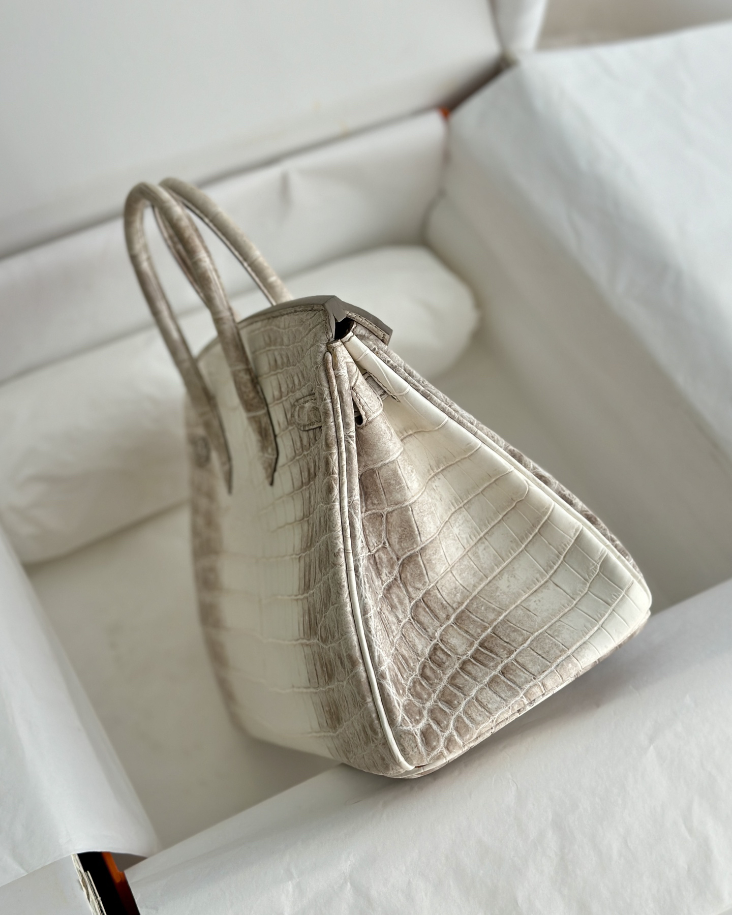 このHERMÈS Birkin 25は、最高級のマット仕上げのヒマラヤンクロコダイルレザーを使用し、その希少性と洗練されたデザインで知られています。職人による完全な手縫い製法で仕上げられ、シームレスな縫い目と完璧なプロポーションが特徴です。シルバーまたはゴールドのハードウェアが上品なコントラストを生み、内側には実用的なポケットを備えています。コレクターにとっての究極のアイテムであり、ラグジュアリーの頂点を象徴する逸品です。