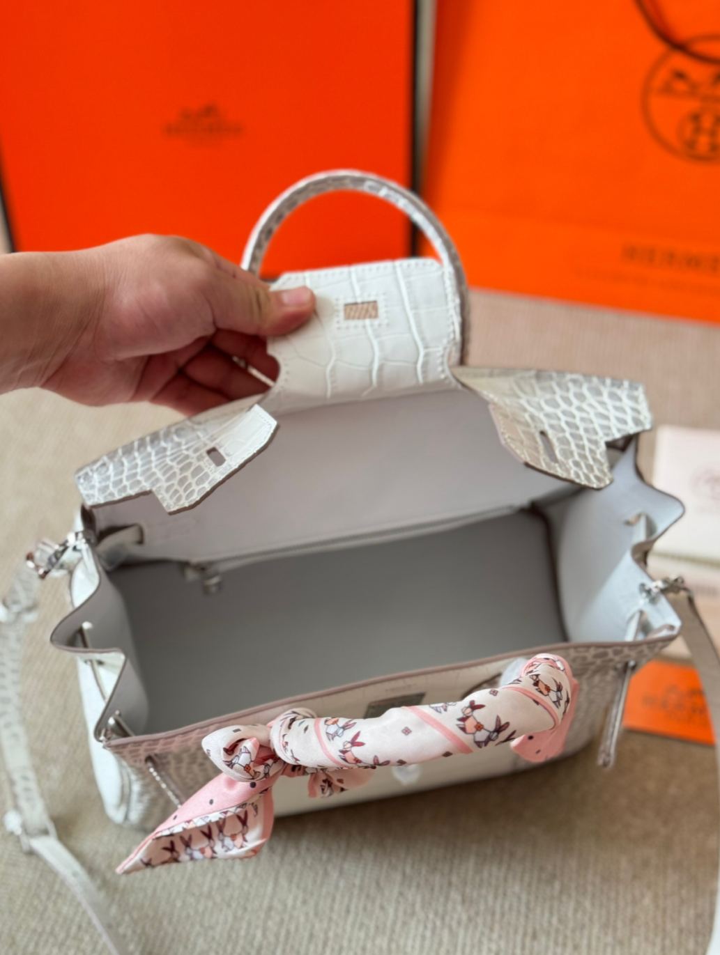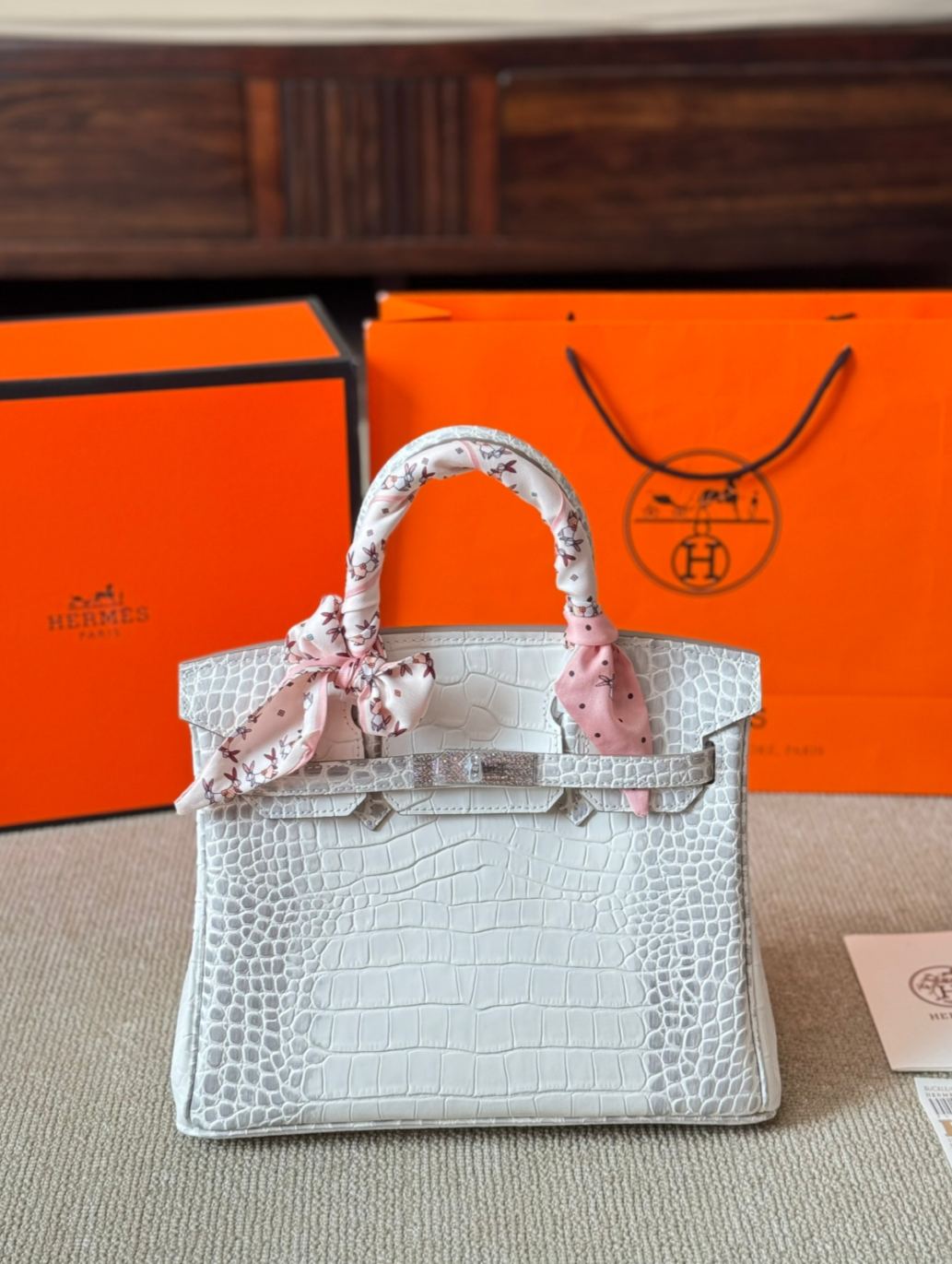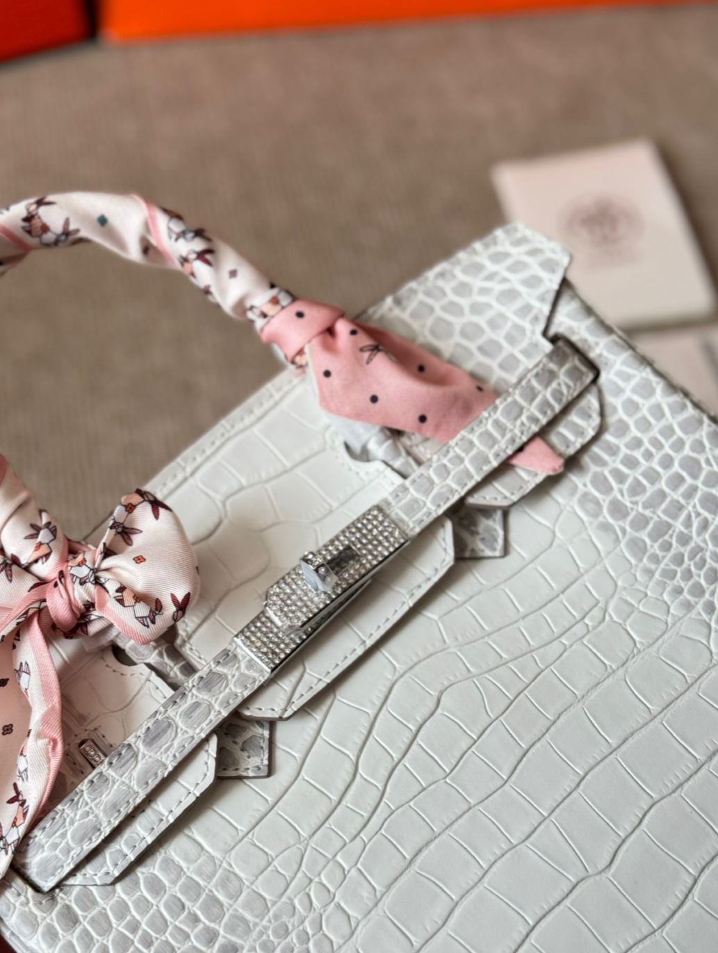 ニロワン(ナイルワニ)の希少な白革を特殊染色技術で仕上げた「ヒマラヤ」カラーの限定モデル。ダイヤモンドセッティングされた18Kホワイトゴールド金具と、完全ハンドメイドの双針縫製技法が特徴。30x22x16cmのスタンダードサイズで、内側にはマッチングレザーのポケットを2箇所配置