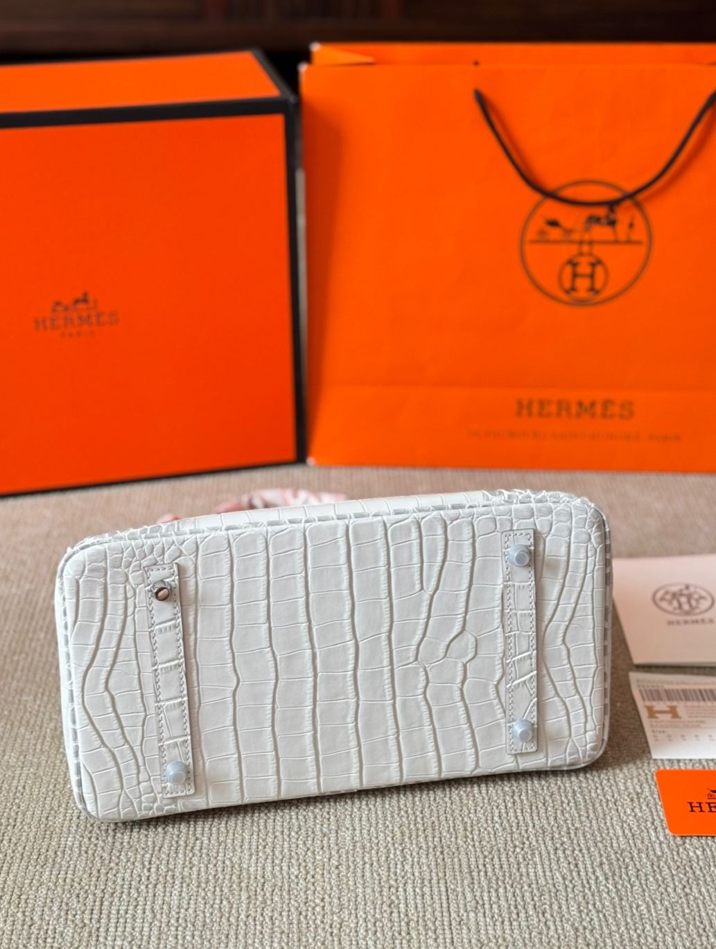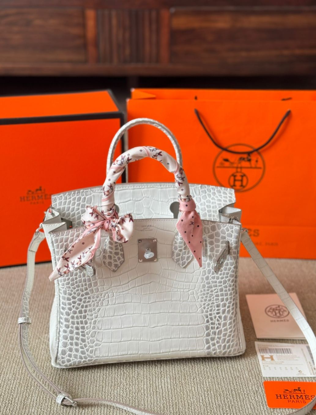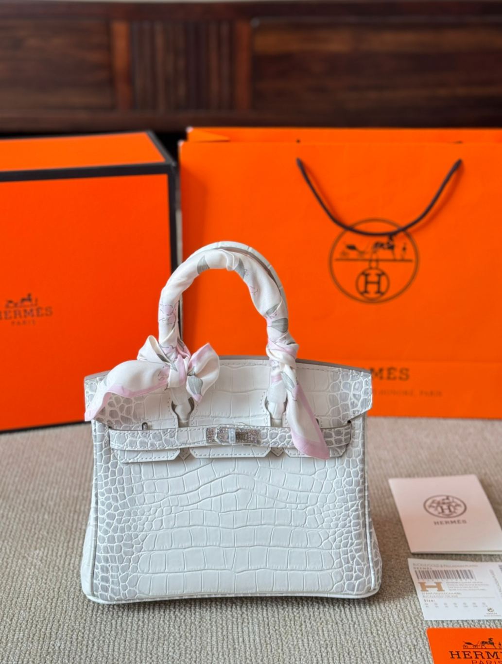 ニロワン(ナイルワニ)の希少な白革を特殊染色技術で仕上げた「ヒマラヤ」カラーの限定モデル。ダイヤモンドセッティングされた18Kホワイトゴールド金具と、完全ハンドメイドの双針縫製技法が特徴。30x22x16cmのスタンダードサイズで、内側にはマッチングレザーのポケットを2箇所配置